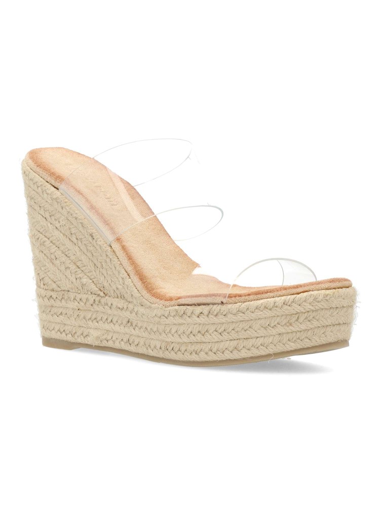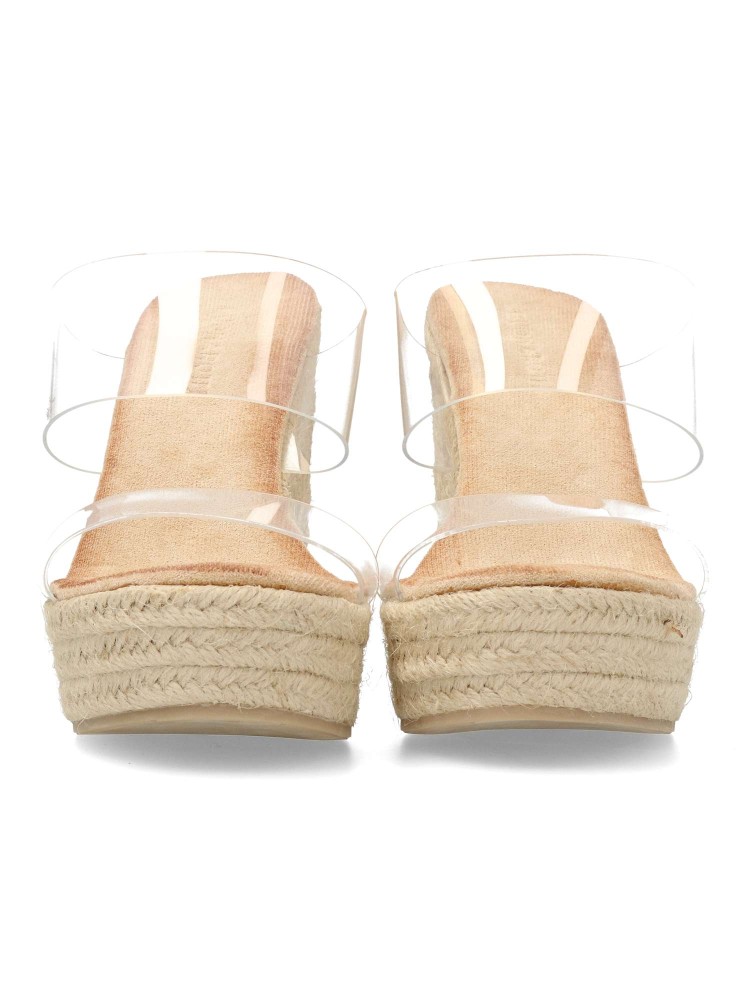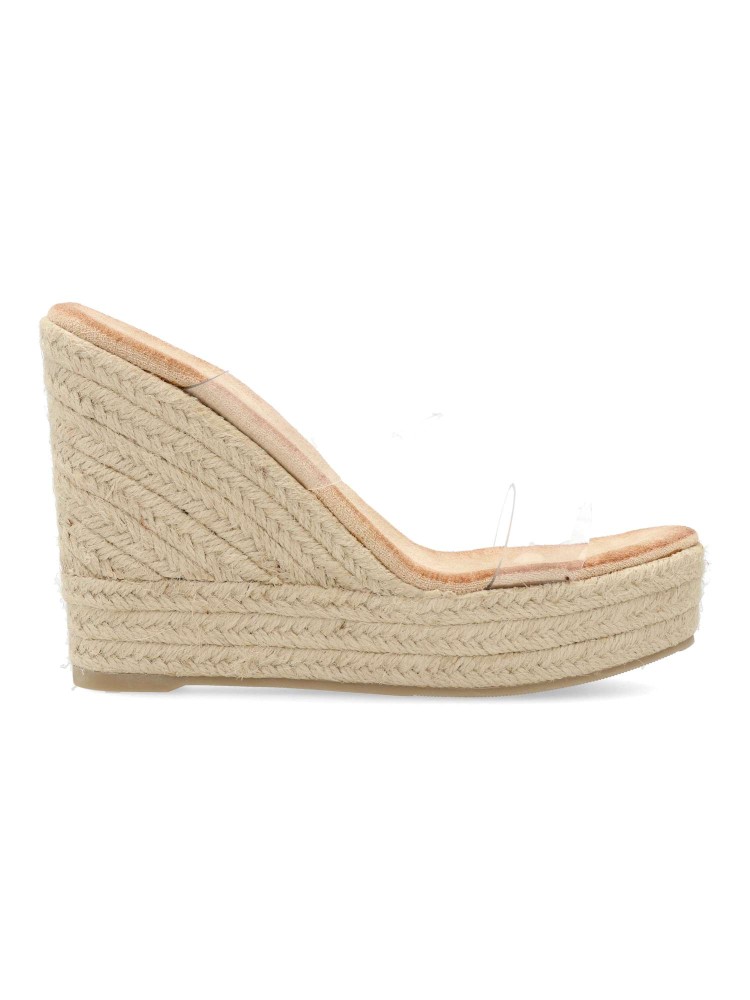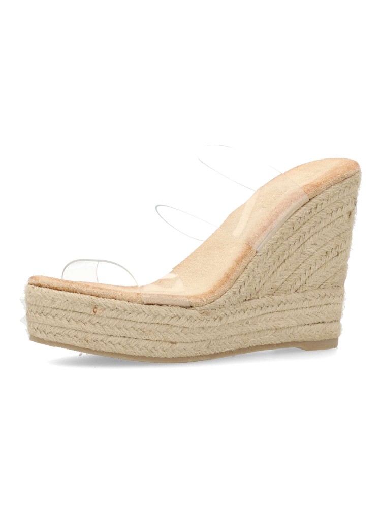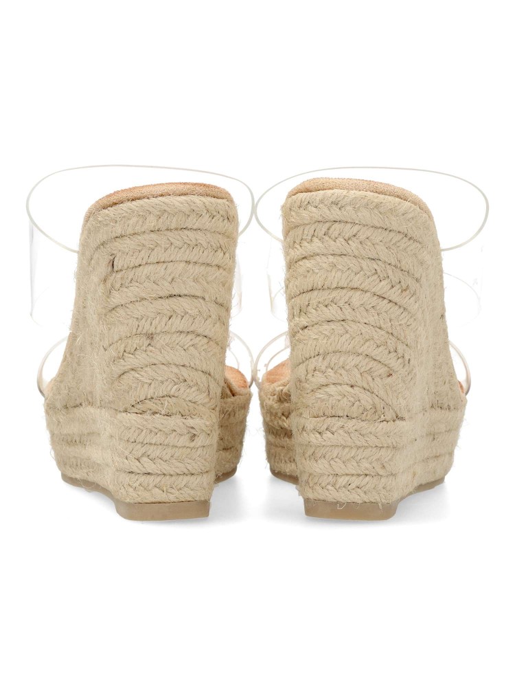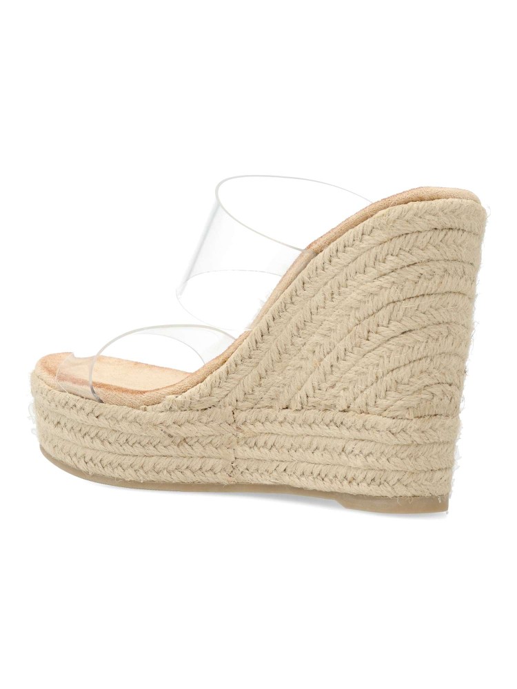 Sandalia alpargata de mujer, con doble pala de goma transparente. Suela de yute sobre goma. Planta acolchada. Altura cuña 11 cm. Plataforma de 3,5 cm. Color beige. Esparteña con diseño original y versátil, ideal para combinar con tus looks de verano.