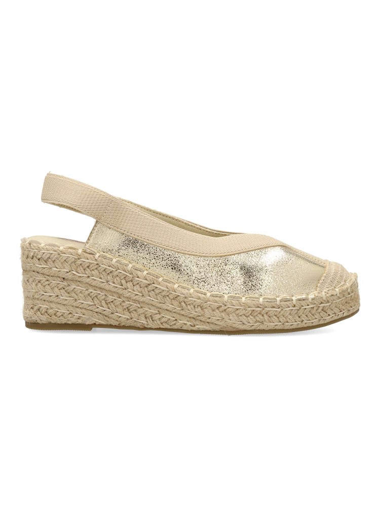 Sandalia alpargata confort de mujer. Fabricada en piel sintética metalizada y textil, con suela de yute sobre goma. Planta acolchada. Color oro. Cuña de 5,5 cm. Una esparteña versátil y cómoda que no te querrás quitar este verano.