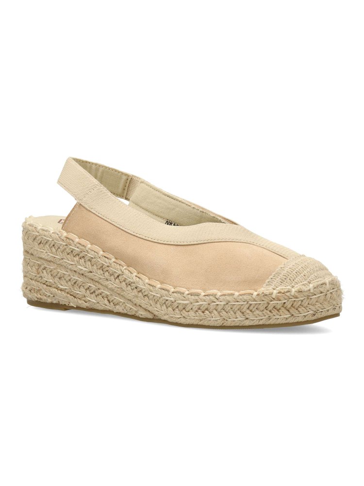 Sandalia alpargata confort de mujer. Fabricada en piel sintética y textil, con suela de yute sobre goma. Planta acolchada. Color beige. Cuña de 5,5 cm. Una esparteña versátil y cómoda que no te querrás quitar este verano.