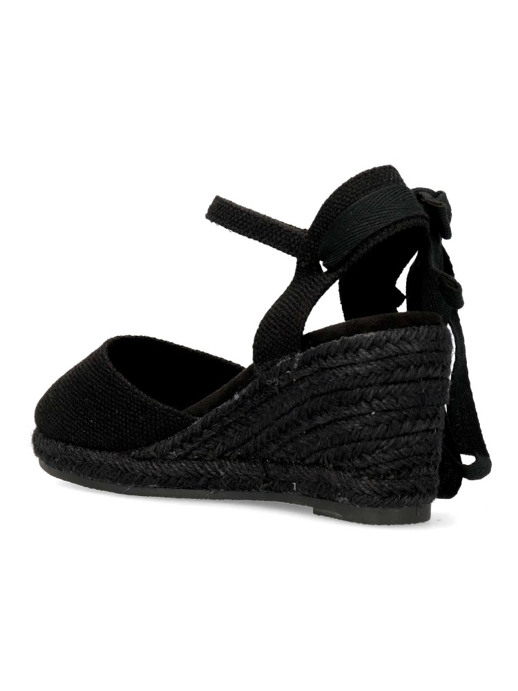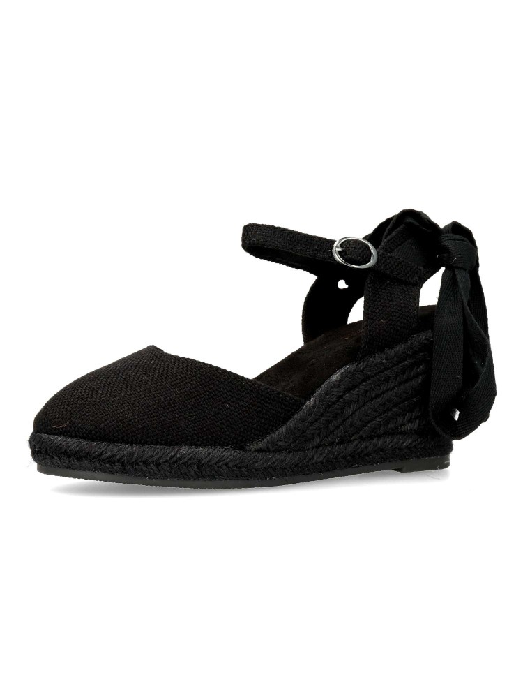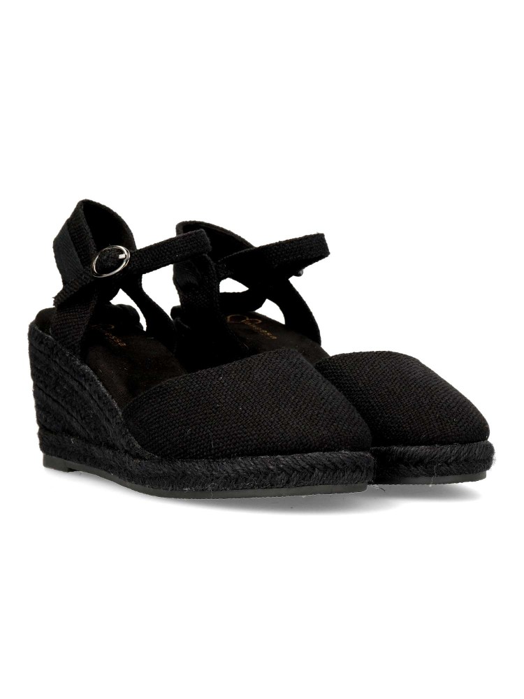 Sandalia valenciana de mujer, con cierre de hebilla y cintas. Alpargata cómoda, fabricada en textil, con suela de yute al tono sobre goma. Planta acolchada. Color negro. Cuña de 7 cm. Máximo confort en una sandalia de esparto que no te querrás quitar.