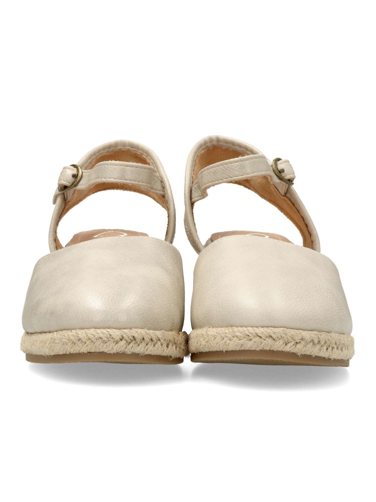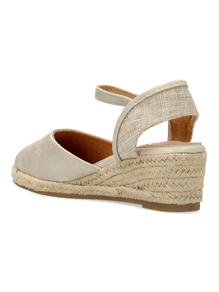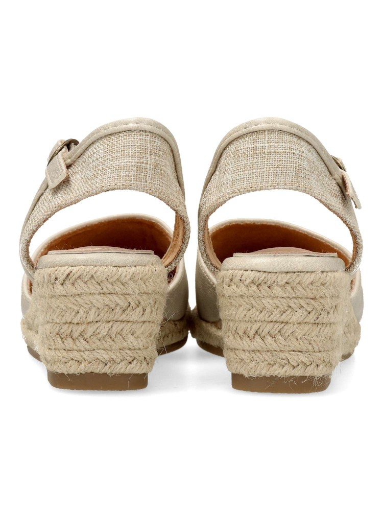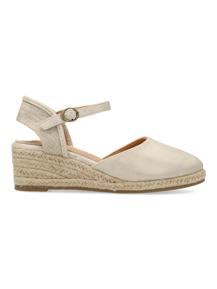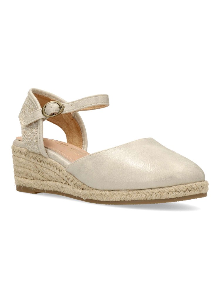 Sandalia valenciana mujer, con cierre de hebilla. Alpargata cómoda, fabricada en piel sintética, con suela de yute sobre goma. Planta de piel acolchada. Color platino. Pequeña cuña de 5 cm. Máximo confort en una sandalia de esparto que no pasará de moda.