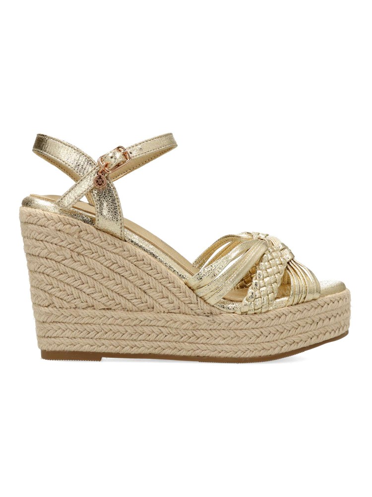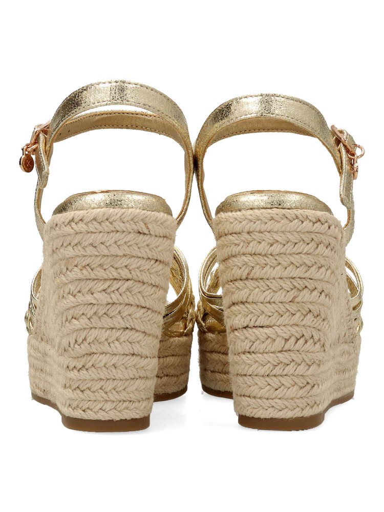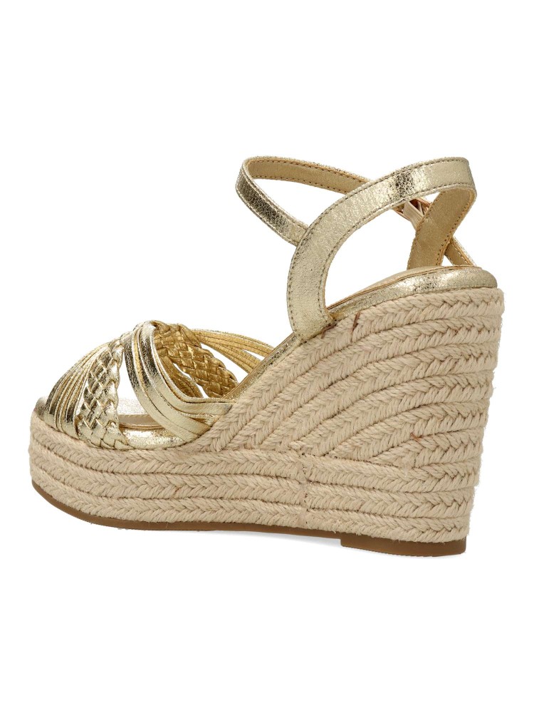 Sandalia alpargata de mujer, con tira al tobillo y cierre de hebilla. Diseño de tiras cruzadas, fabricado en material sintético metalizado. Planta acolchada. Cuña con plataforma de yute de 9 cm y suela antideslizante. Certificado vegano.