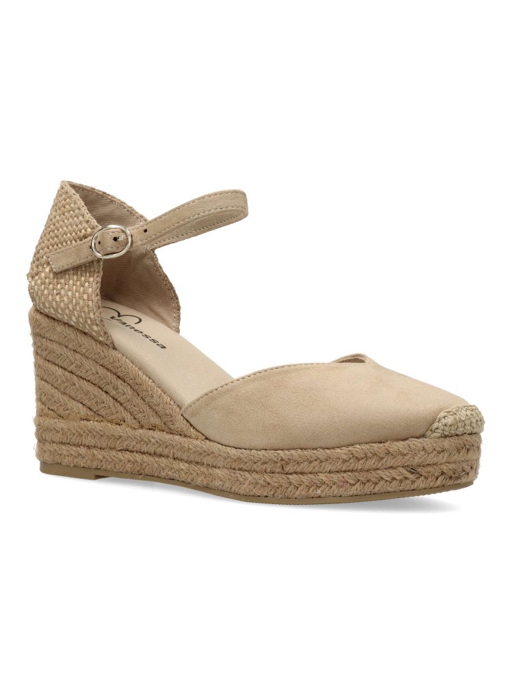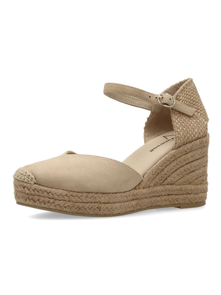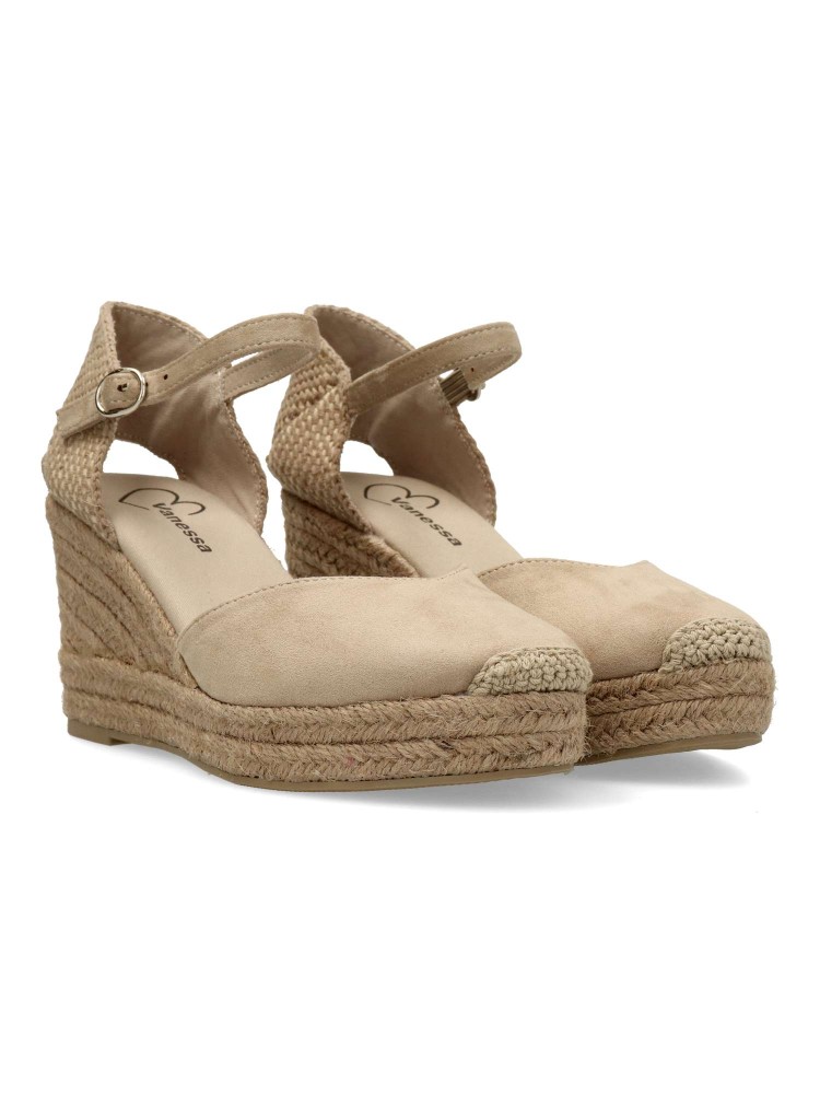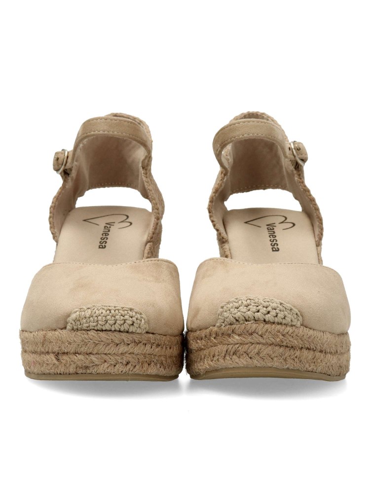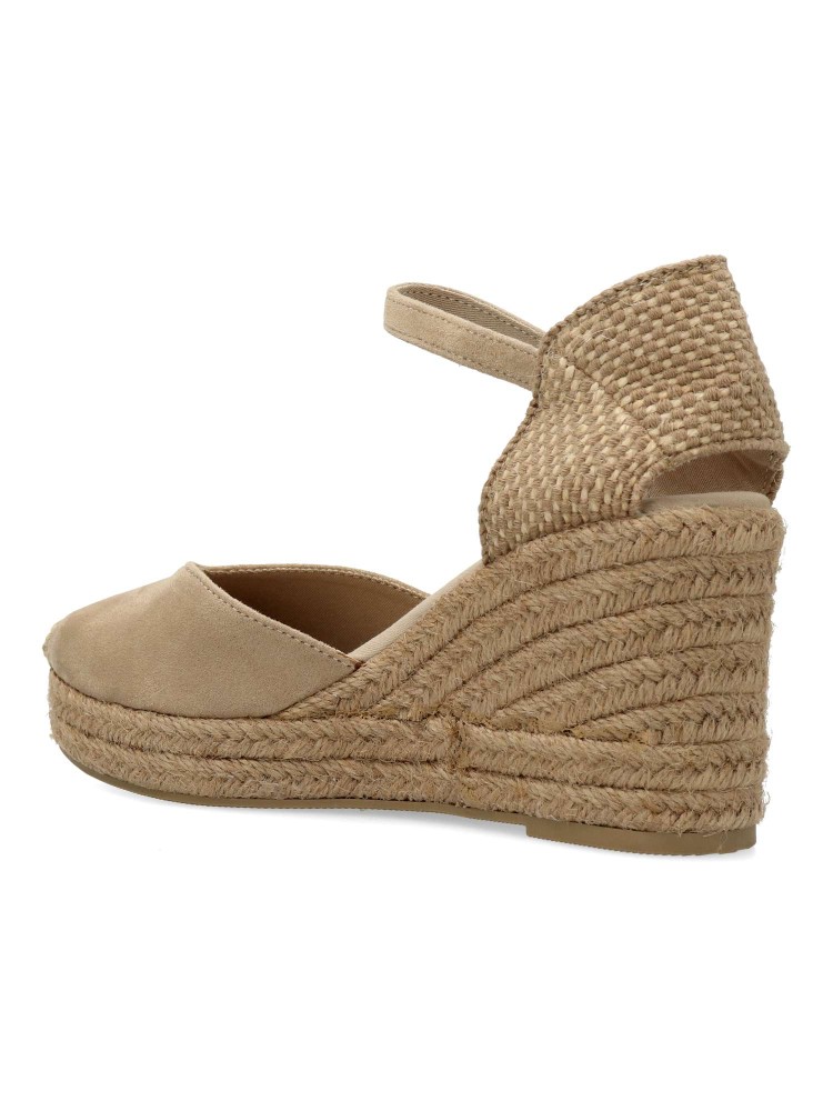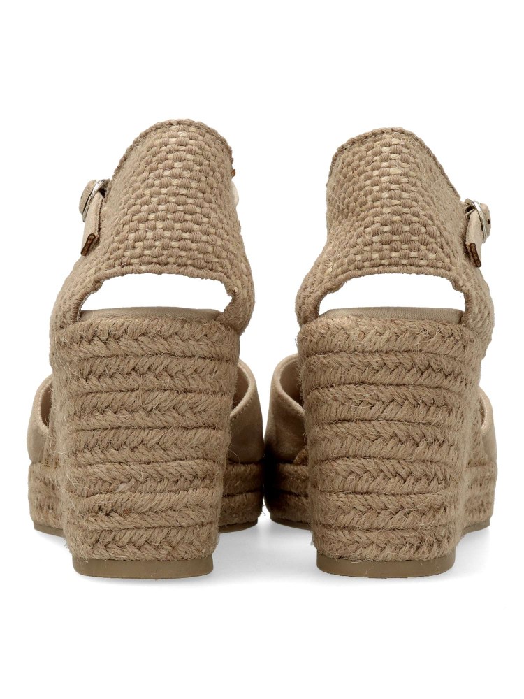 Sandalia esparteña yute de mujer. Cierre de hebilla al tobillo. Alpargata fabricada en piel sintética antelina, con suela de yute sobre goma. Disponible en color taupe. Cuña de 7,5 cm. Valenciana clásica para combinar con tus looks de temporada.