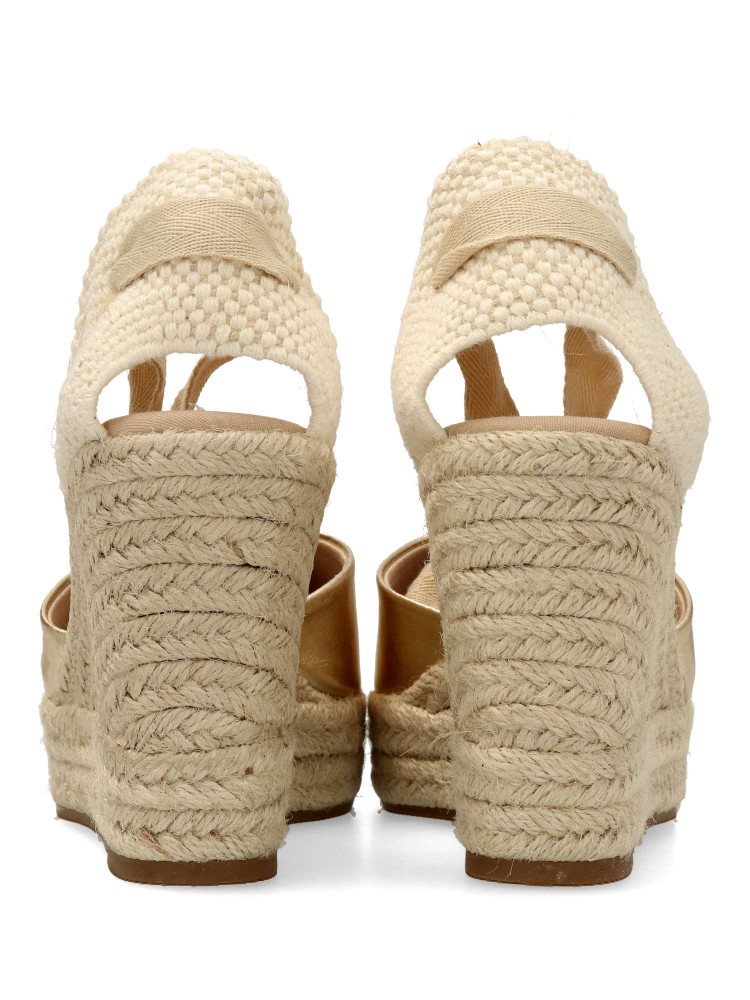 Sandalia esparteña yute de mujer. Cierre mediante cintas al tobillo. Alpargata fabricada en piel sintética, con suela de yute sobre goma. Disponible en color oro. Cuña de 9,5 cm. Plataforma 3 cm. Valenciana clásica ideal para ferias y en tu día a día.