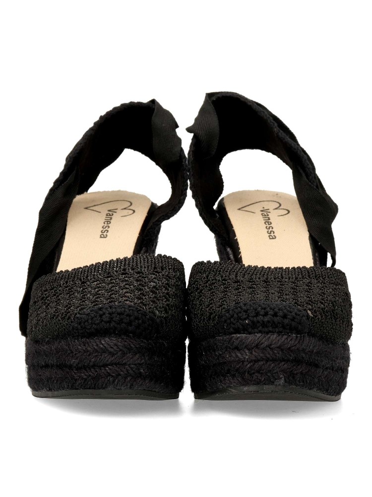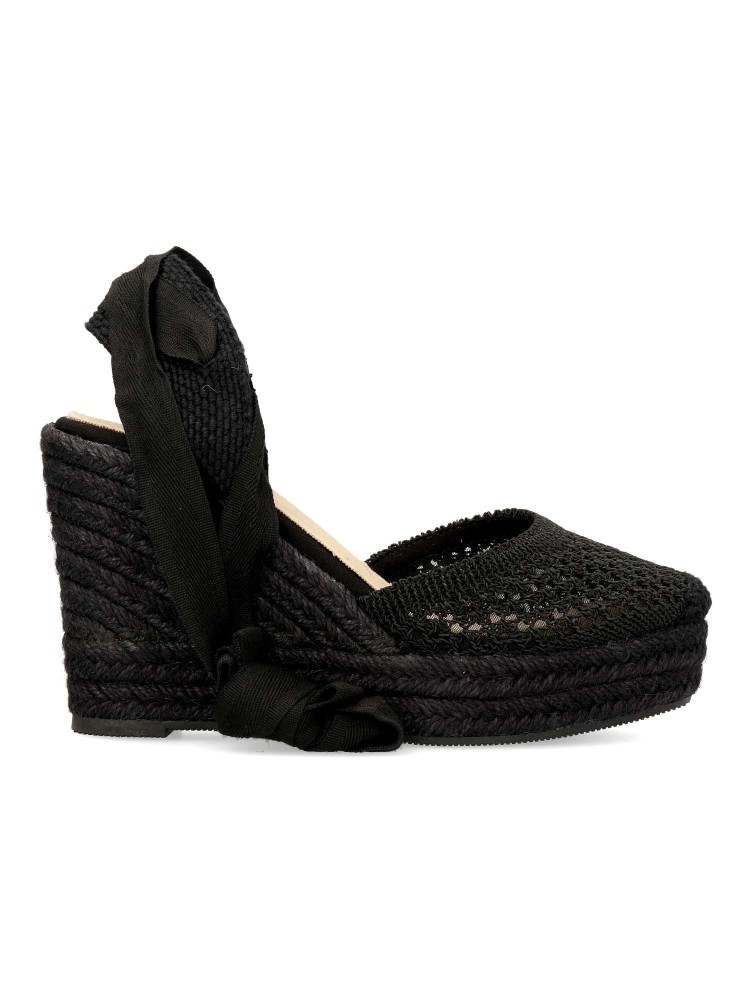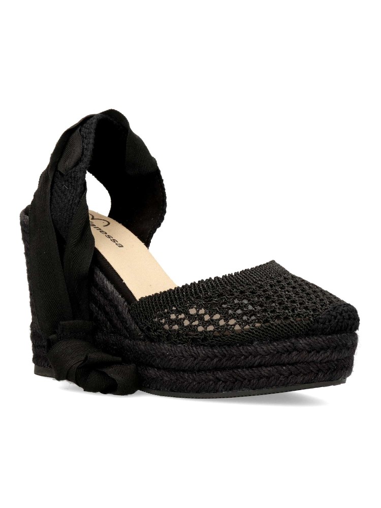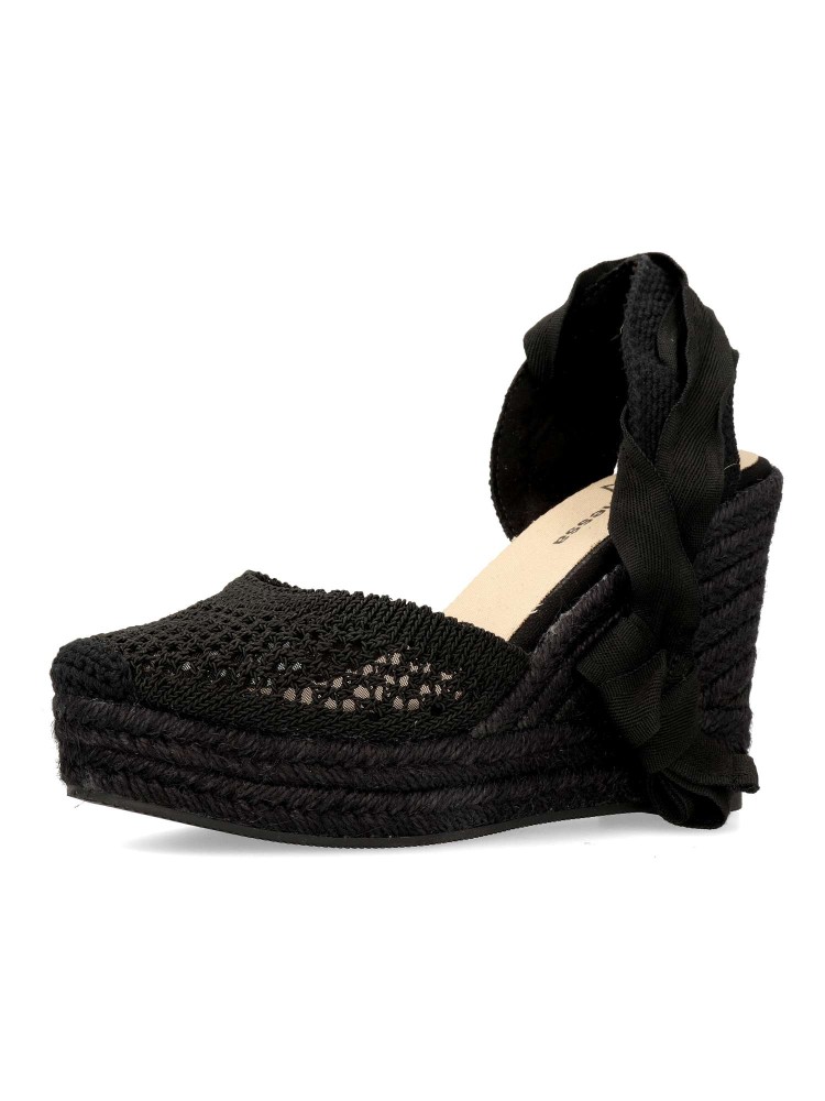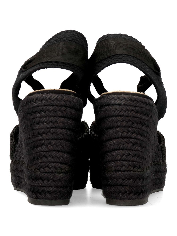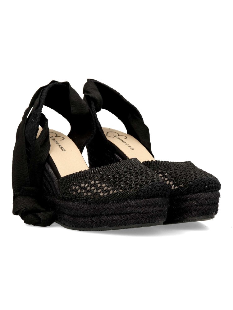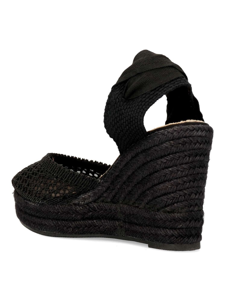 Sandalia esparteña yute de mujer. Cierre mediante cintas al tobillo. Alpargatas fabricadas con cuerdas entrelazadas y suela de yute sobre goma. Color negro con yute al tono. Cuña de 9,5 cm. Valenciana clásica y versátil, ideal con tus outfits de verano.