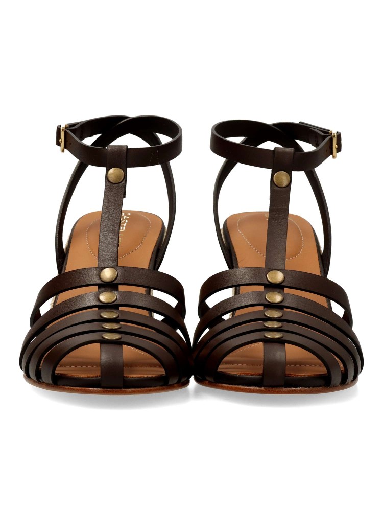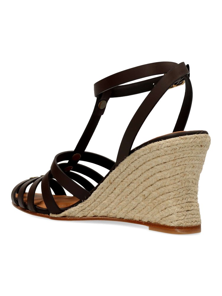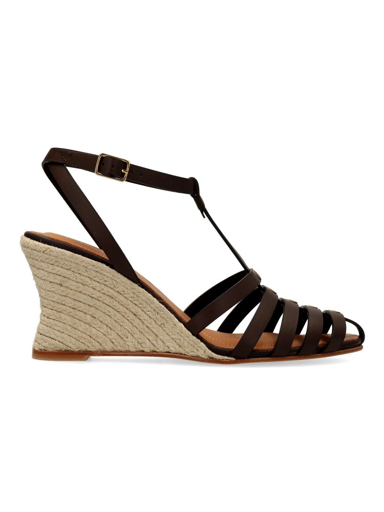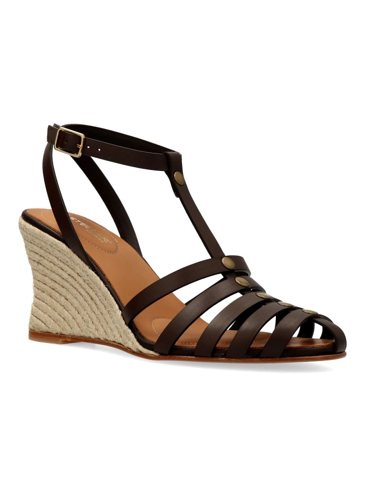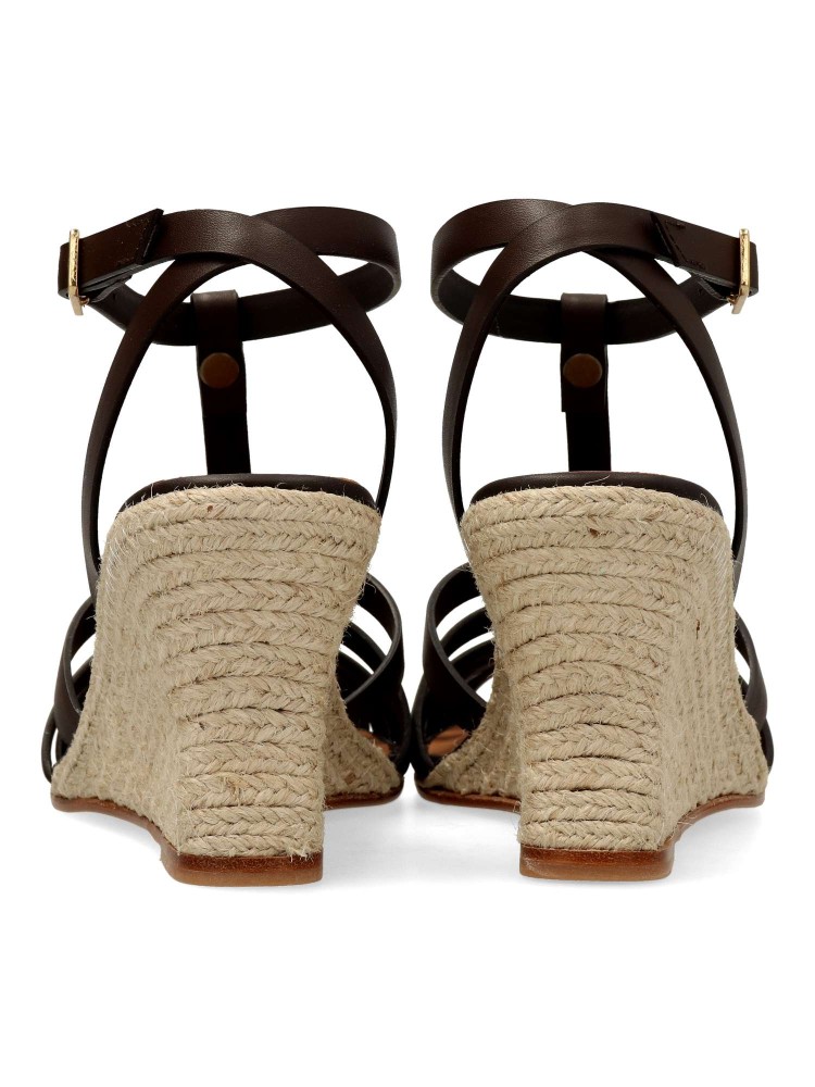 Sandalia alpargata con cierre de hebilla. Esparteña cómoda, fabricada en piel. Planta acolchada. Suela de yute sobre goma. Color chocolate. Cuña de 7,5 cm. 100% artesanal. Diseño y confort, fácil de combinar con tus looks de verano. Hecho en España.