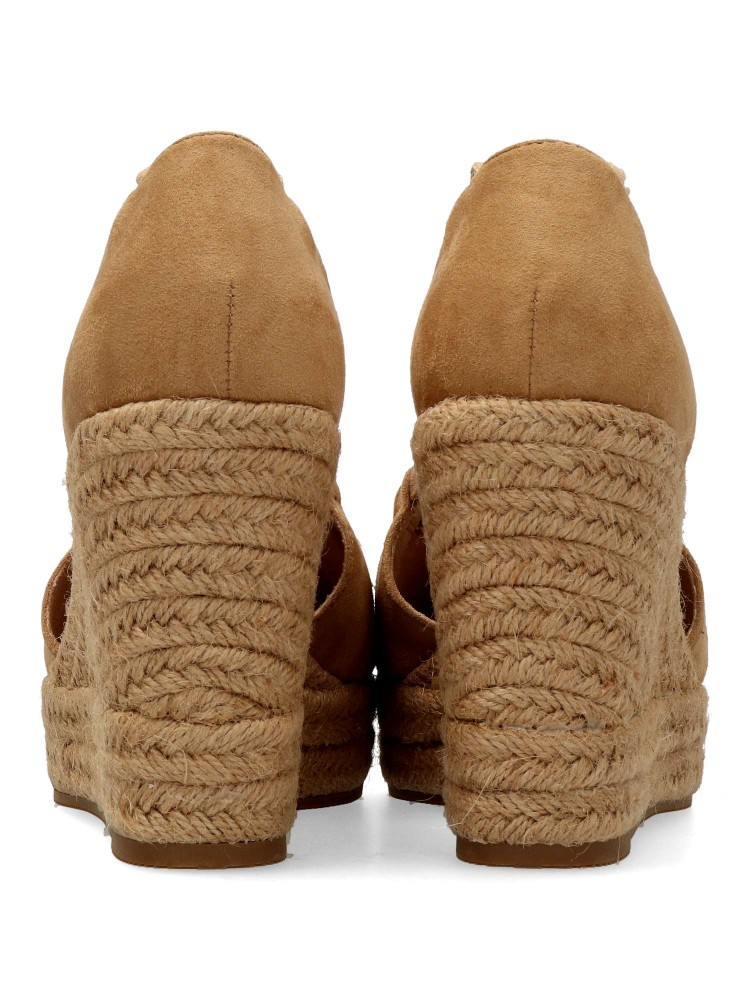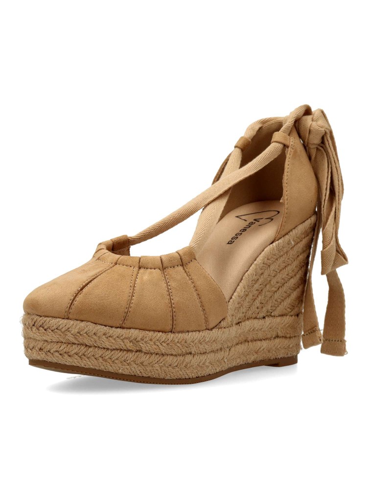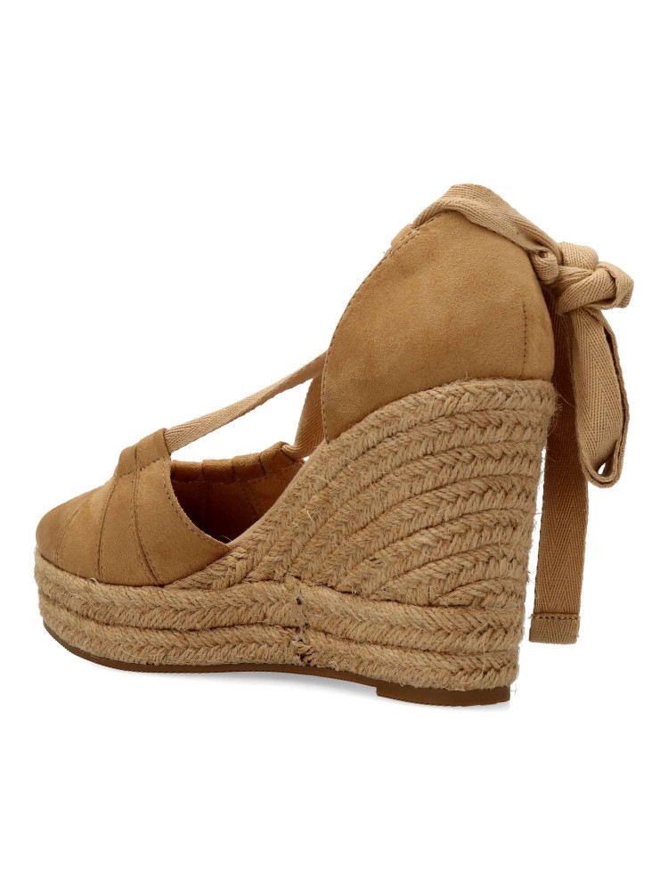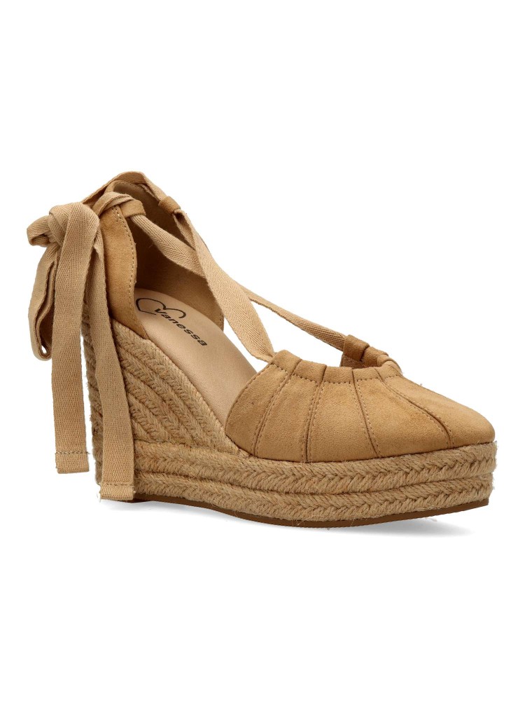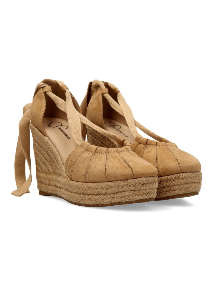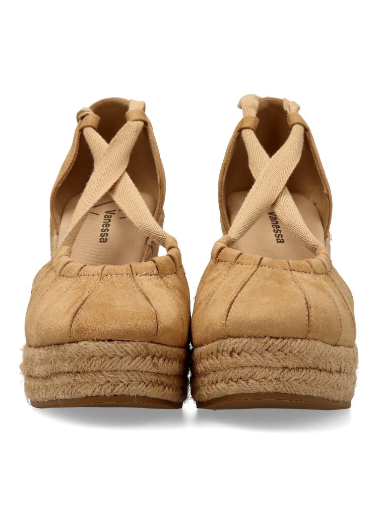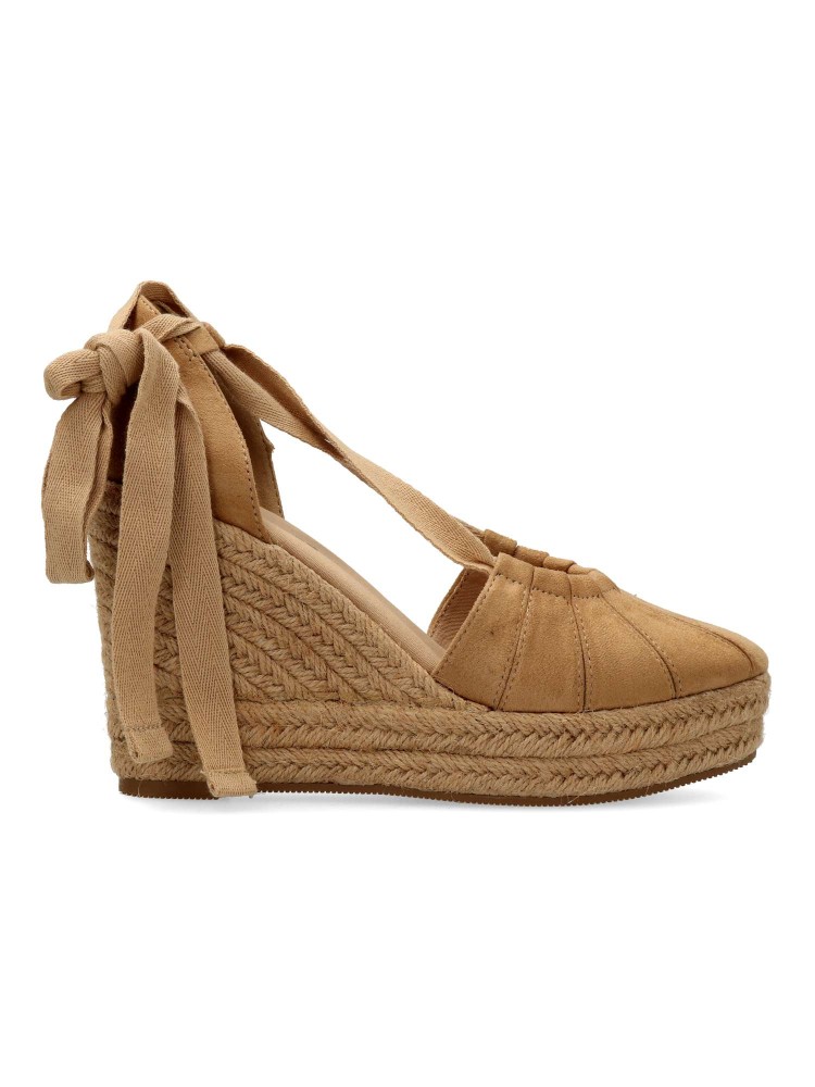 Sandalia esparteña yute de mujer. Cierre mediante cintas al tobillo. Alpargata fabricada en antelina, con suela de yute sobre goma. Color camel. Altura cuña 9,5 cm. y plataforma de 3 cm. Valenciana elegante, fácil de combinar con tus looks de verano.