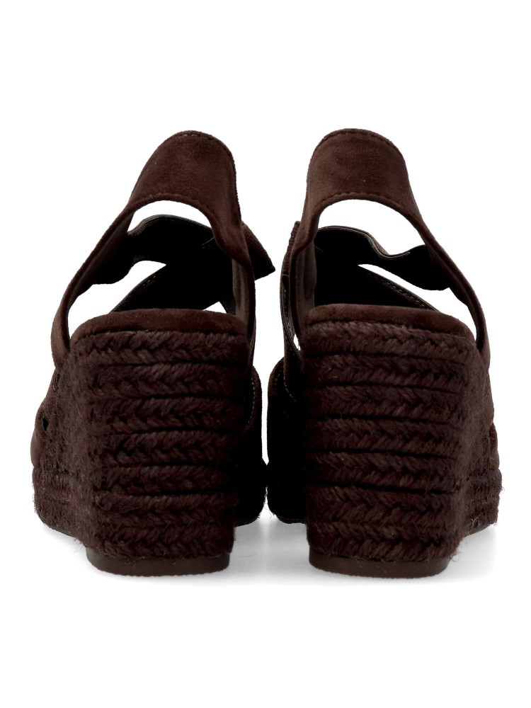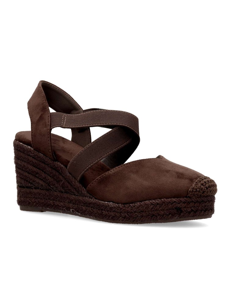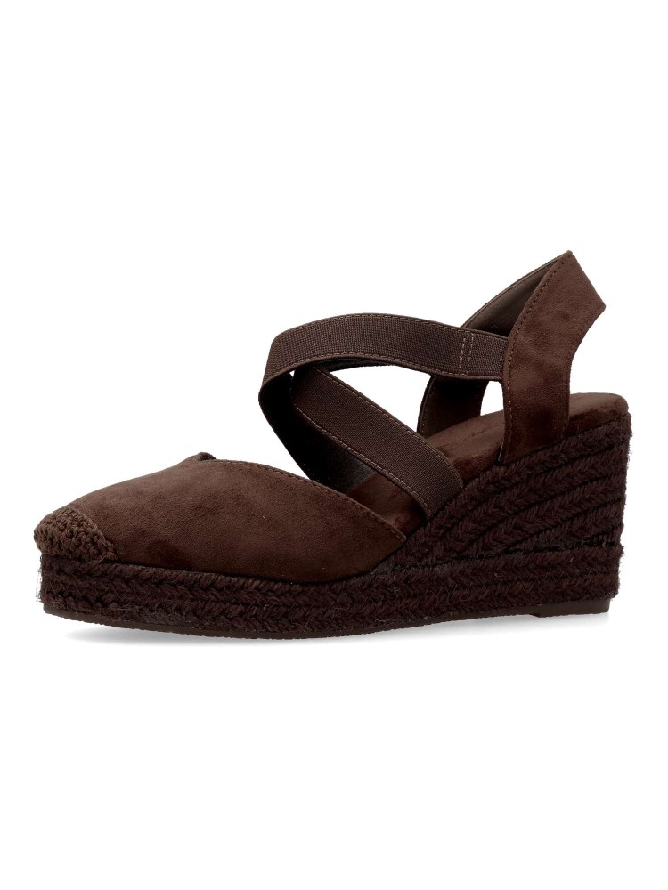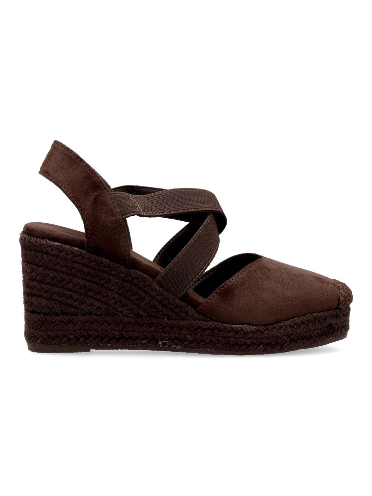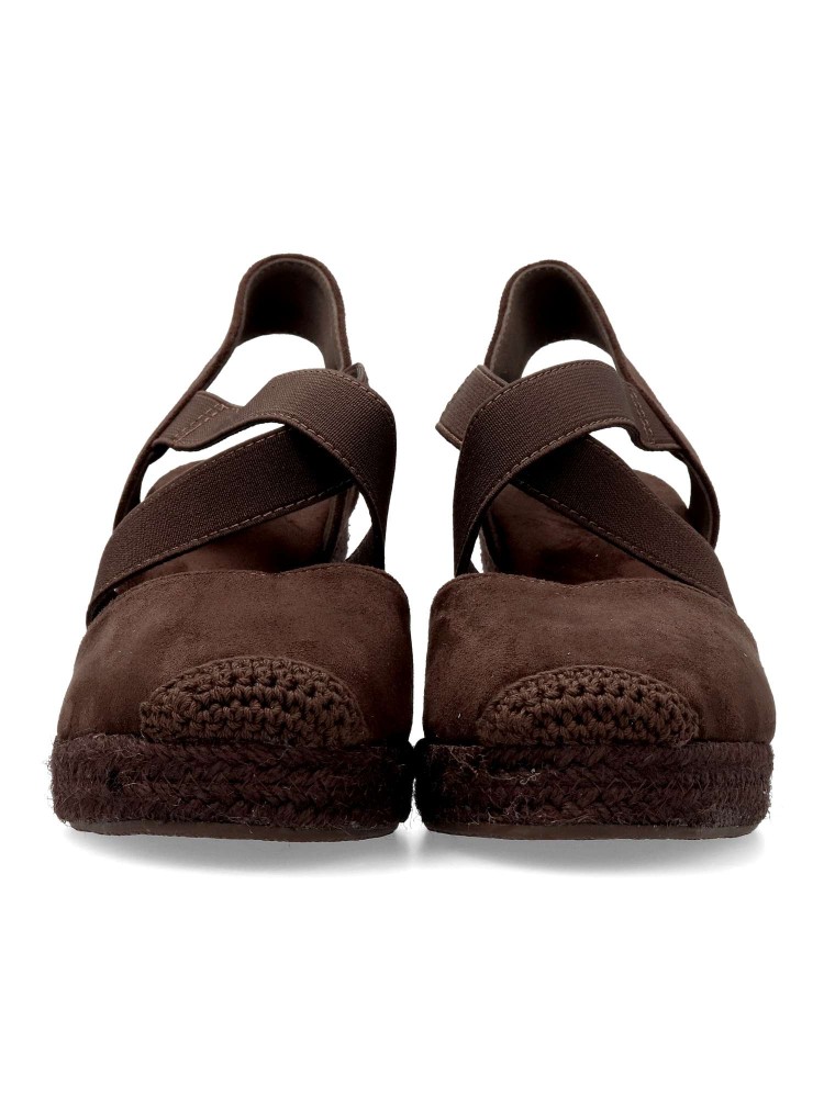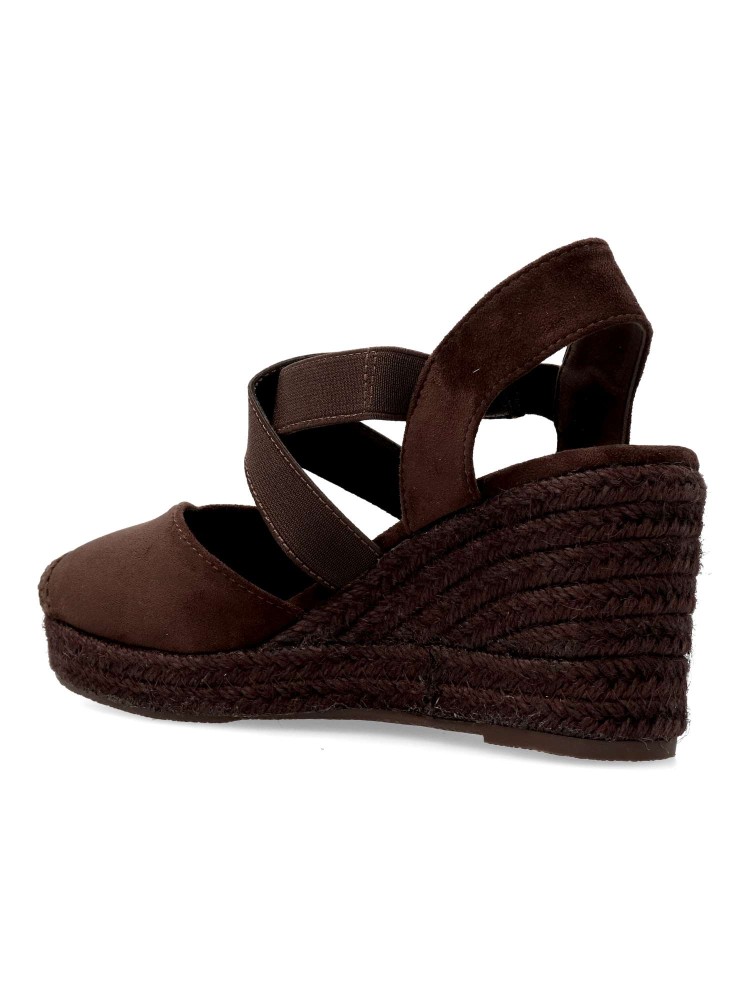 Sandalia alpargata de mujer. Elásticos cruzados al empeine para mejor ajuste al pie. Fabricada en piel sintética, con suela de yute sobre goma. Color marrón. Cuña de 7 cm. Valenciana cómoda, muy fácil de combinar con todos tus looks de temporada.