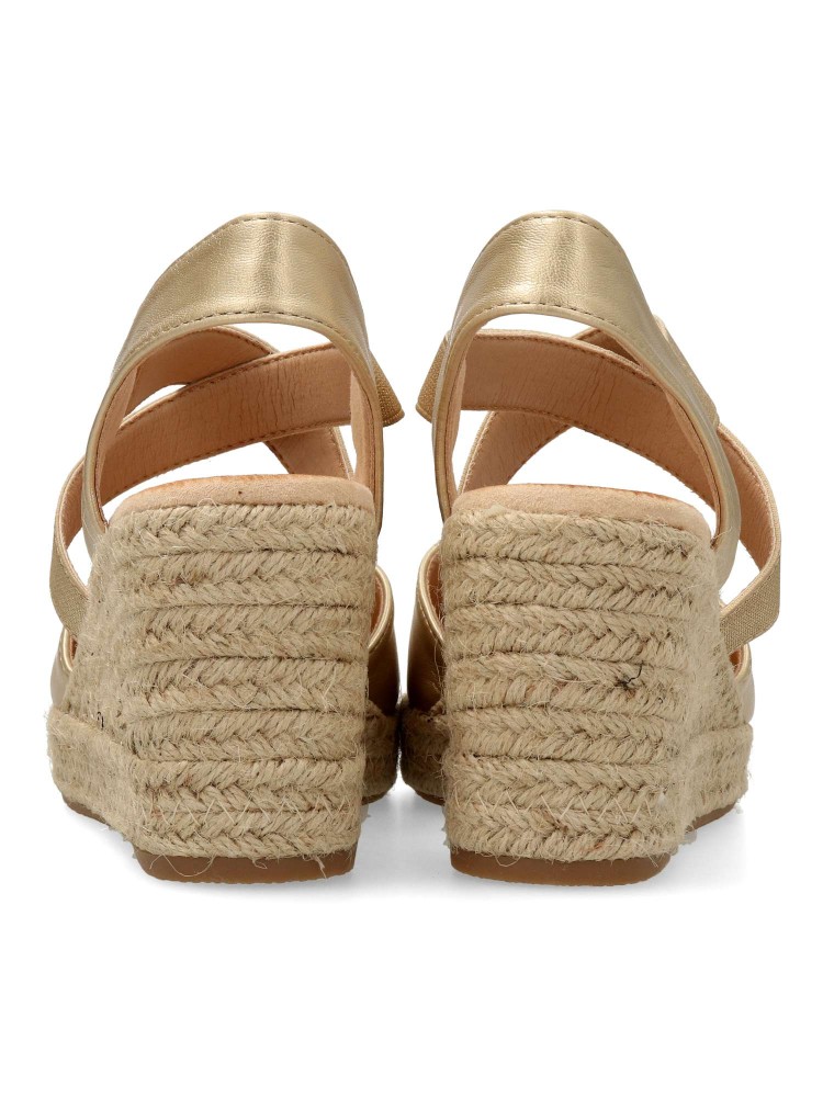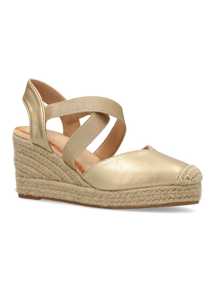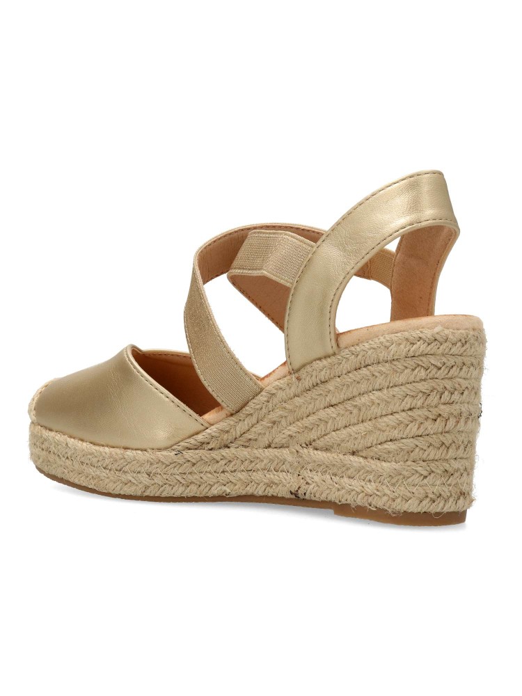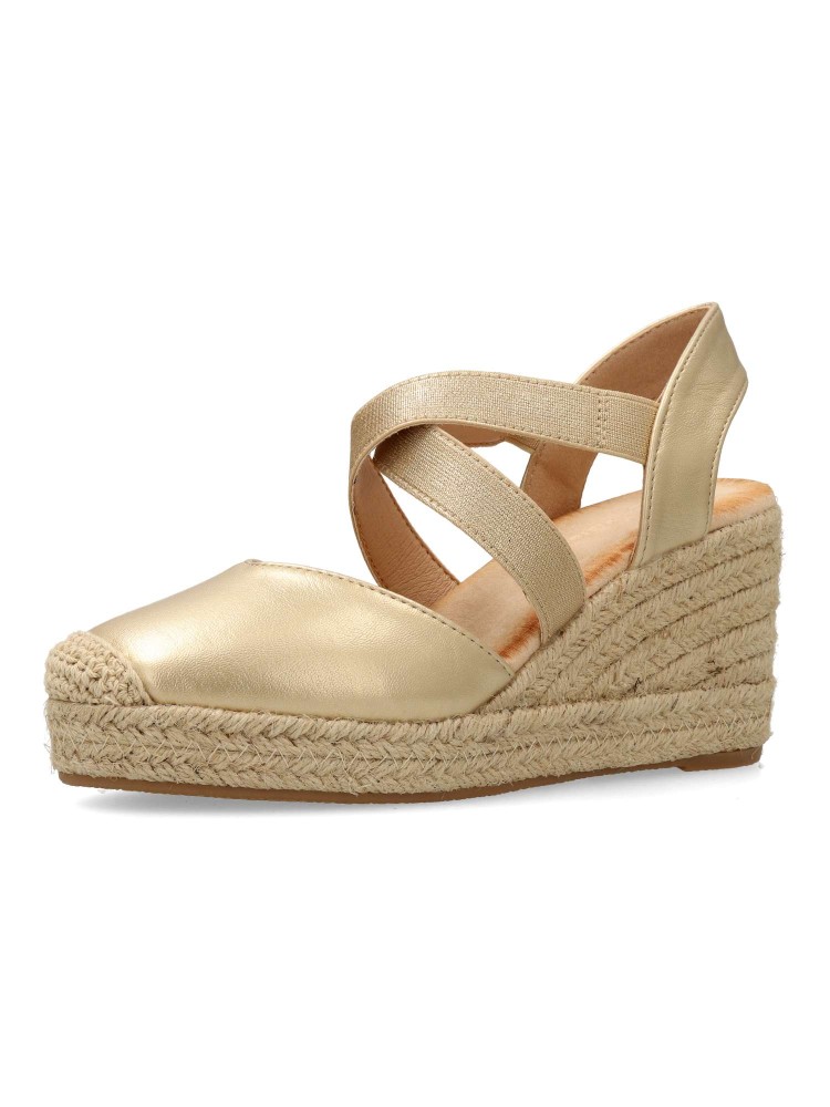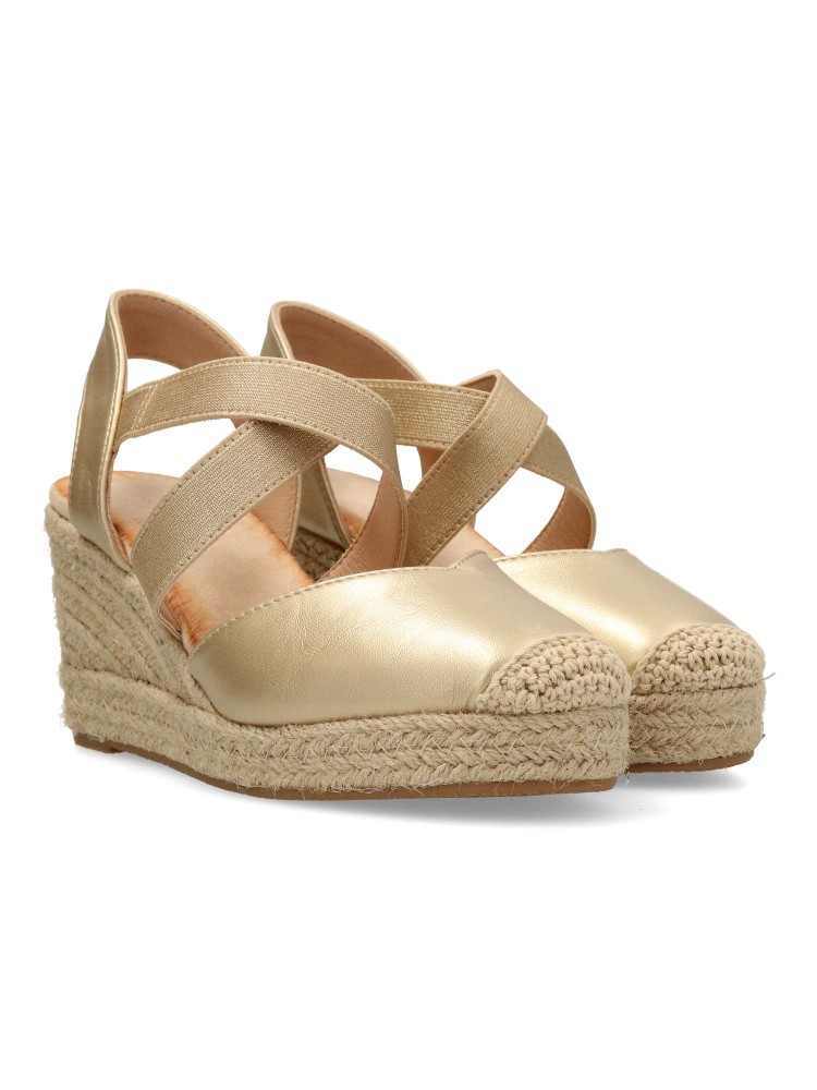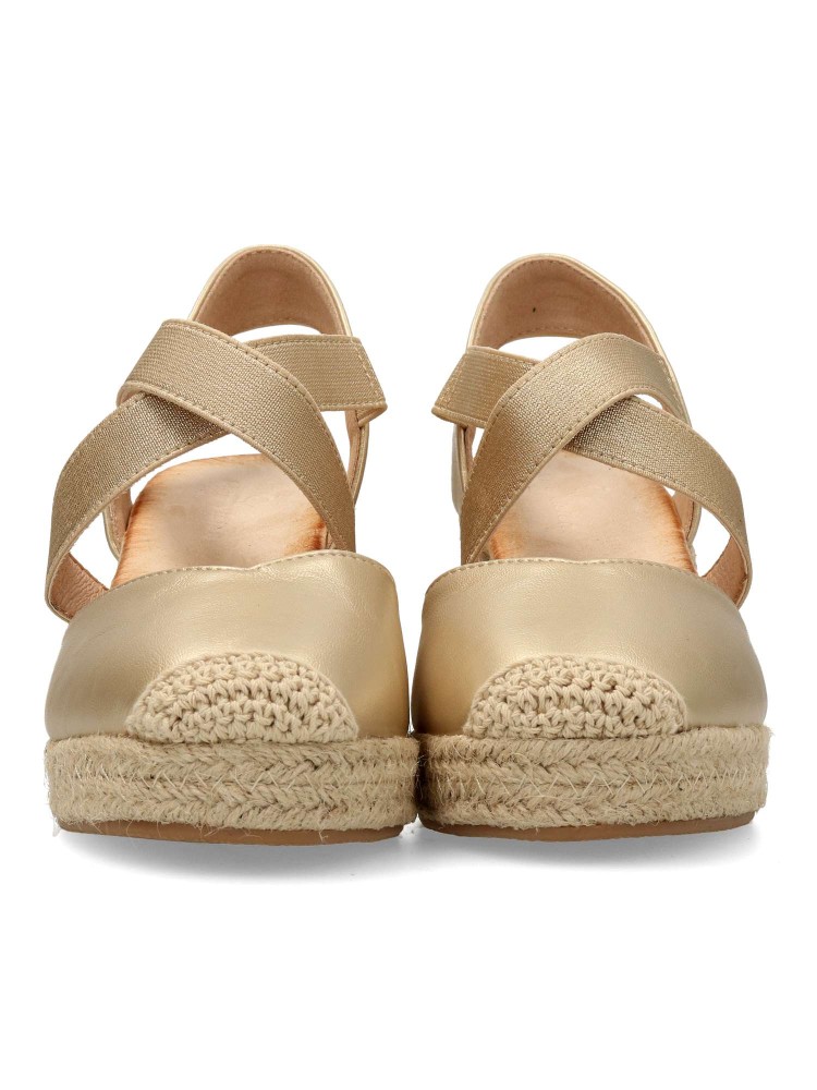 Sandalia alpargata de mujer. Elásticos cruzados al empeine para mejor ajuste al pie. Fabricada en piel sintética, con suela de yute sobre goma. Color oro. Cuña de 7 cm. Valenciana cómoda, muy fácil de combinar con todos tus looks de temporada.