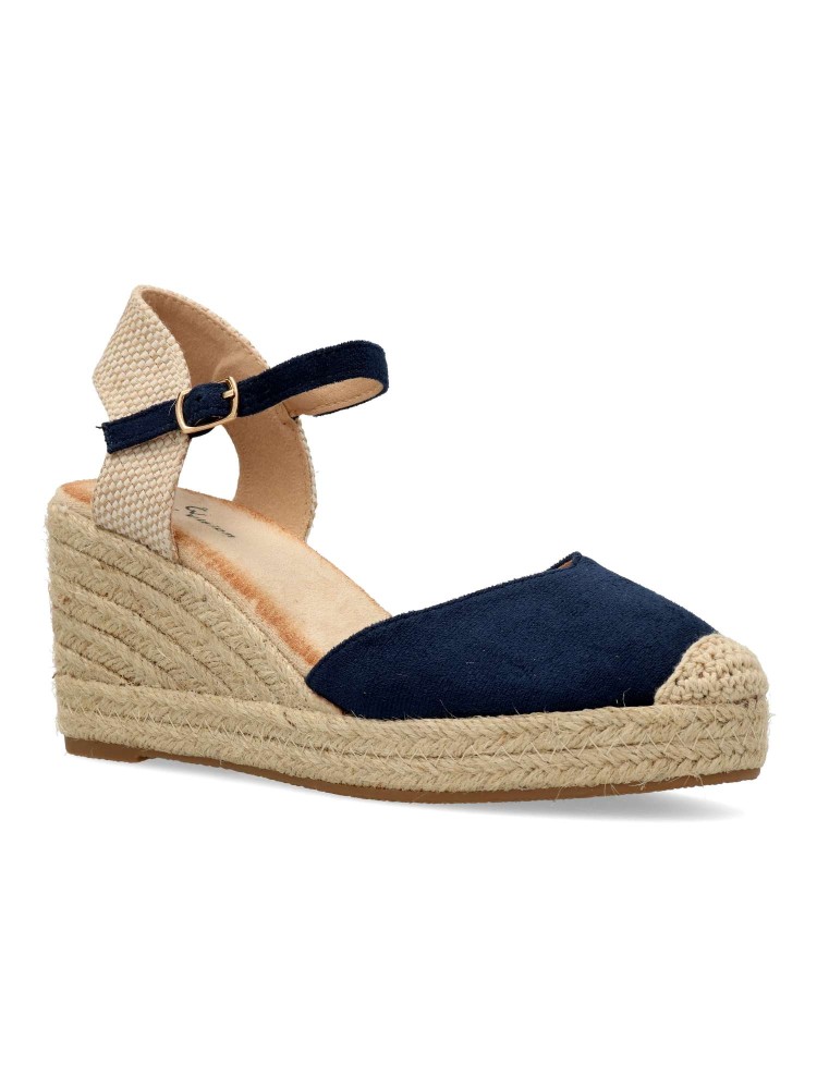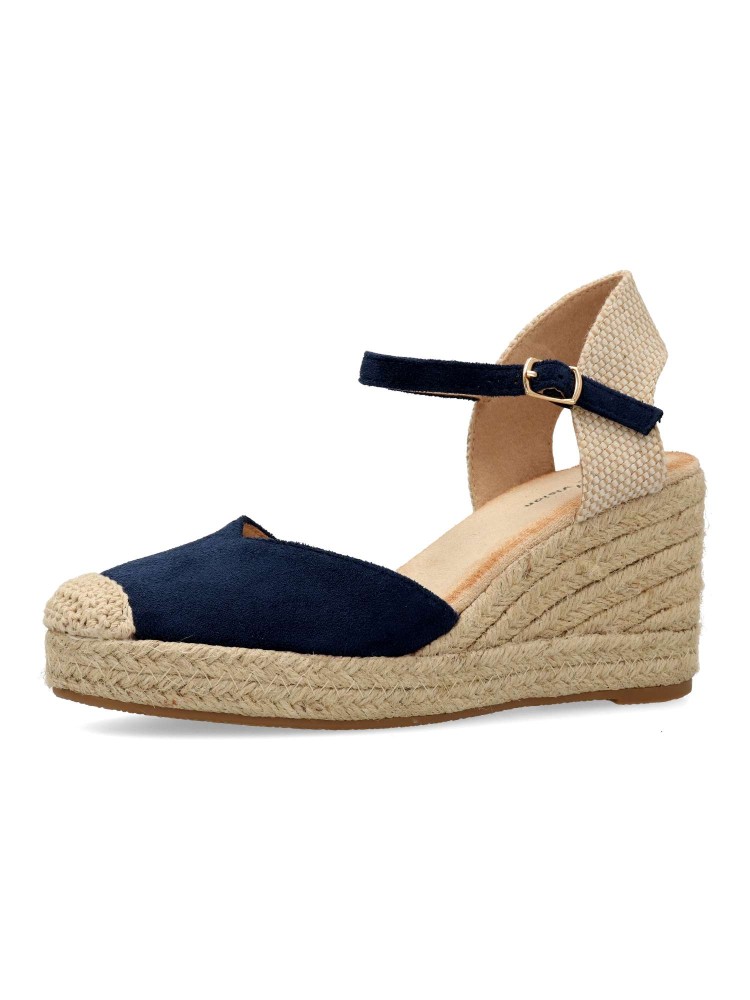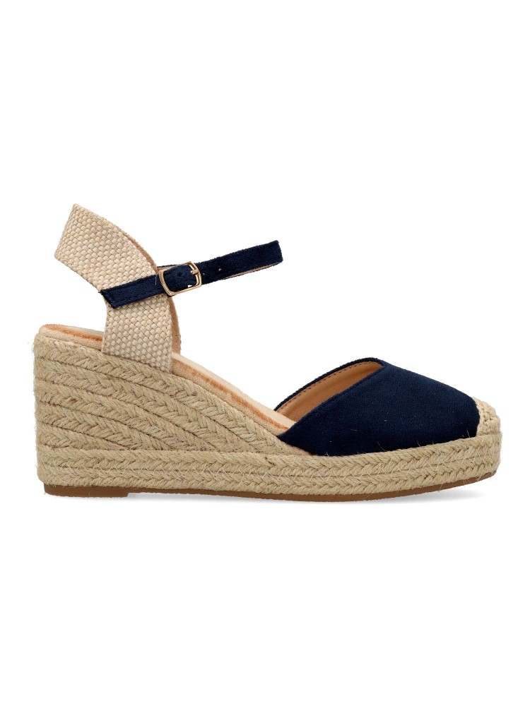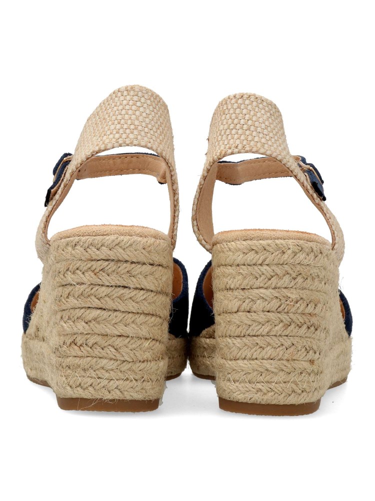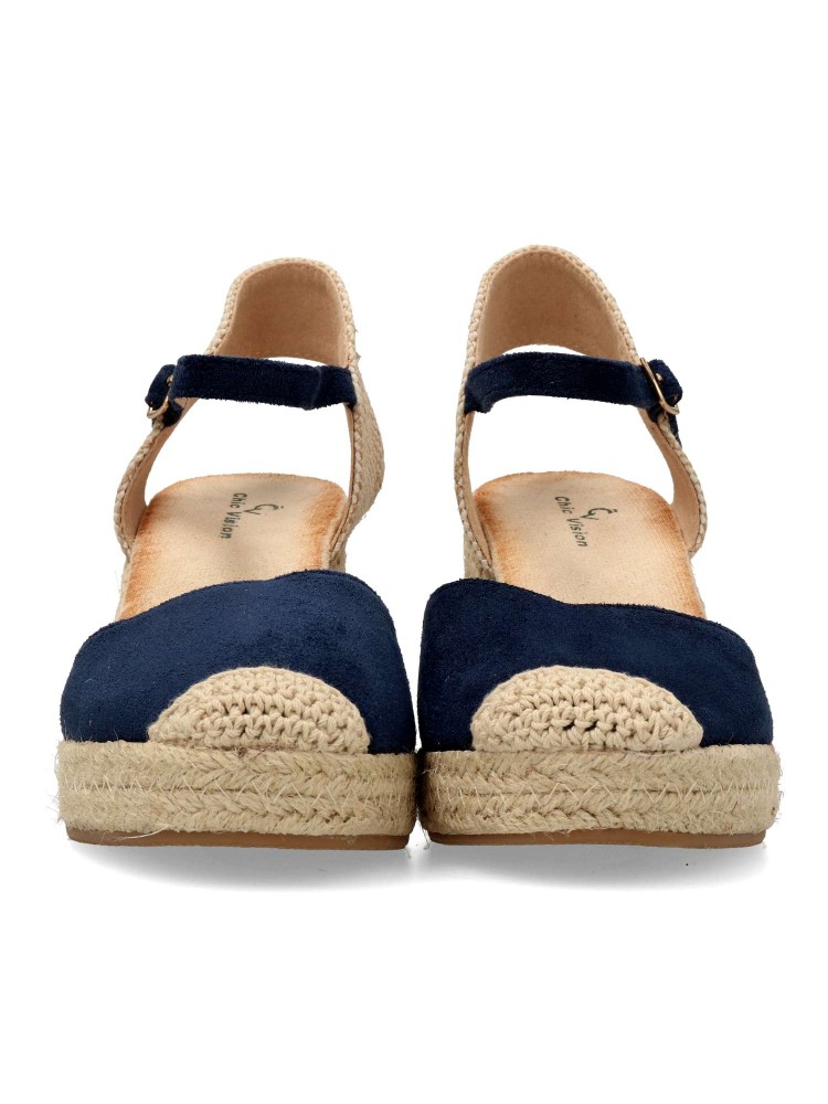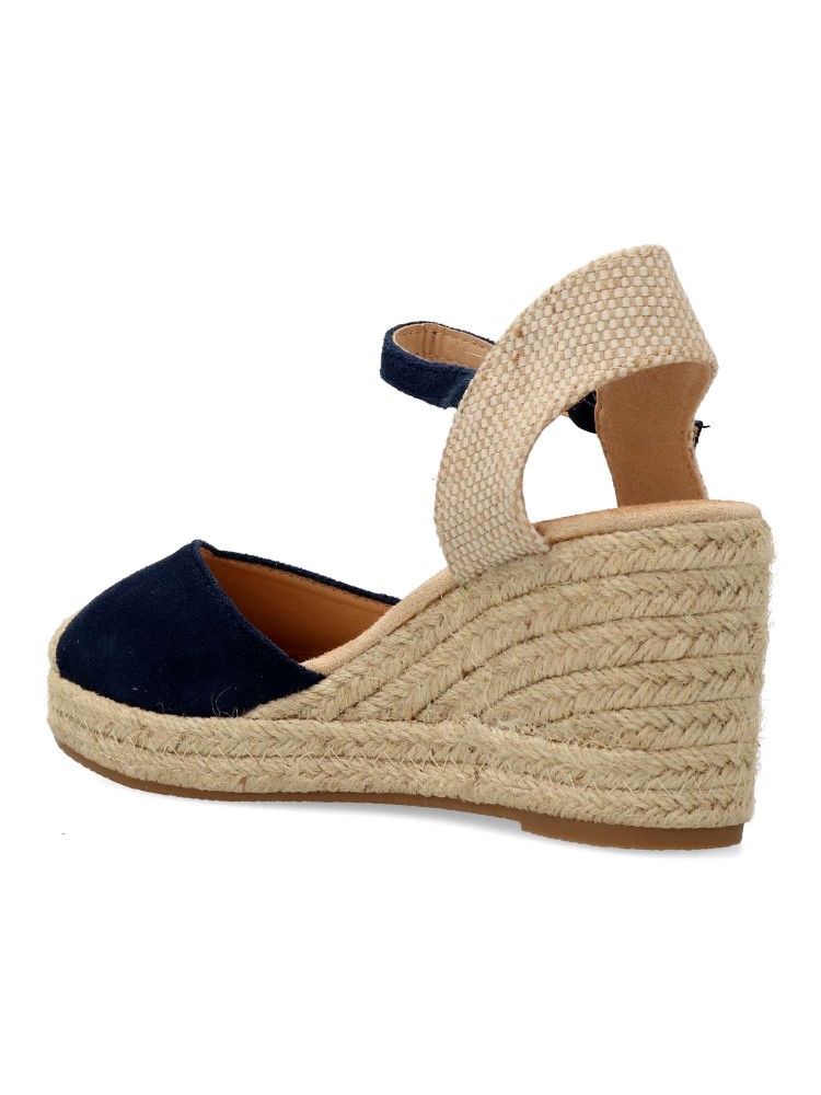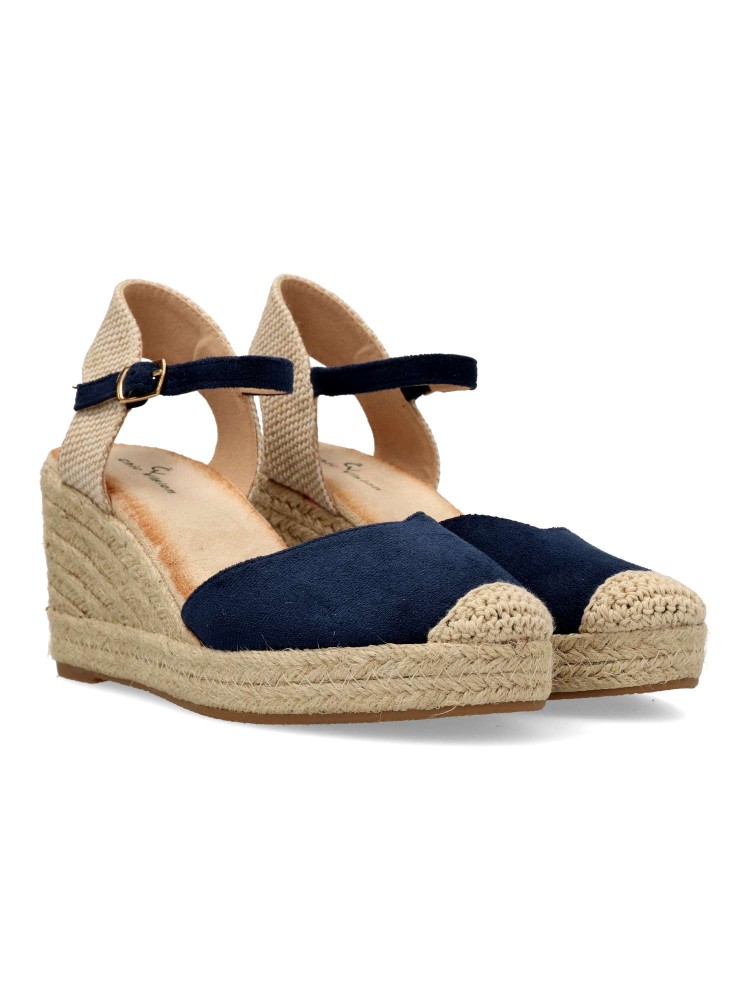 Sandalia esparteña yute de mujer. Cierre de hebilla al tobillo. Alpargata fabricada en antelina aterciopelada, con suela de yute sobre goma. Color marino. Cuña de 7 cm. Valenciana clásica para combinar en ferias y con tus looks de temporada.
