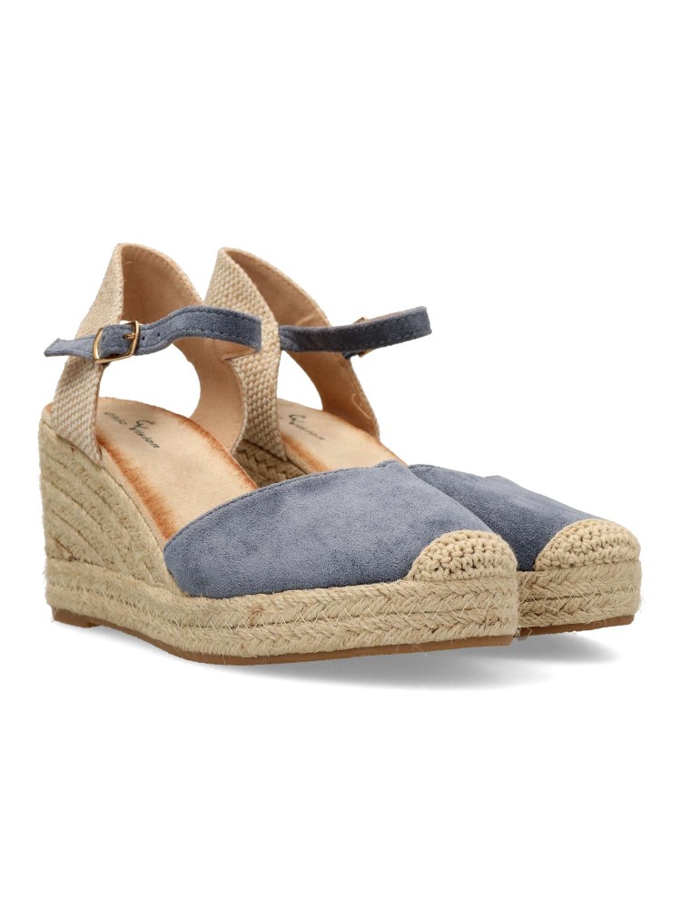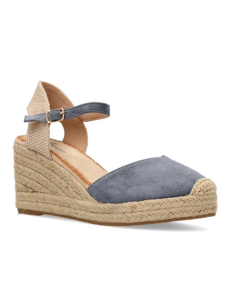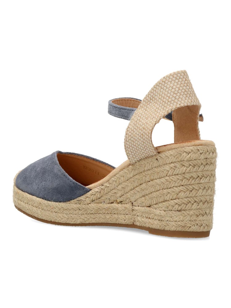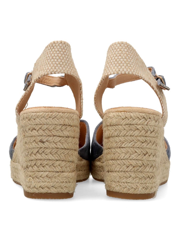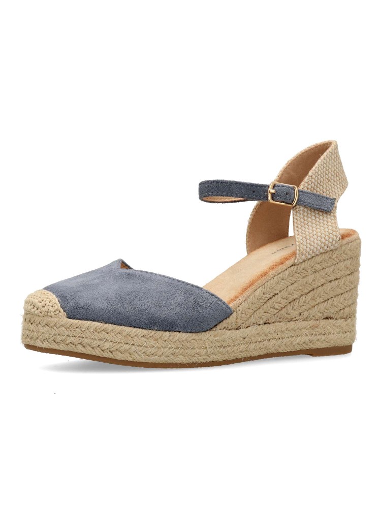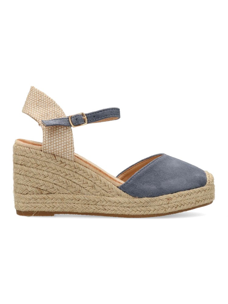 Sandalia esparteña yute de mujer. Cierre de hebilla al tobillo. Alpargata fabricada en antelina aterciopelada, con suela de yute sobre goma. Color jeans. Cuña de 7 cm. Valenciana clásica para combinar en ferias y con tus looks de temporada.
