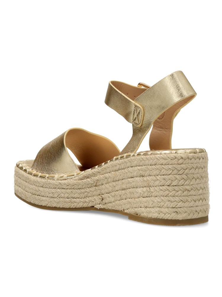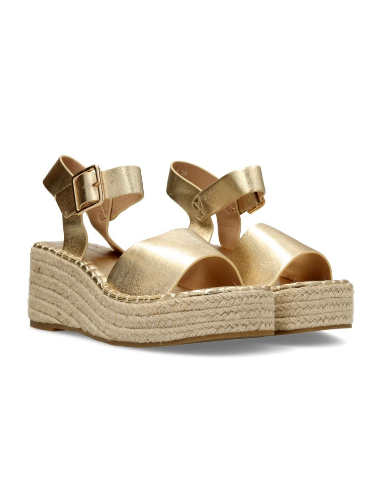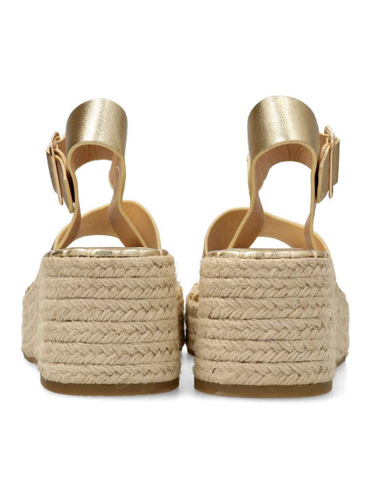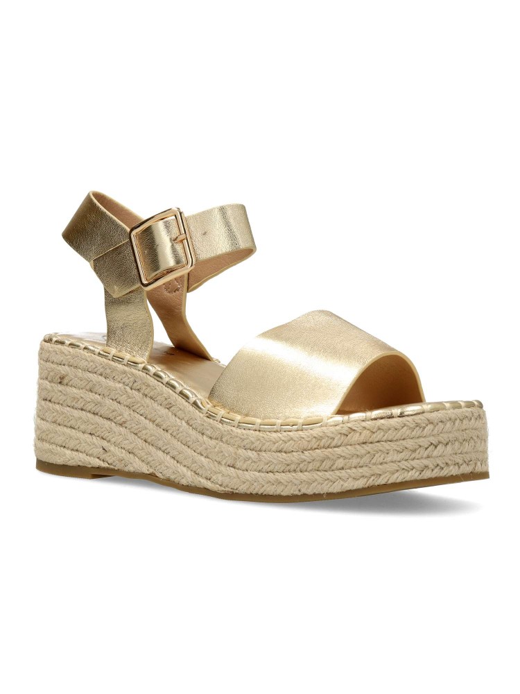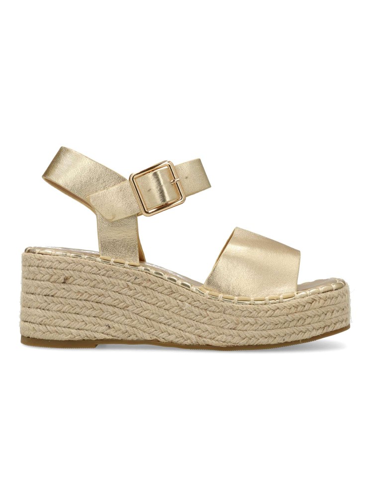 Sandalia esparteña de mujer, con cierre de hebilla. Alpargata cómoda, fabricada en piel sintética, con suela de yute sobre goma. Planta acolchada. Color oro. Cuña de 6,5 cm. con plataforma. Máximo confort en una sandalia ideal para ferias y uso diario.