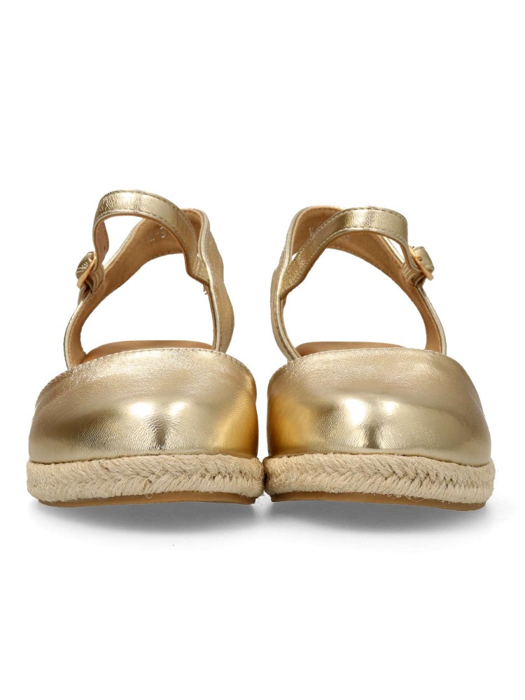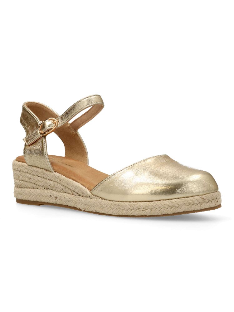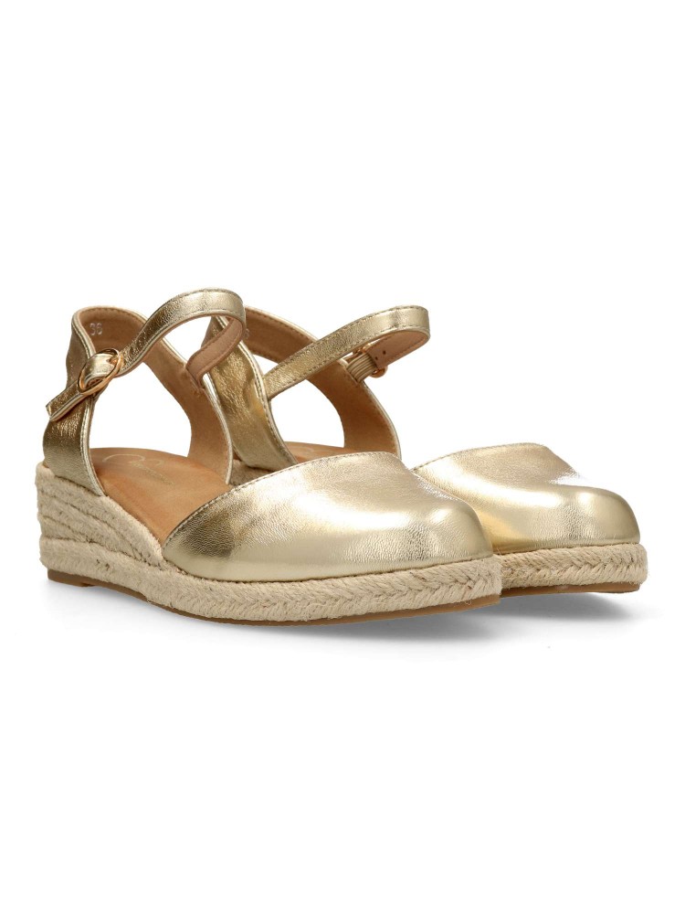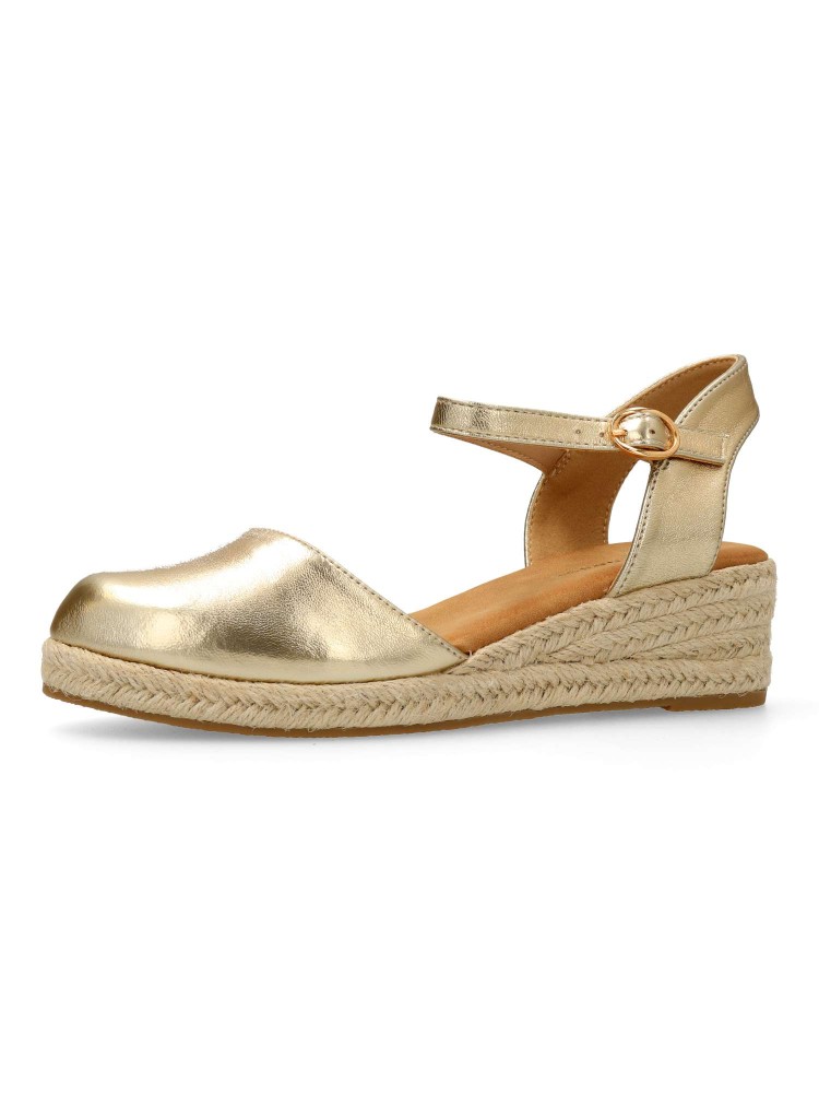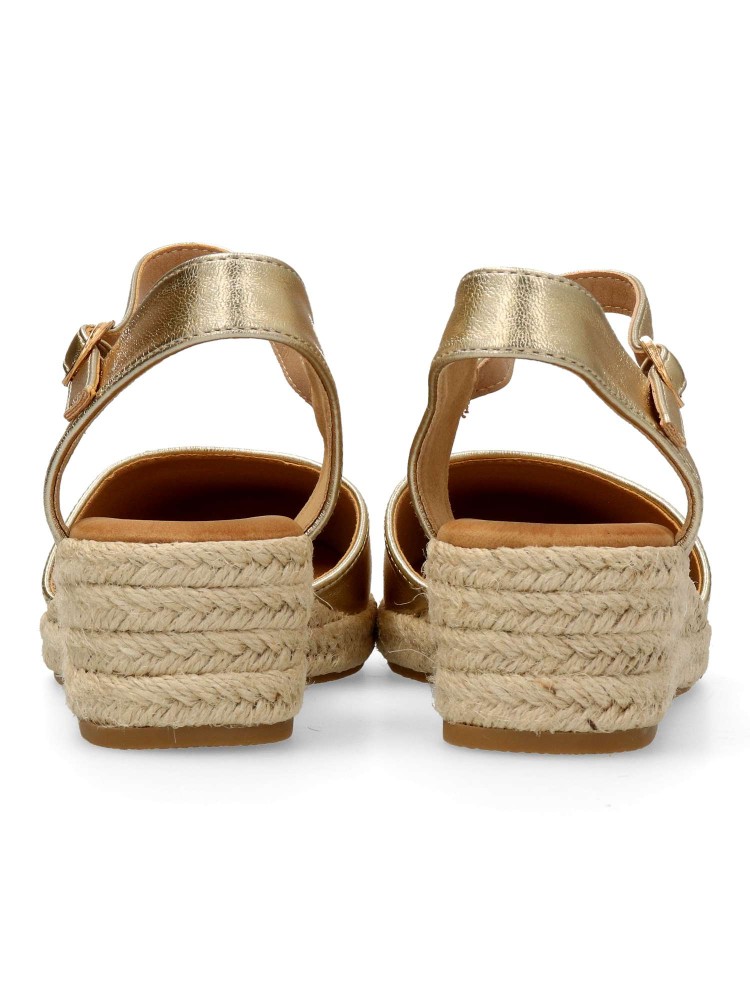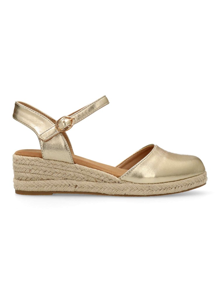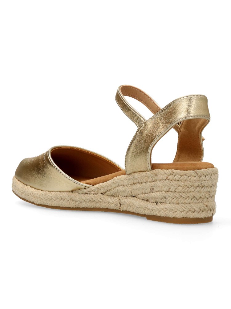 Sandalia yute de mujer. Cierre de hebilla al tobillo. Alpargata fabricada en antelina aterciopelada, con suela de yute sobre goma. Color oro. Cuña de 4,5 cm. Valenciana clásica y cómoda para combinar en ferias y con tus looks de verano.