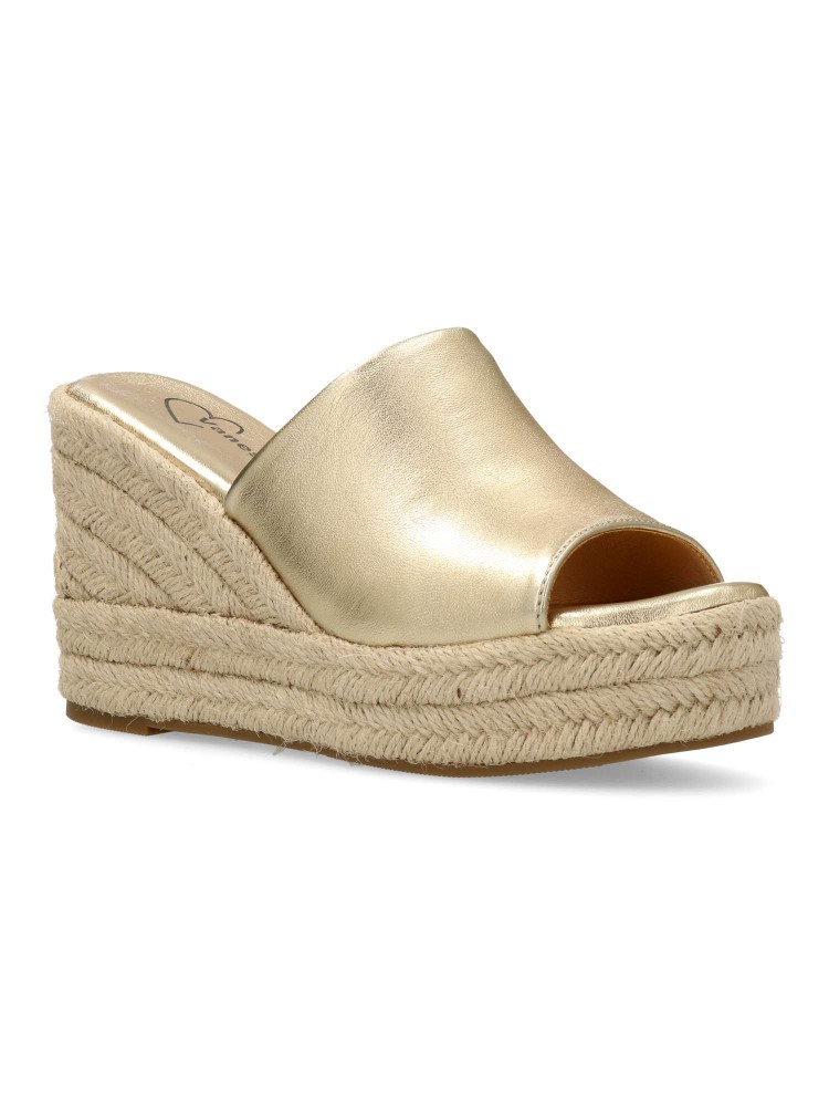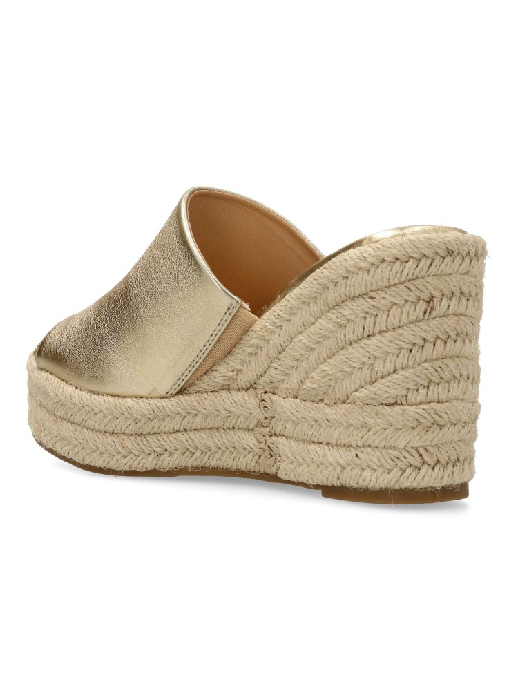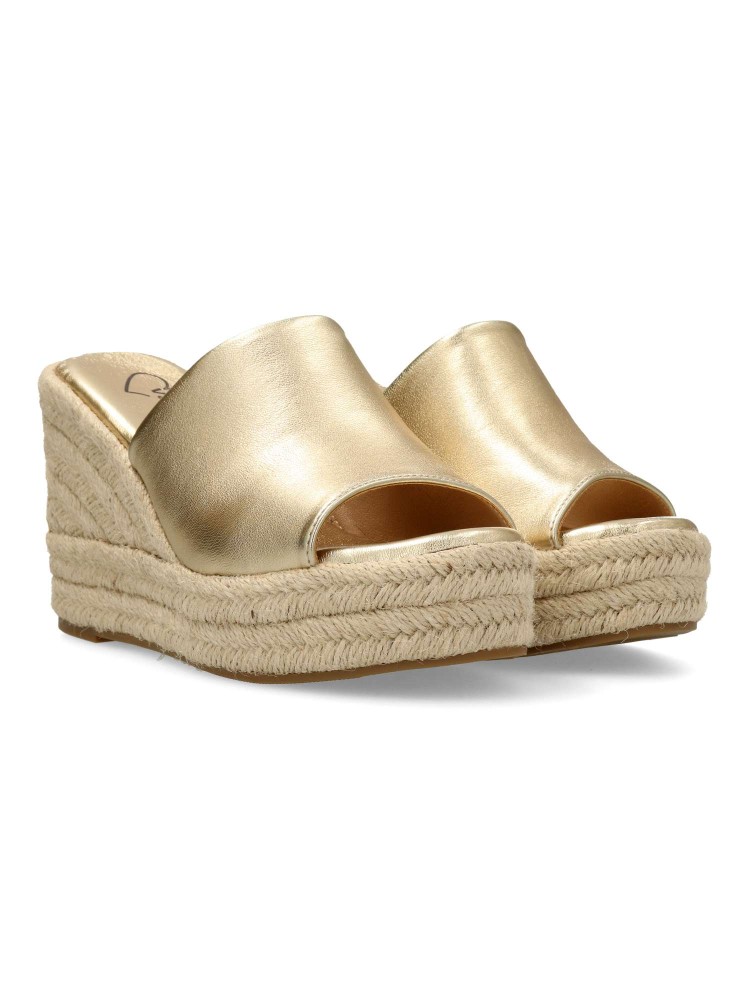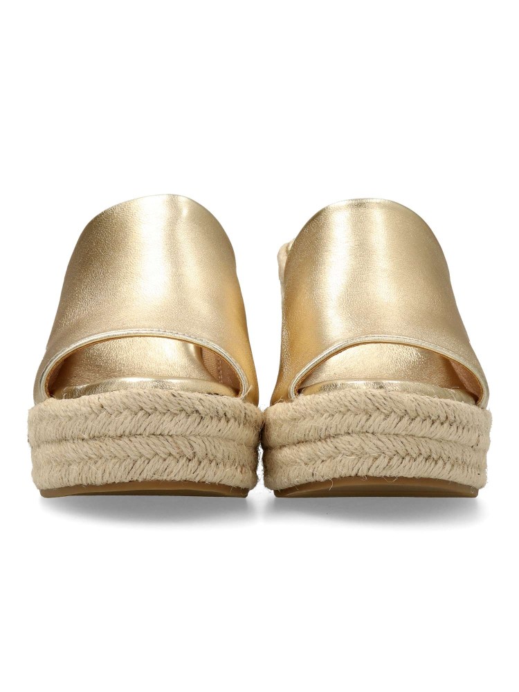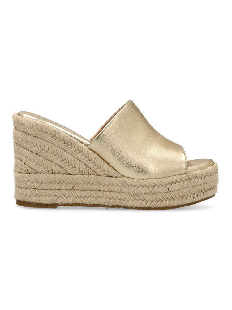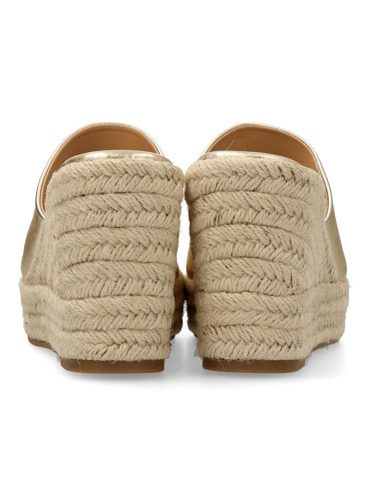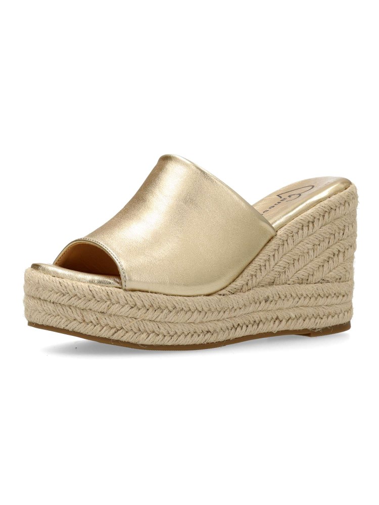 Sandalia de mujer, con pala fabricada en piel sintética. Alpargata cómoda, con suela de yute sobre goma. Planta acolchada. Color oro. Cuña de 9 cm. con plataforma. Máximo confort en una sandalia ideal para trajes de ferias, verbenas y conjuntos de verano.