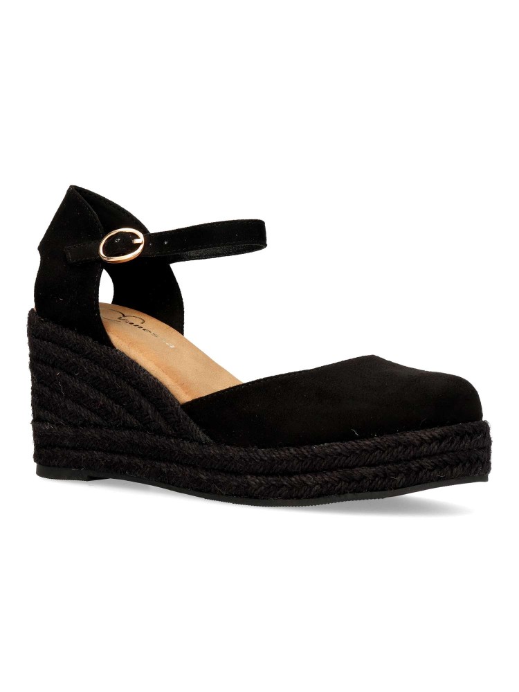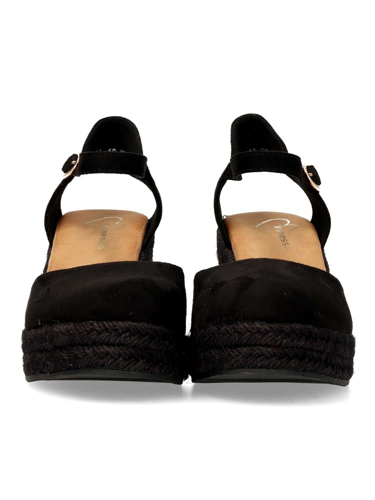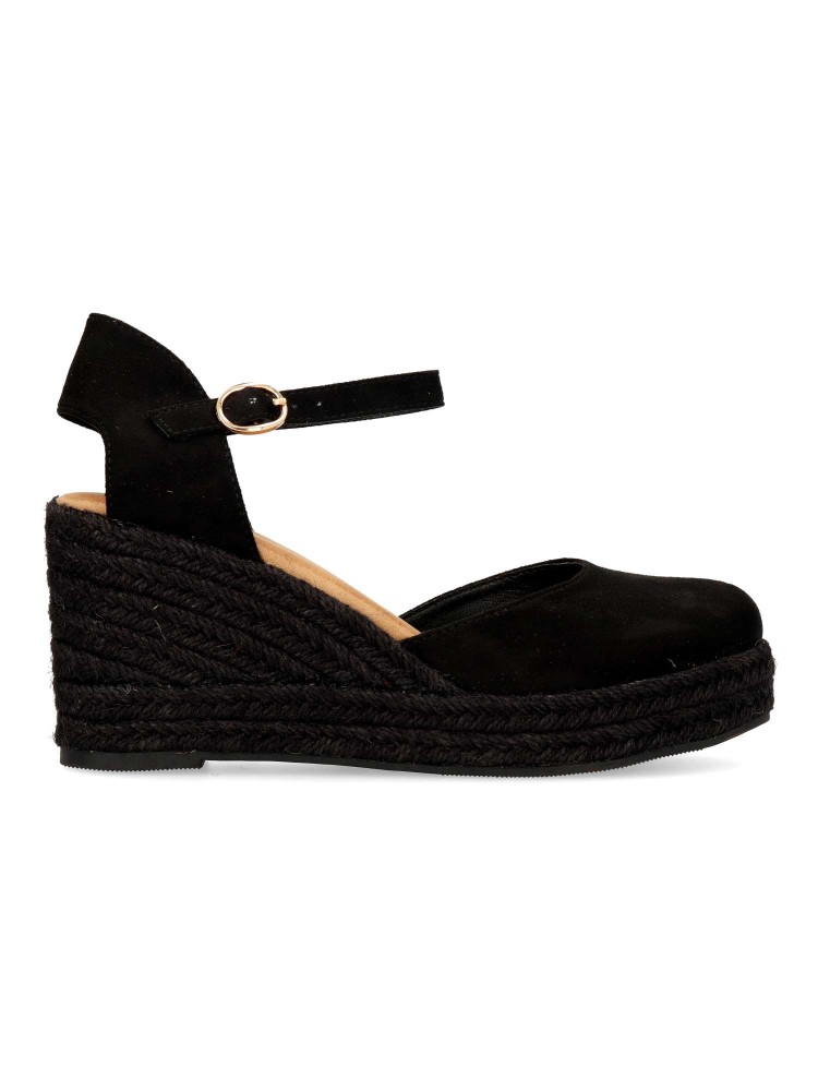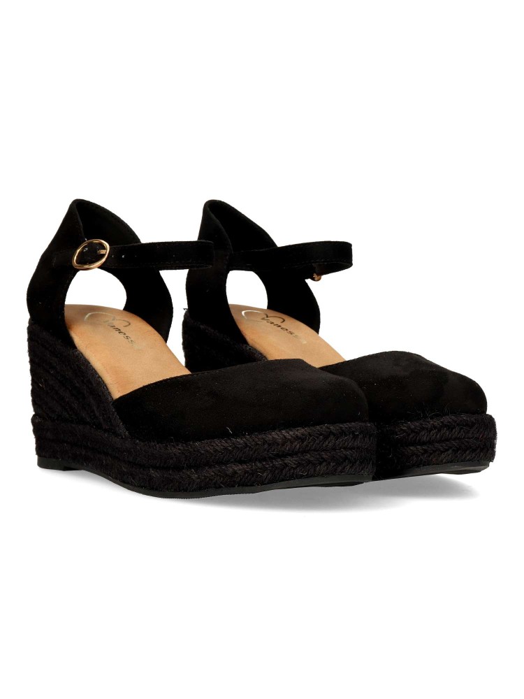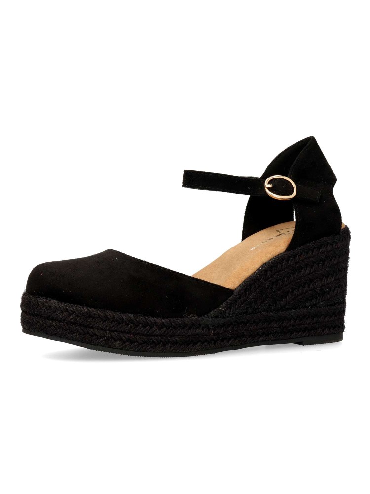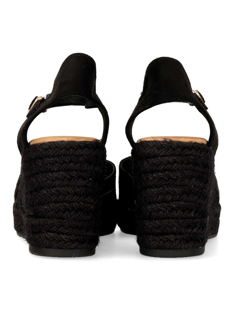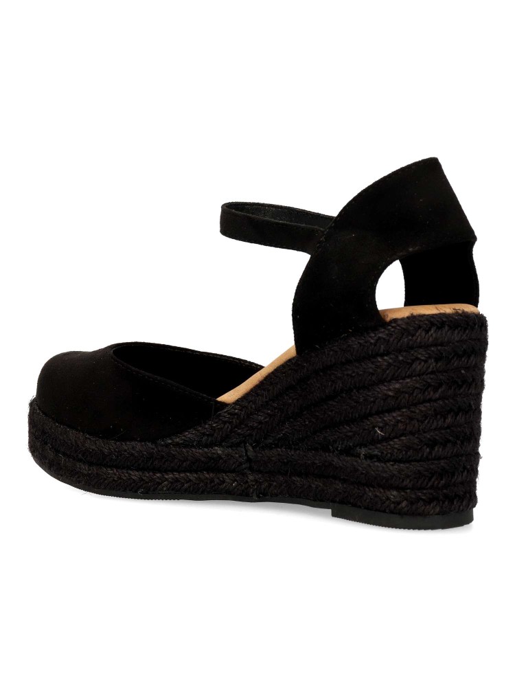 Sandalia esparteña cómoda para mujer. Cierre de hebilla al tobillo. Alpargata fabricada en antelina, con suela de yute al tono sobre goma. Color negro. Altura 7,5 cm. Plataforma de 2,5 cm. Valenciana clásica, ideal para conjuntos de ferias y uso diario.