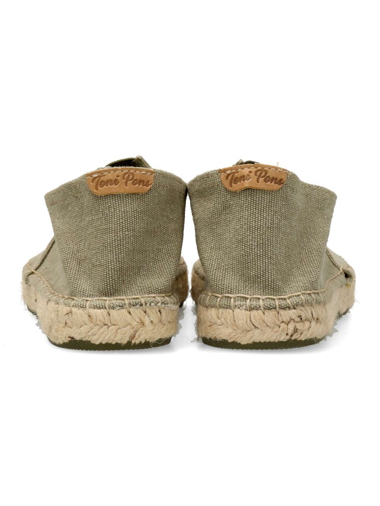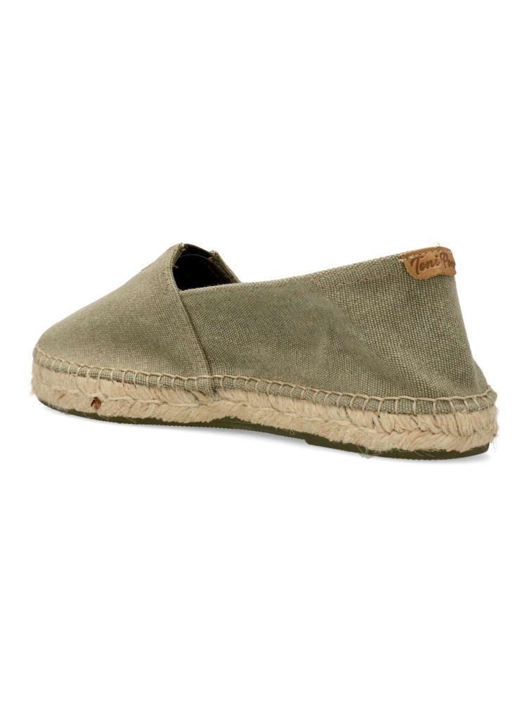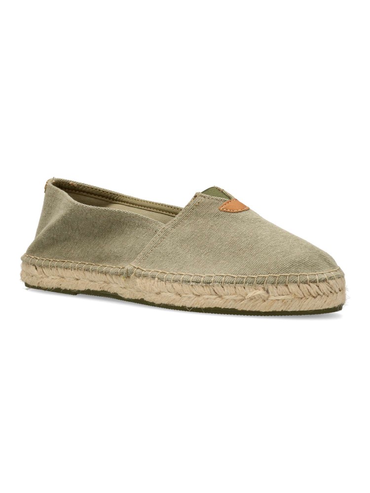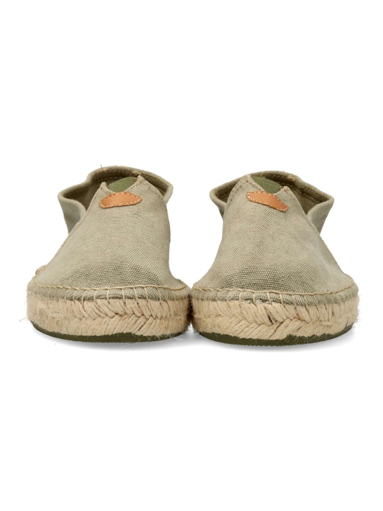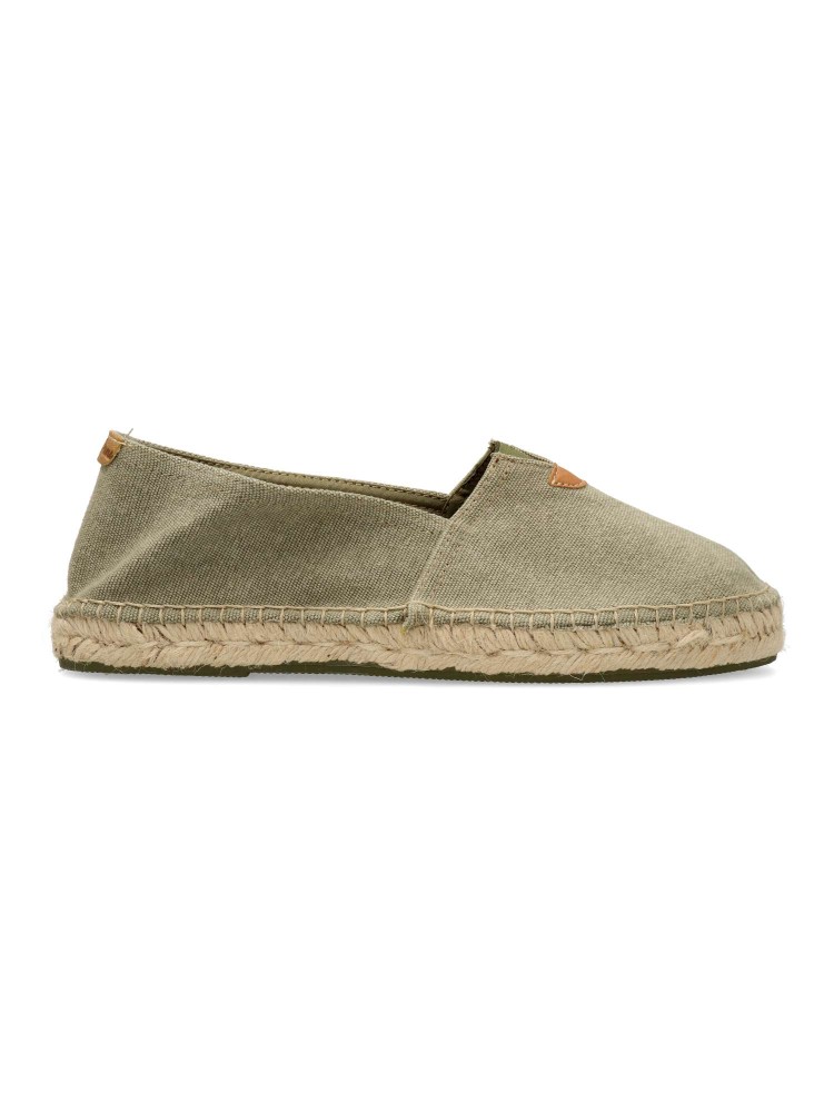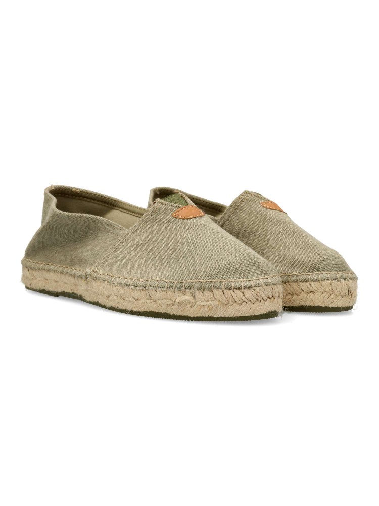 Zapatillas espadrilles, con elástico al empeine. Modelo cómodo, fabricado en textil, con suela de yute natural sobre goma. Planta acolchada. Color kaki. Modelo de esparteña típica y original hecha a la antigua usanza. Hecho a mano en España.