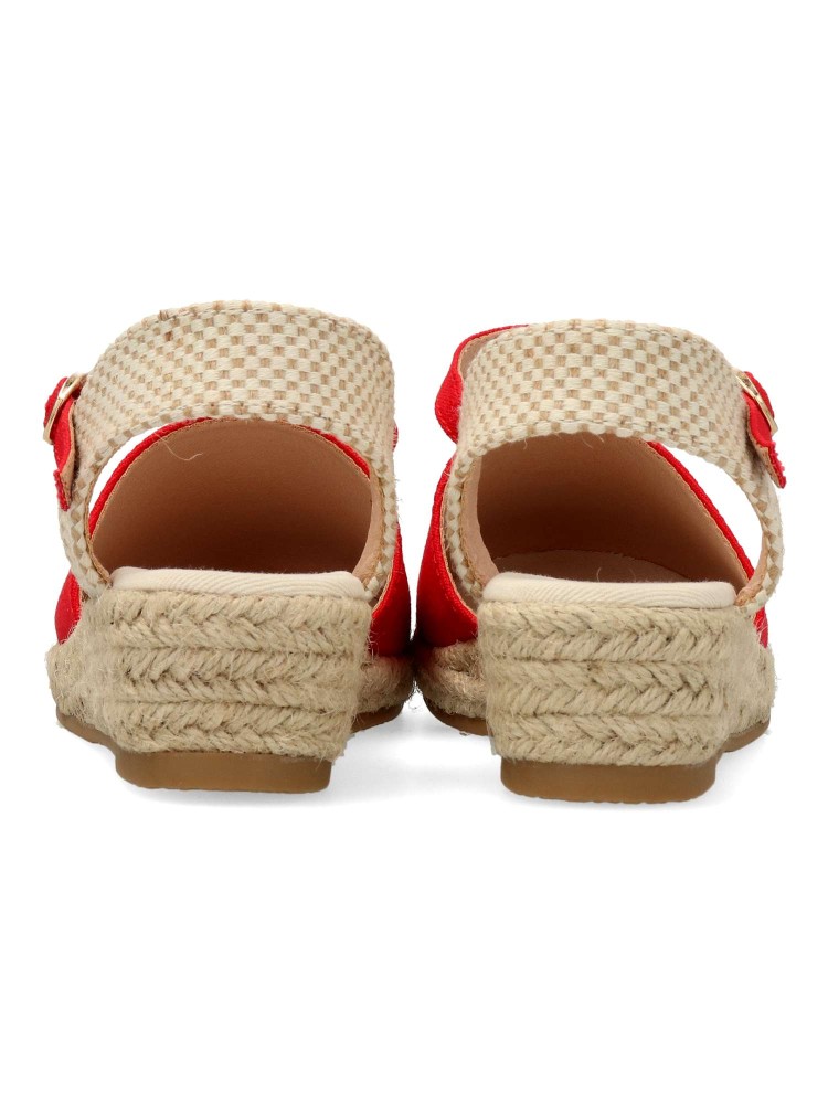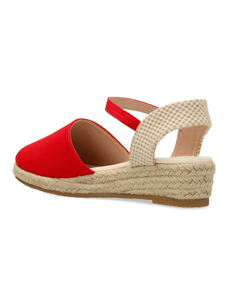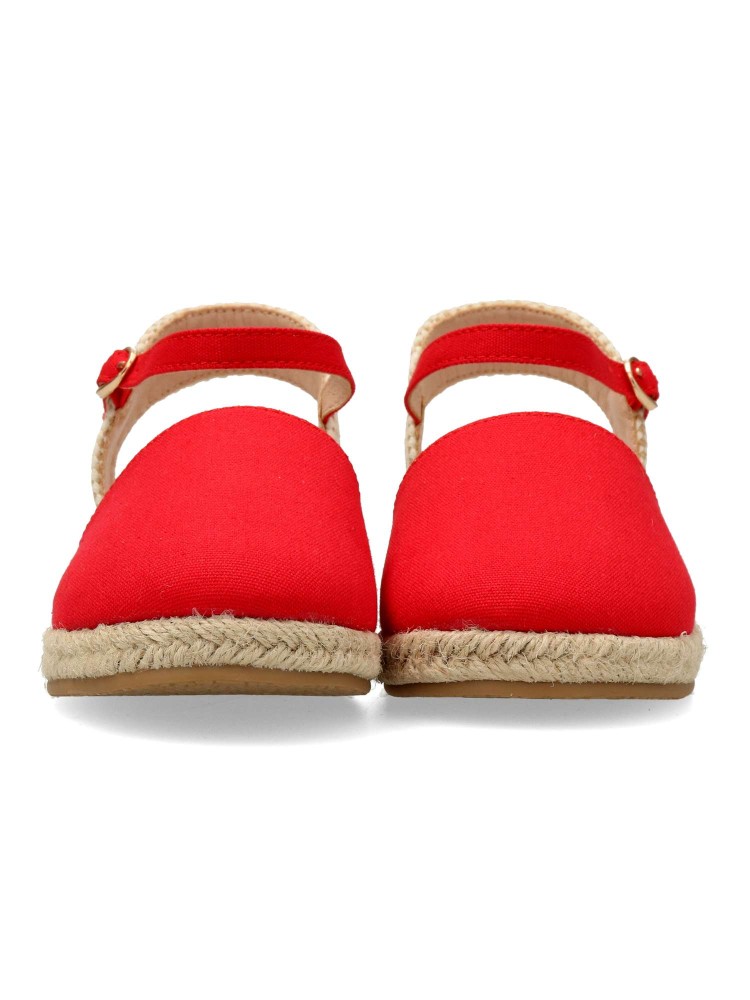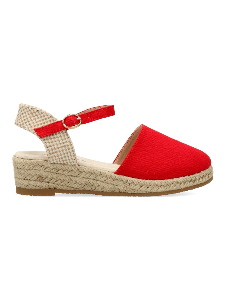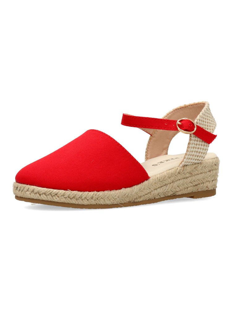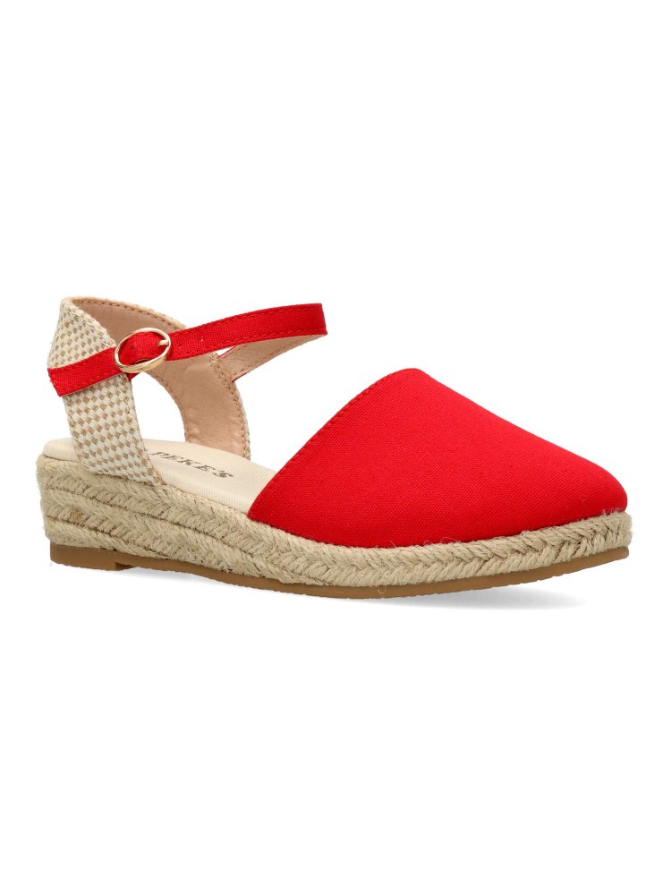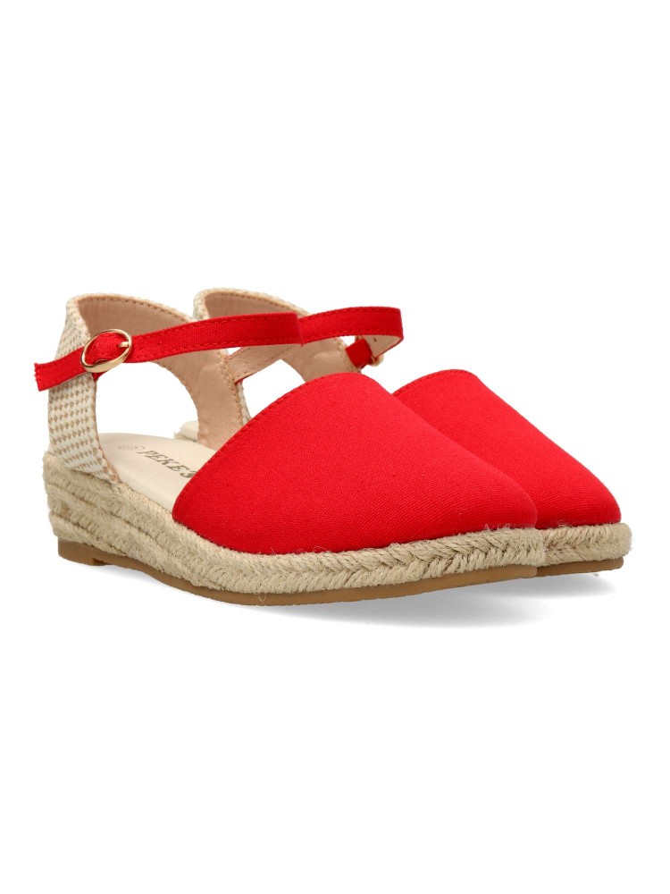 Sandalia cómoda de niña. Alpargata con cierre de hebilla al tobillo, fabricada en textil con suela de yute sobre goma. Esparteña disponible en color rojo. Altura cuña 4 cm. Valenciana ideal para ferias y eventos. PEKE´S By Vanessa.