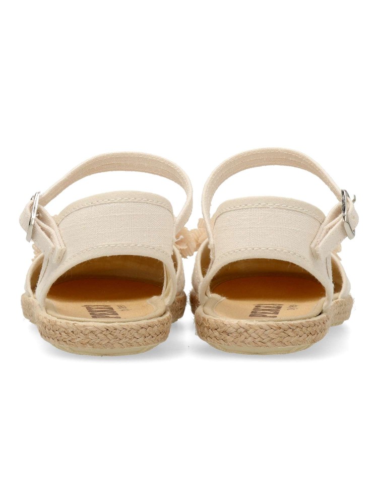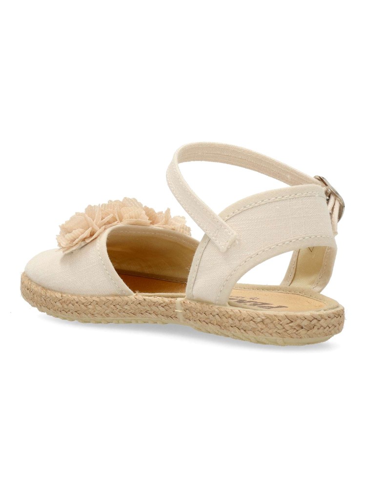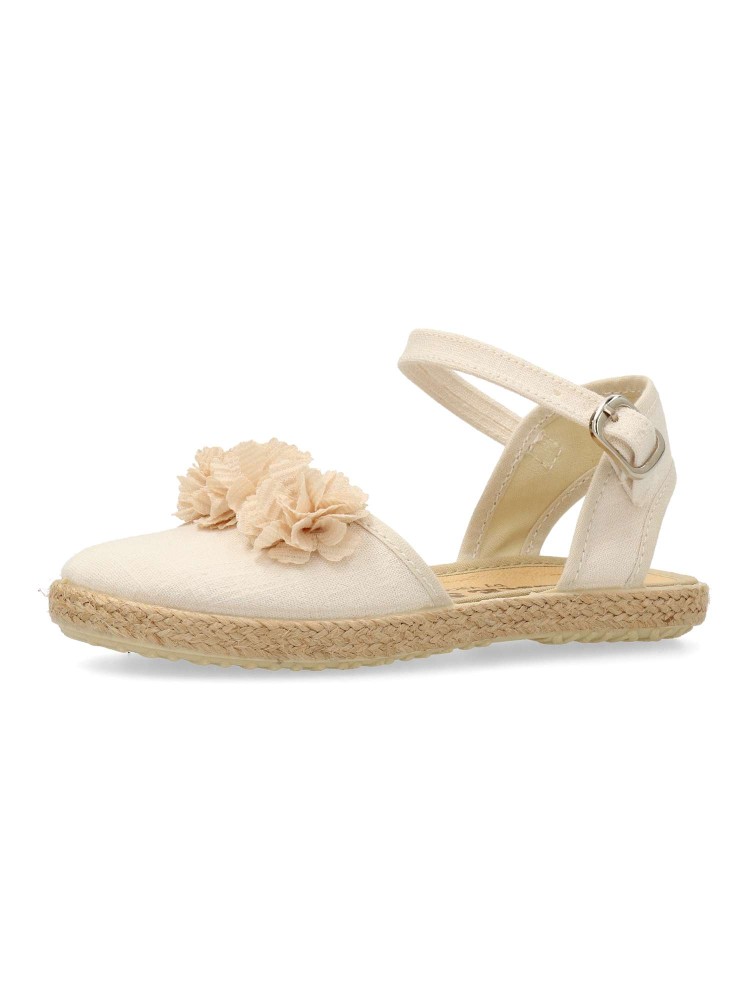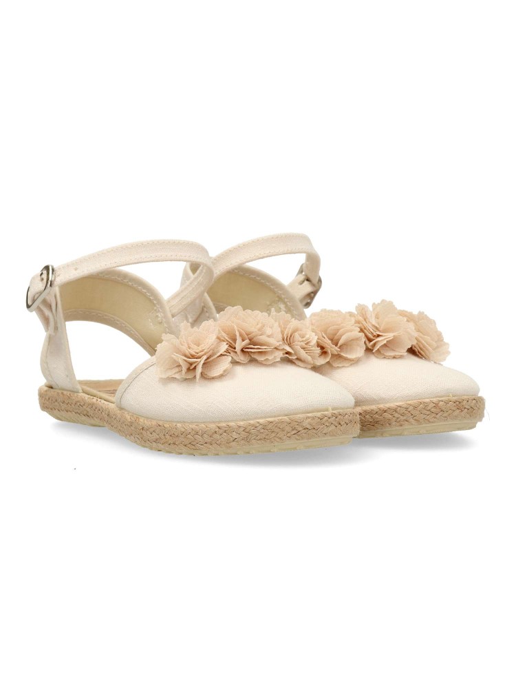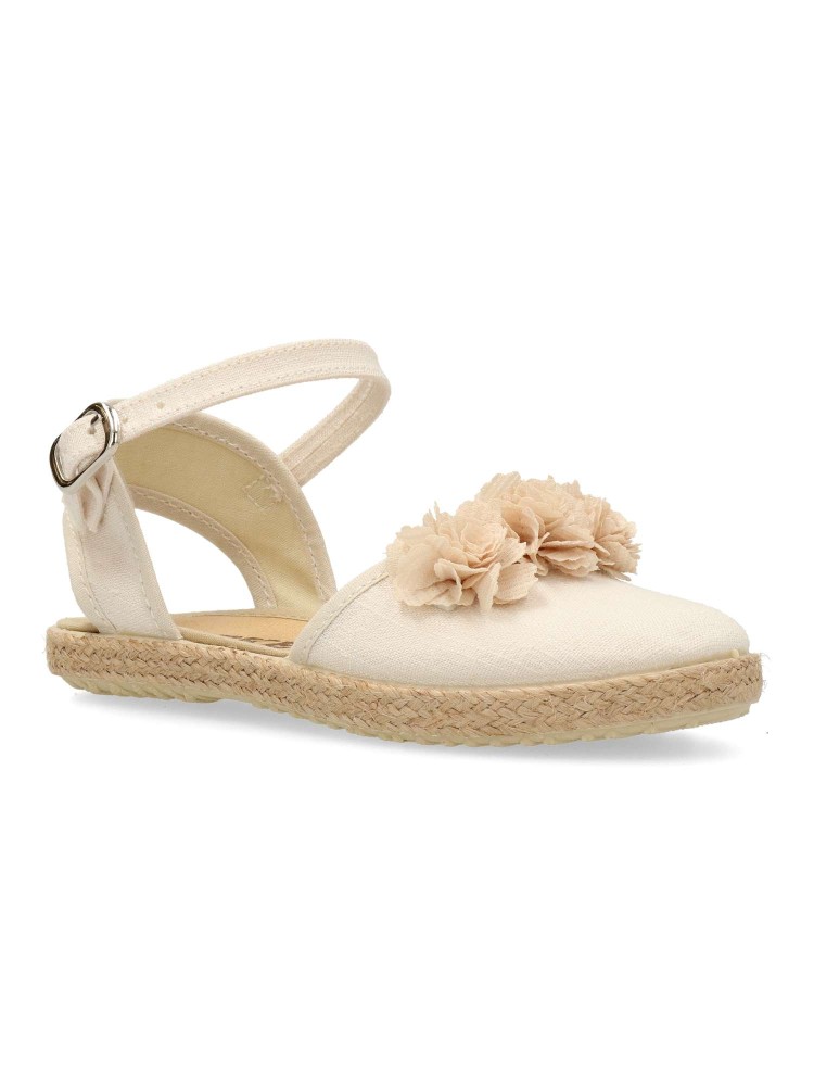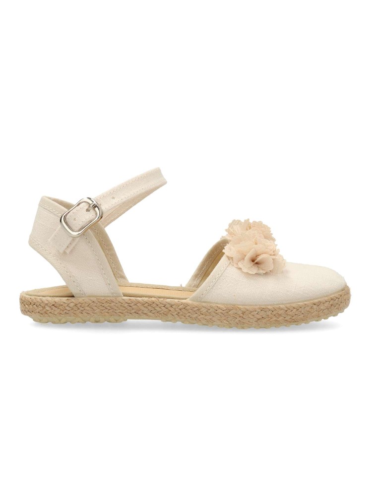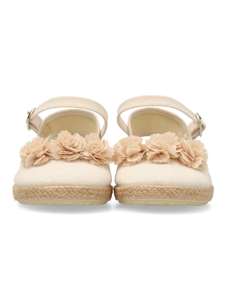 Sandalia alpargata yute de niña. Cierre de hebilla. Esparteña cómoda, fabricada en textil. Suela de goma y cuerda trenzada alrededor. Color nude. Valenciana ideal para combinar con tus outfits de primavera verano. PEKE´S By Vanessa. Hecho en España.