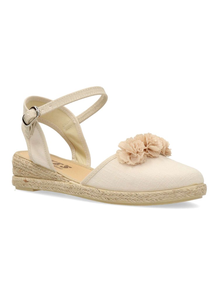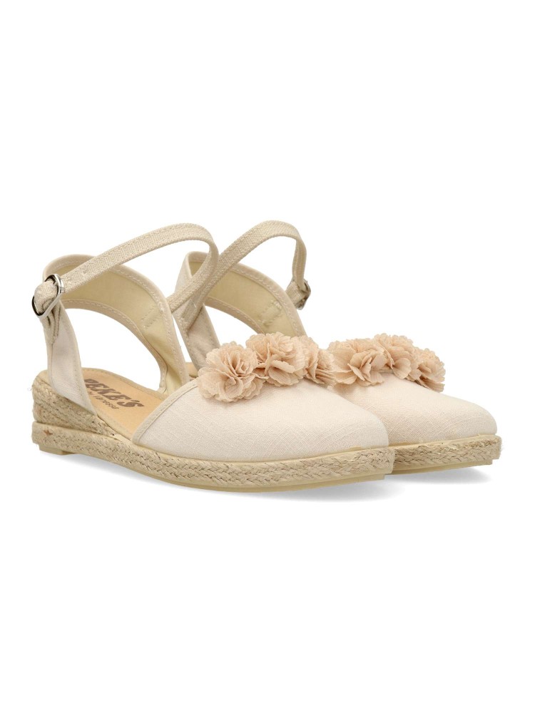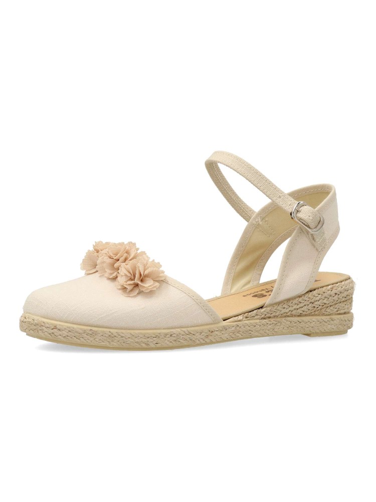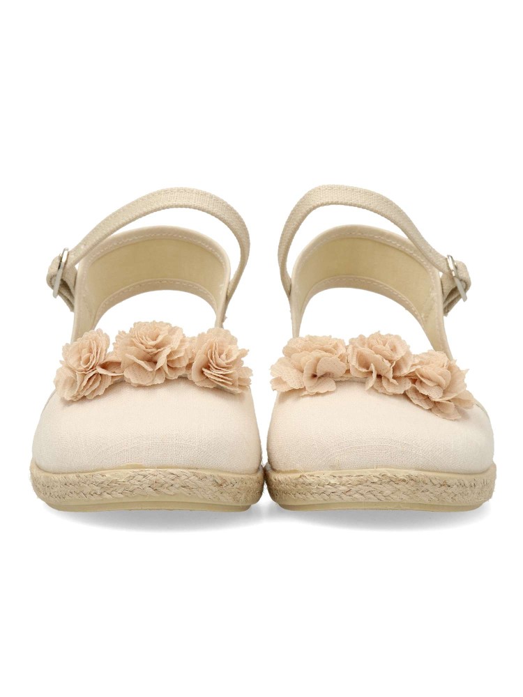Sandalia alpargata de niña, con cierre de hebilla al tobillo. Fabricada en textil lino, con suela de yute sobre goma. Esparteña disponible en color piedra. Altura cuña 3 cm. Valenciana ideal para comuniones y demás celebraciones. PEKE´S By Vanessa.