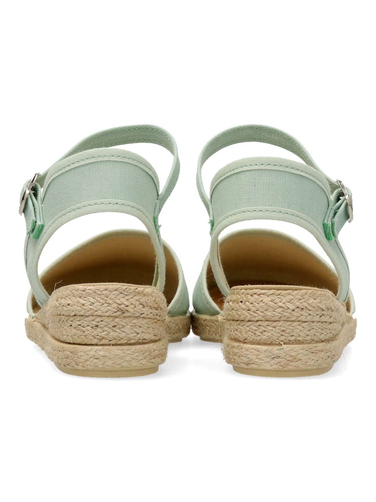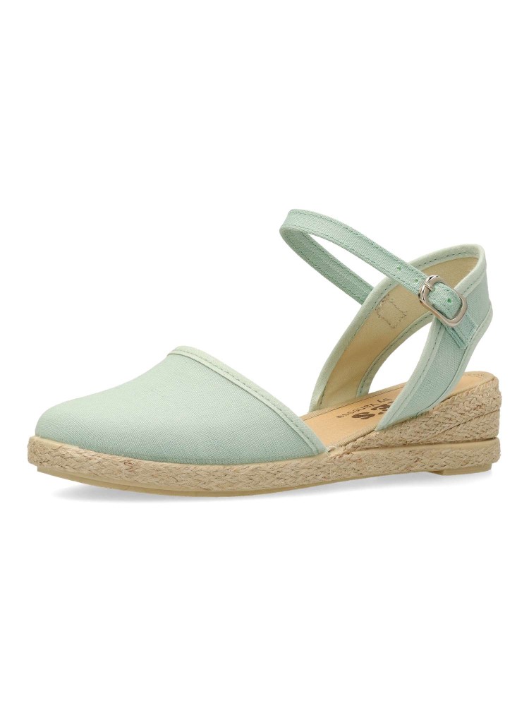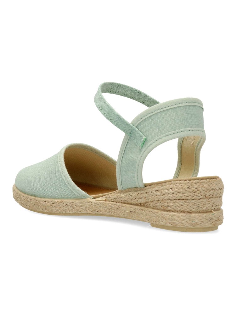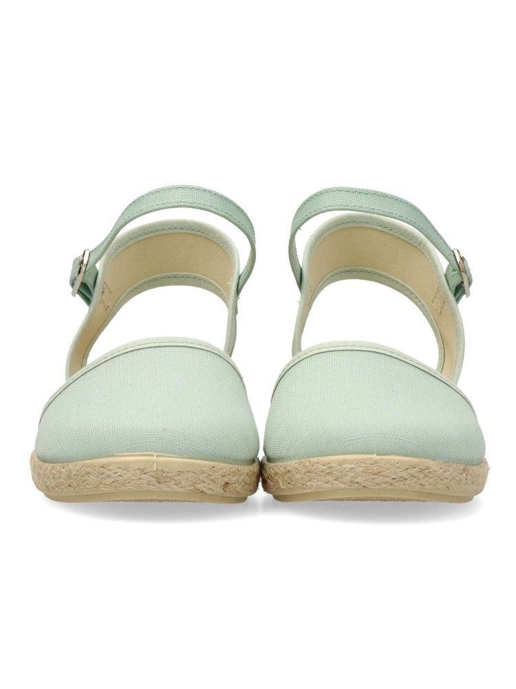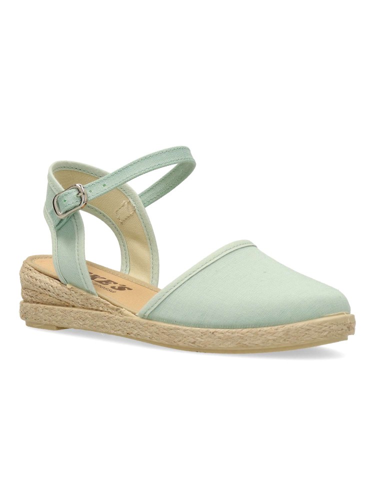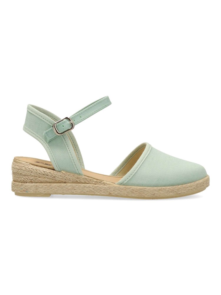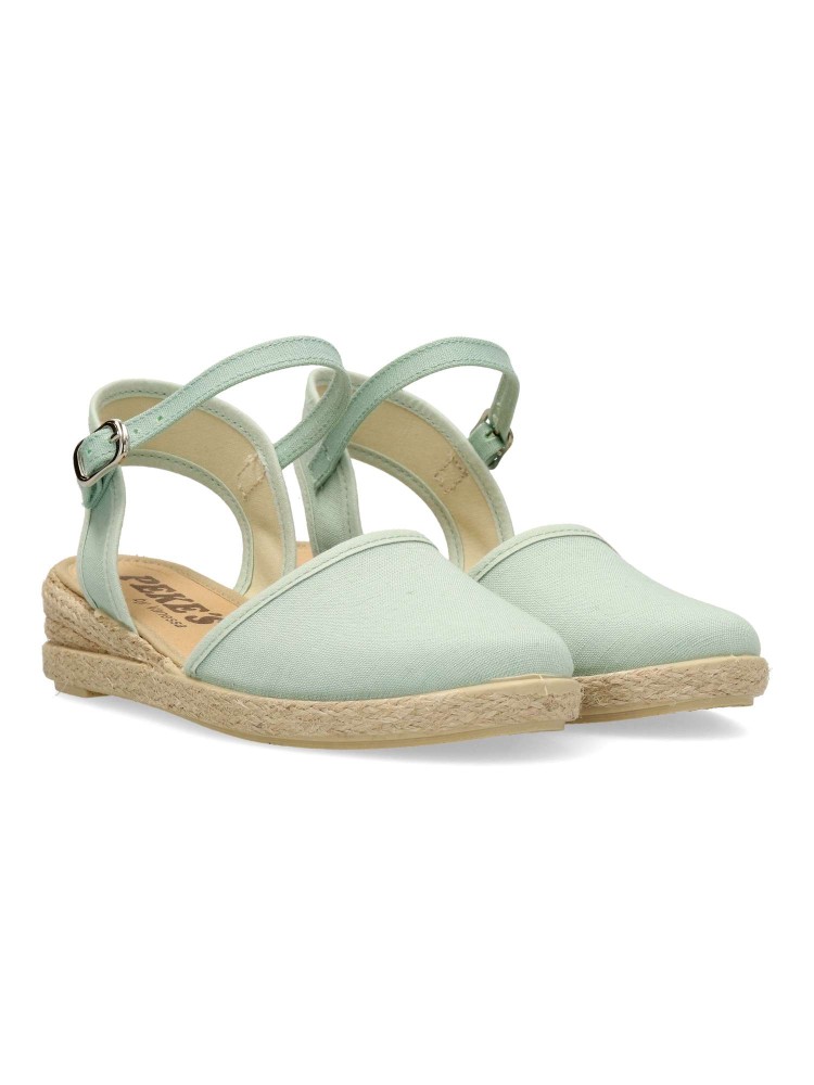 Sandalia alpargata de niña, con cierre de hebilla al tobillo. Fabricada en textil con suela de yute sobre goma. Esparteña color menta. Altura cuña 3 cm. Valenciana ideal para eventos y celebraciones. Diseño y confort. Hecho en España. PEKE´S By Vanessa.