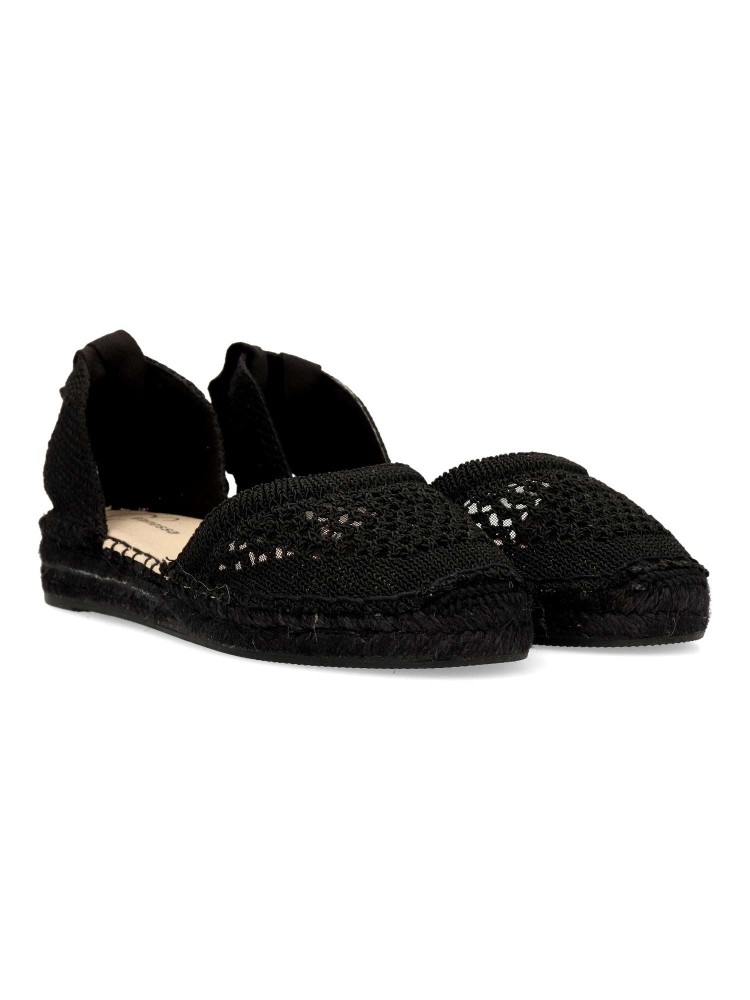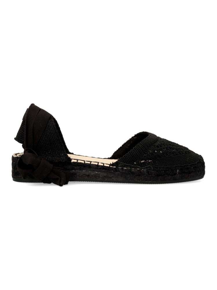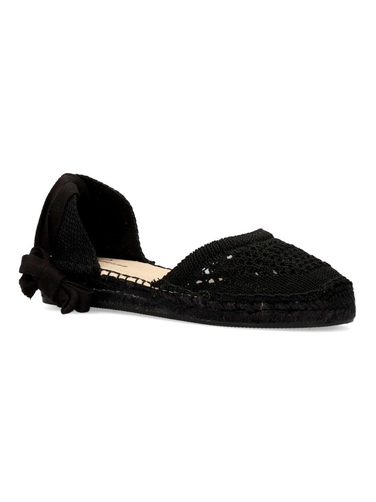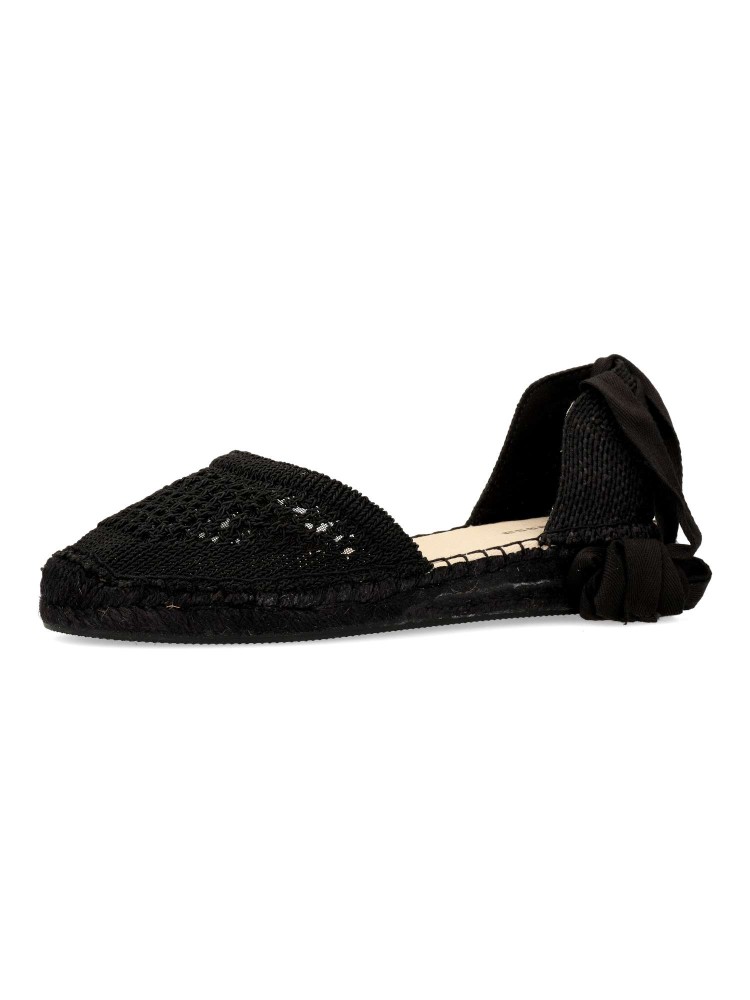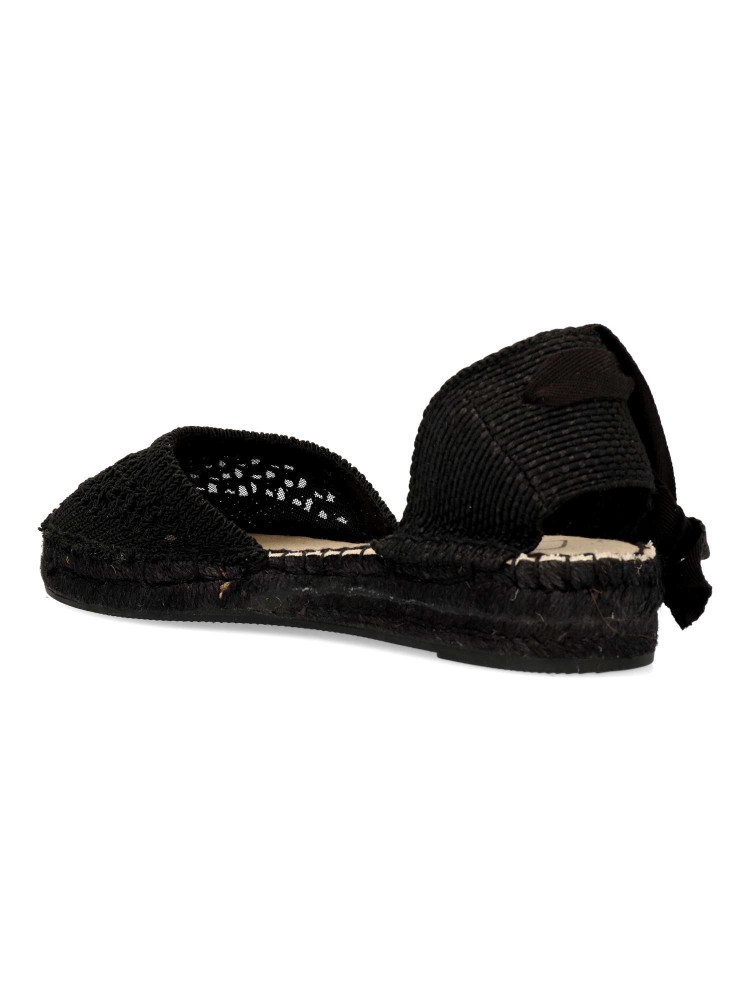 Sandalia esparteña plana de mujer. Cierre de cintas al tobillo. Alpargata con pala de cuerda trenzada y suela de yute sobre goma. Planta acolchada. Color negro. Una sandalia clásica veraniega, fácil de combinar con todos tus looks de temporada.