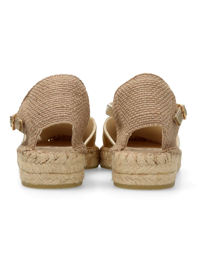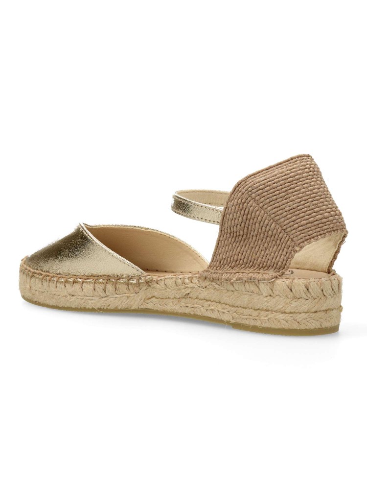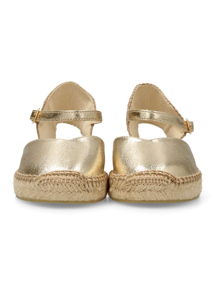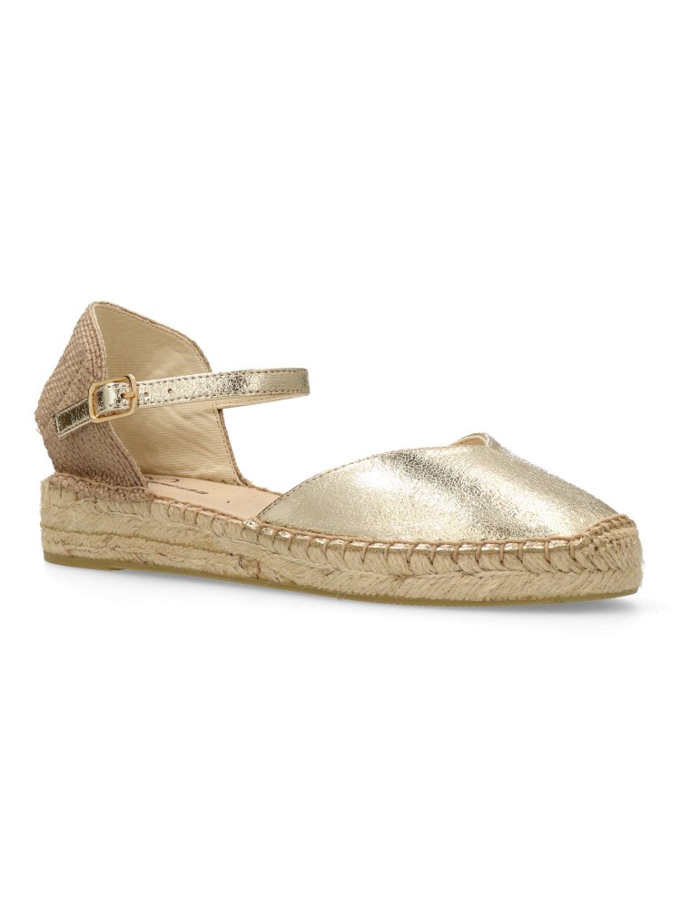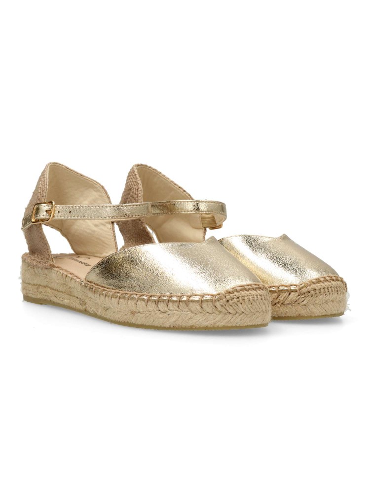 Sandalia esparteña plana de mujer. Tira al tobillo con cierre de hebilla. Alpargata fabricada en piel sintética, con suela de yute sobre goma. Planta acolchada. Color oro. Una sandalia clásica veraniega, fácil de combinar con todos tus outfits.