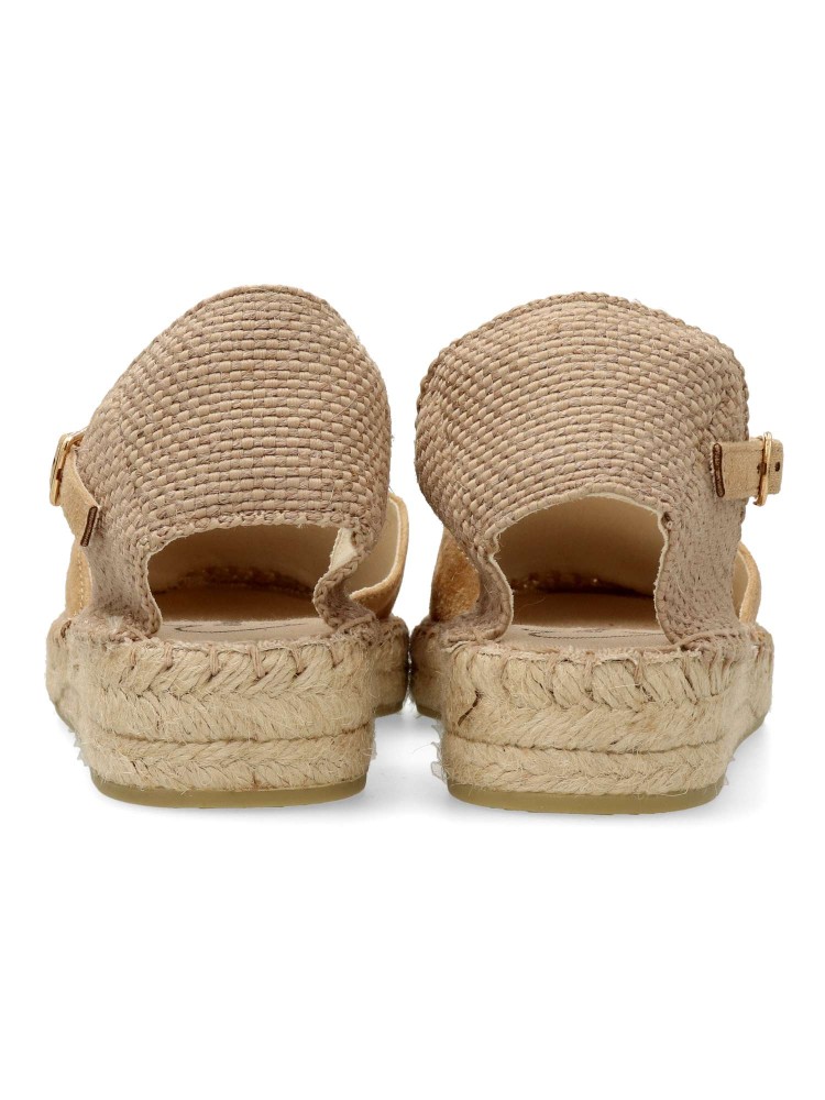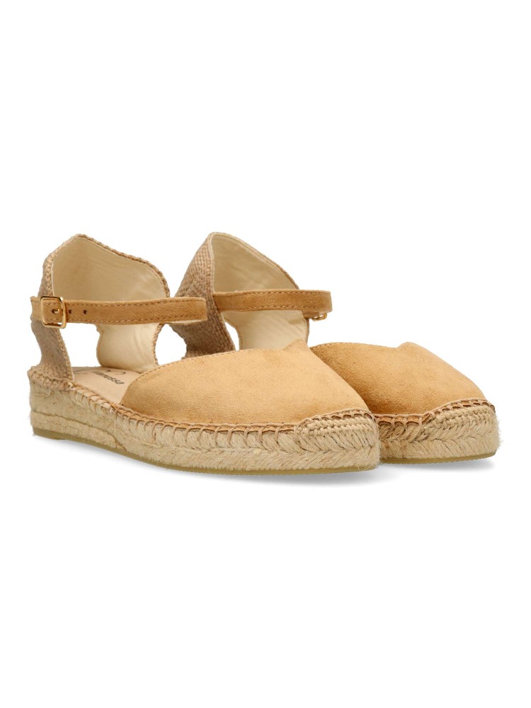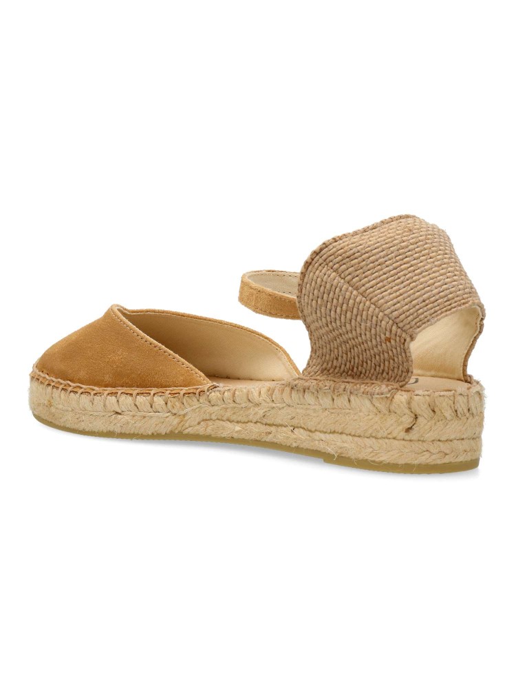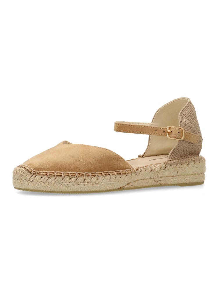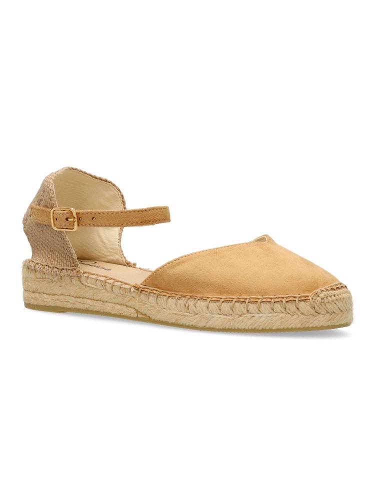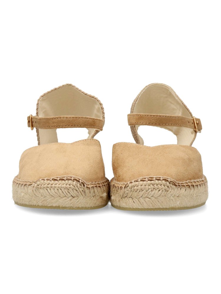 Sandalia esparteña plana de mujer. Tira al tobillo con cierre de hebilla. Alpargata fabricada en piel sintética, con suela de yute sobre goma. Planta acolchada. Color camel. Una sandalia clásica veraniega, fácil de combinar con todos tus outfits.