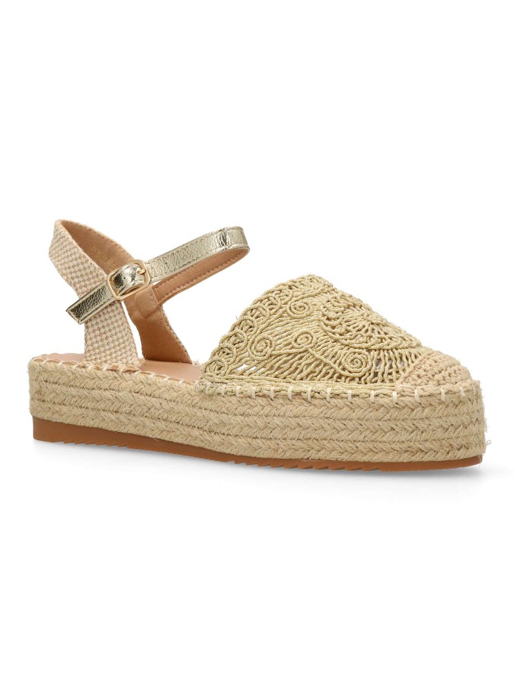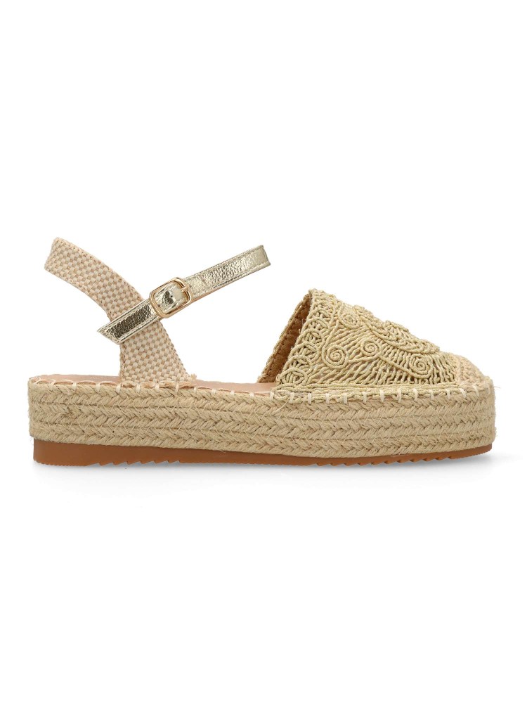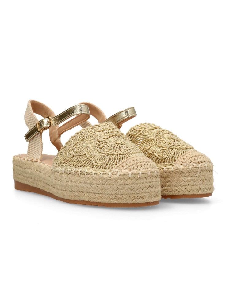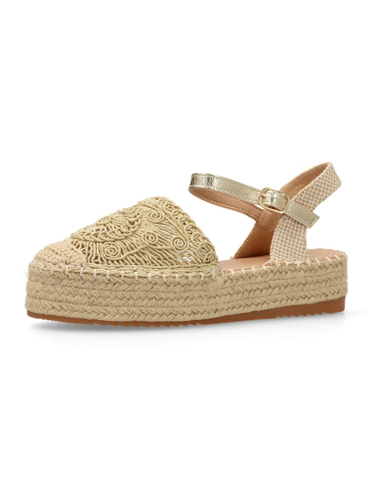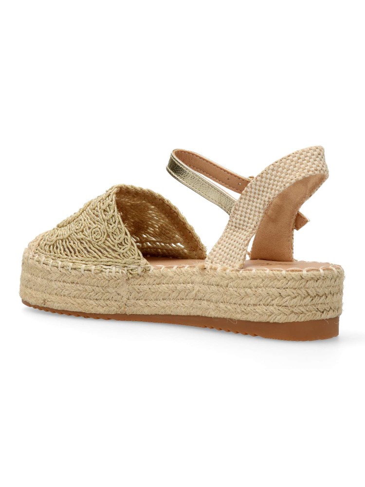 Sandalia alpargata de mujer, estilo valenciana. Cierre de hebilla Modelo con pala de cuerda dibujo geométrico. Suela de goma, con yute alrededor. Planta acolchada. Altura plataforma 4 cm. Color oro. Esparteña ideal para dar altura a tus looks de verano.