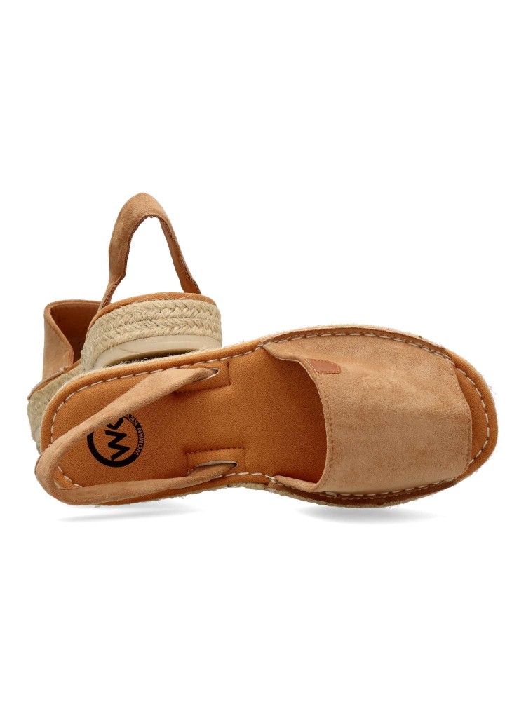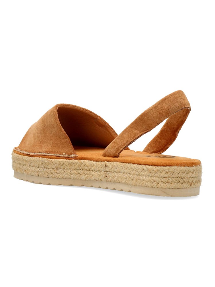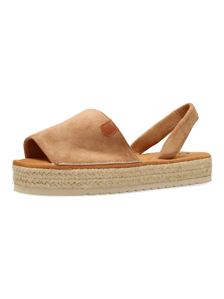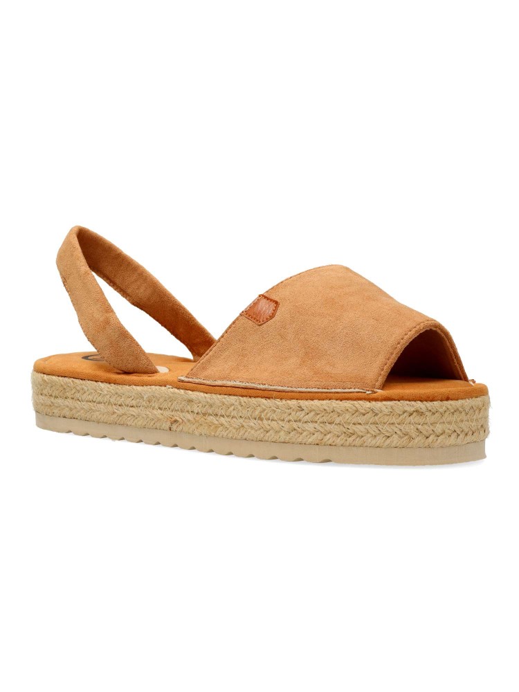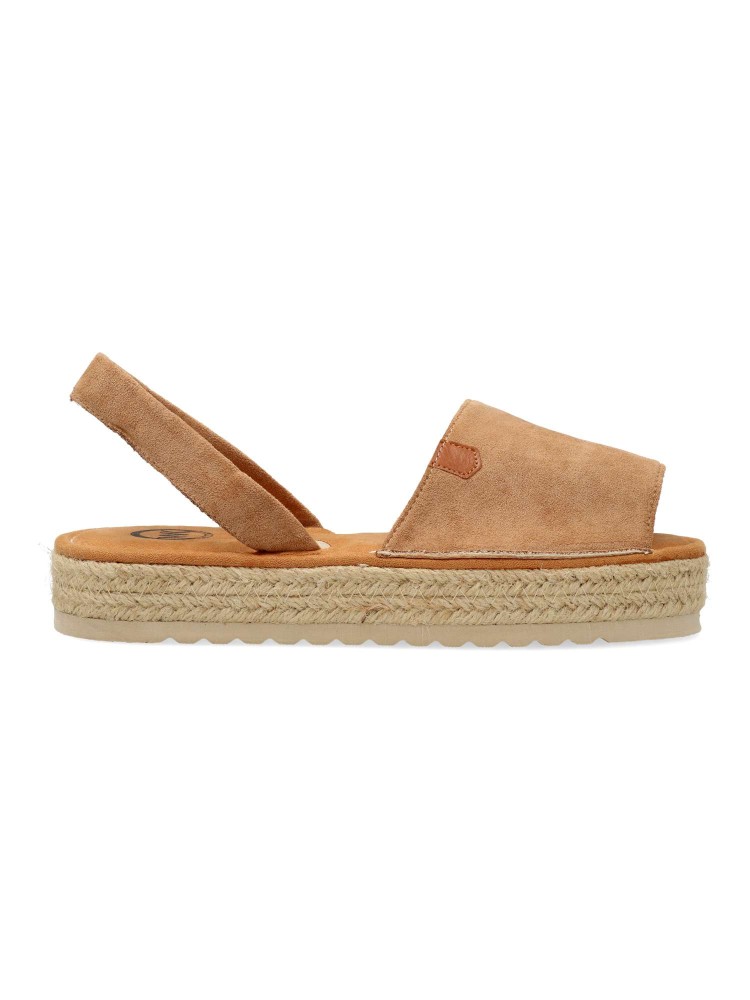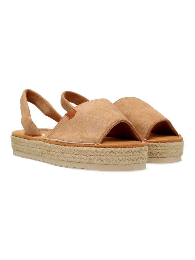 Sandalia alpargata de mujer, estilo ibicenca. Fabricado en antelina, con suela de EVA. Planta acolchada. Plataforma de 3 cm. de altura, forrada de esparto. Color camel. Esparteña con diseño original y versátil, ideal con tus looks de verano.