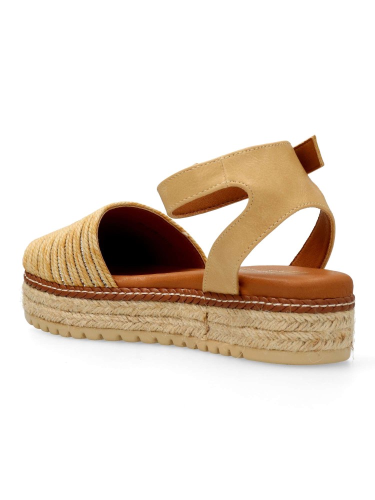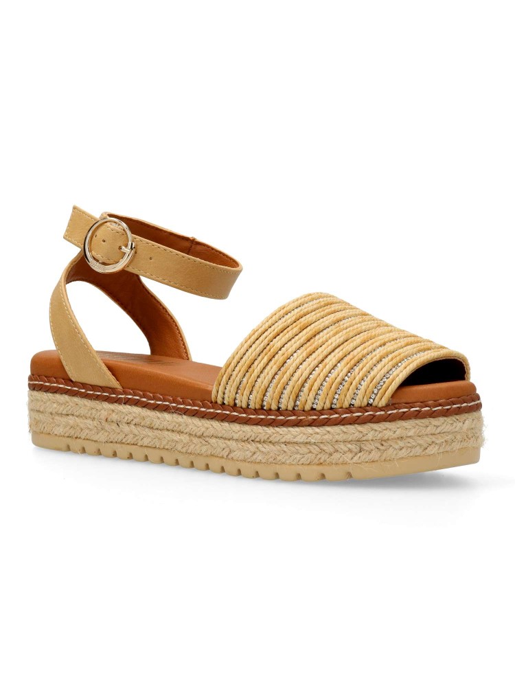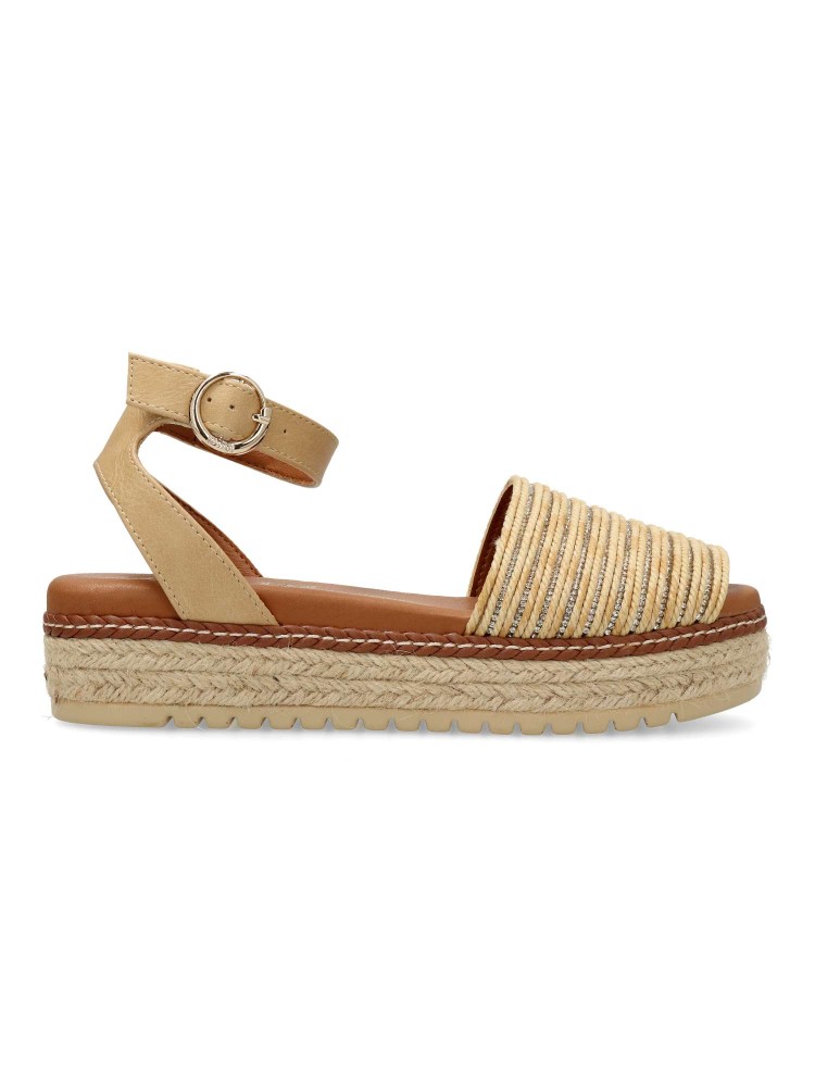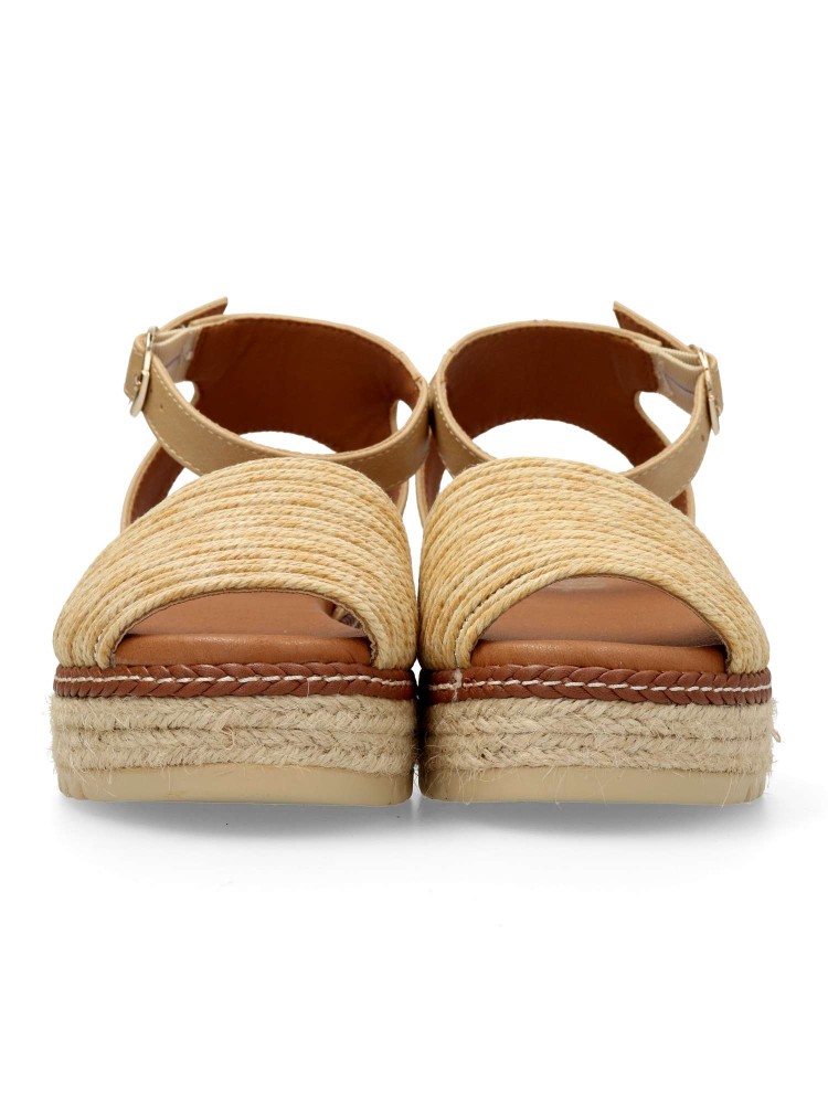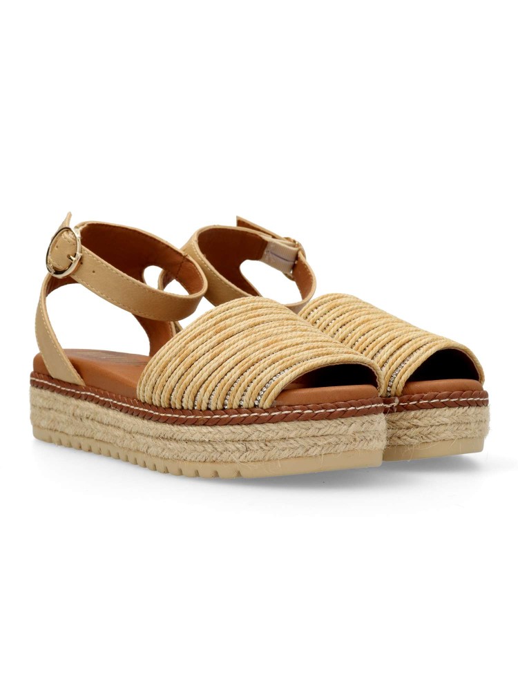 Sandalia cómoda de mujer, tipo ibicenca. Pulsera al tobillo con cierre de hebilla. Pala ancha de diseño trenzado con detalles brillantes. suela de goma forrada de yute. Plataforma de 4 cm. Diseño versátil y original, ideal con tus outfits de verano.