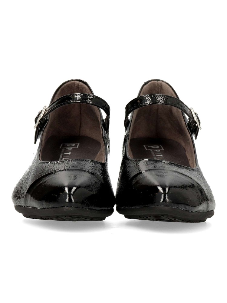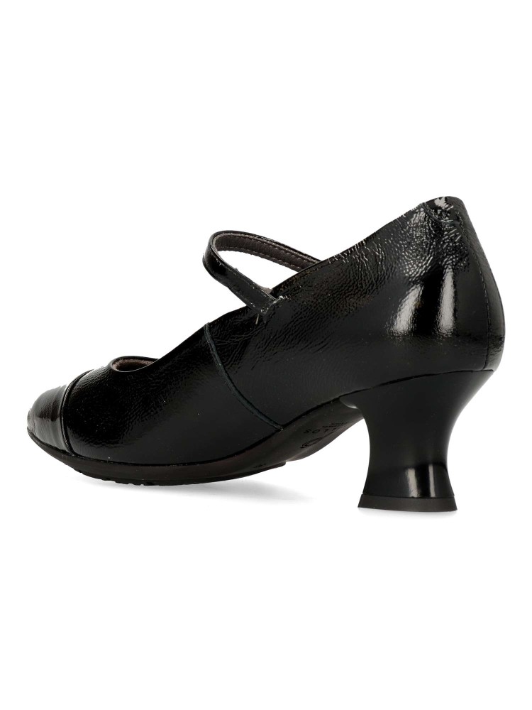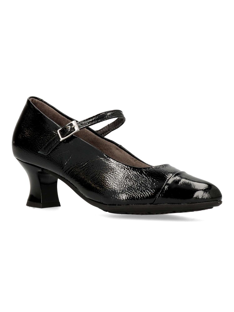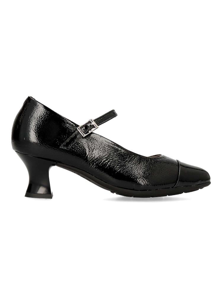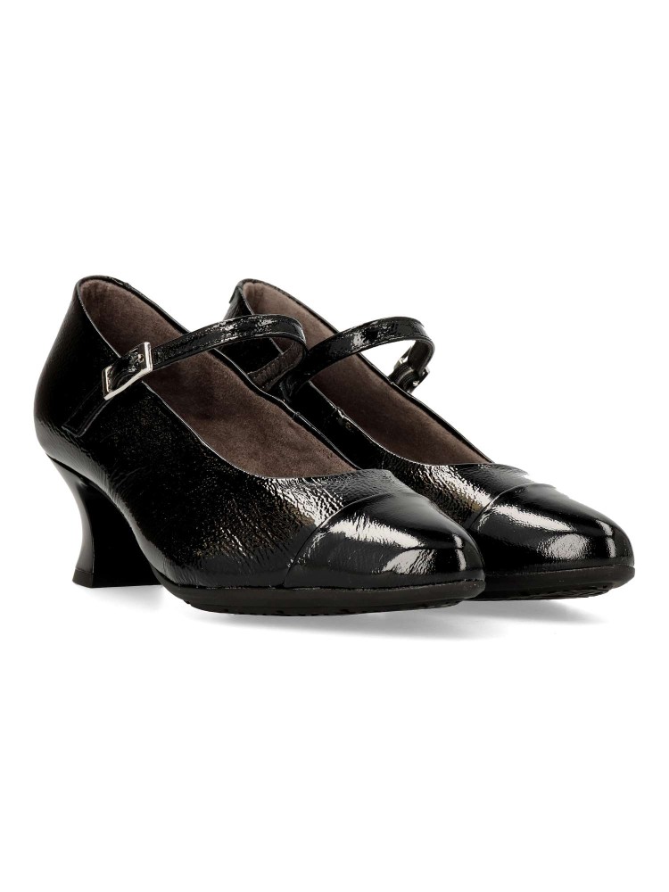 Salón tipo Mary Jane. Fabricado en piel, con suela de goma. Plantilla acolchada. Color negro con punta charol. Tacón de 5 cm. Combinan calidad, confort y bienestar. Ideal tanto para tu día a día, ocasiones especiales o llevarlos a la oficina.