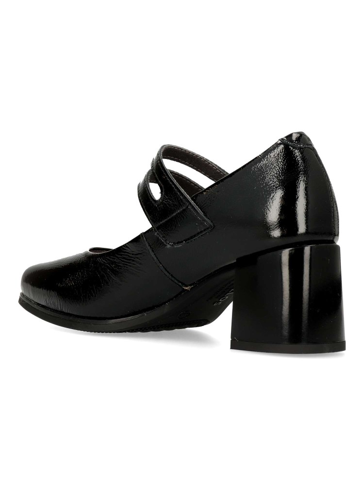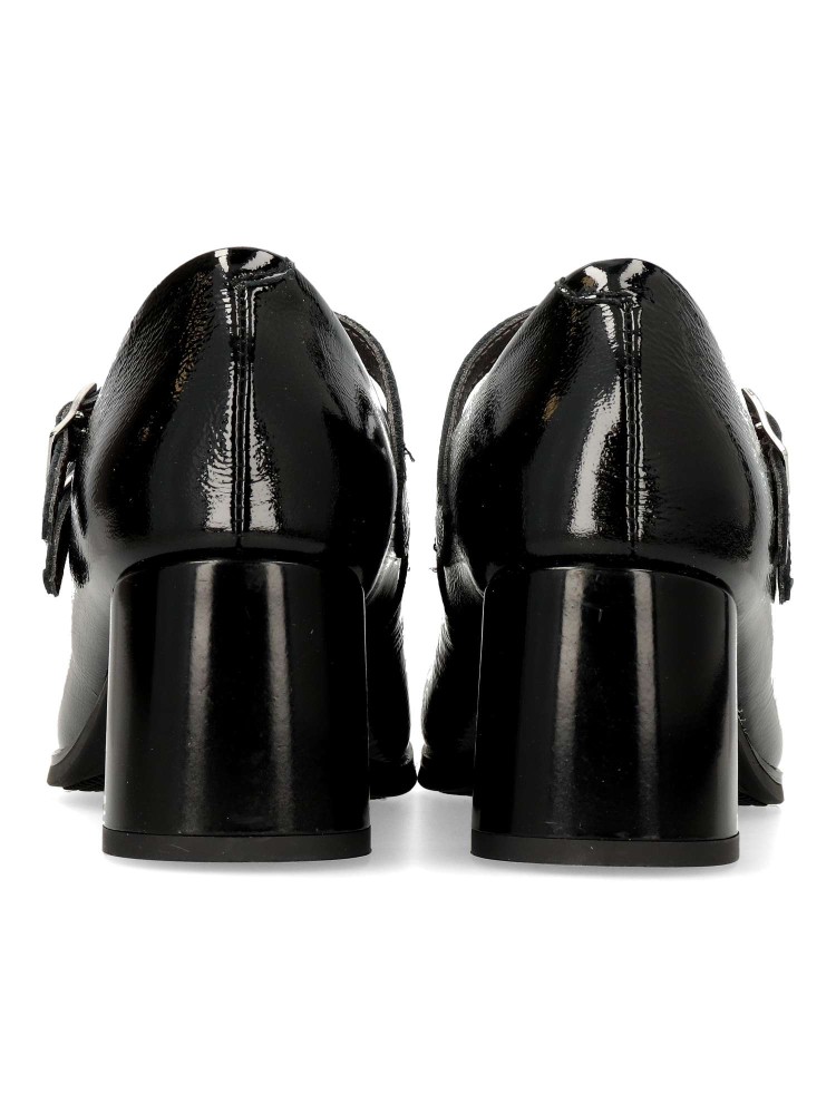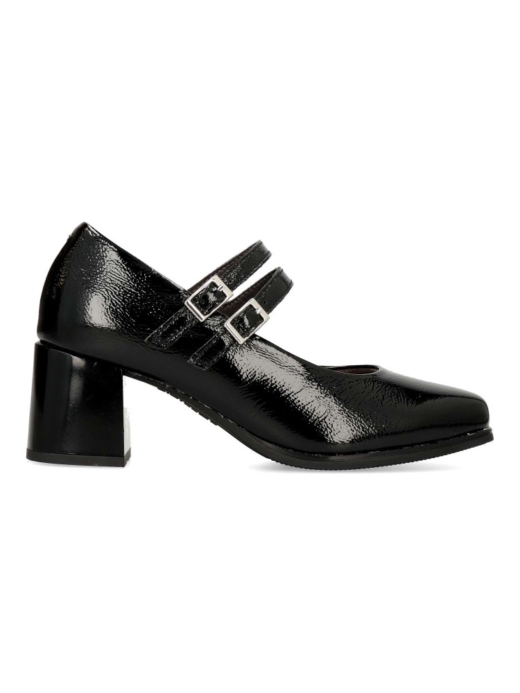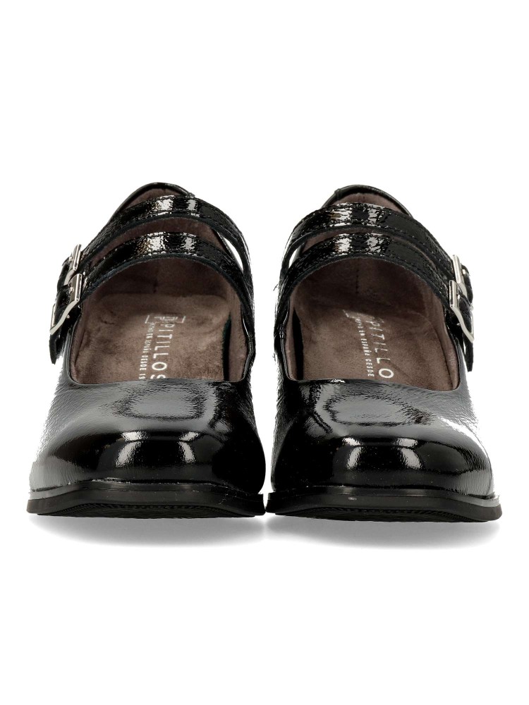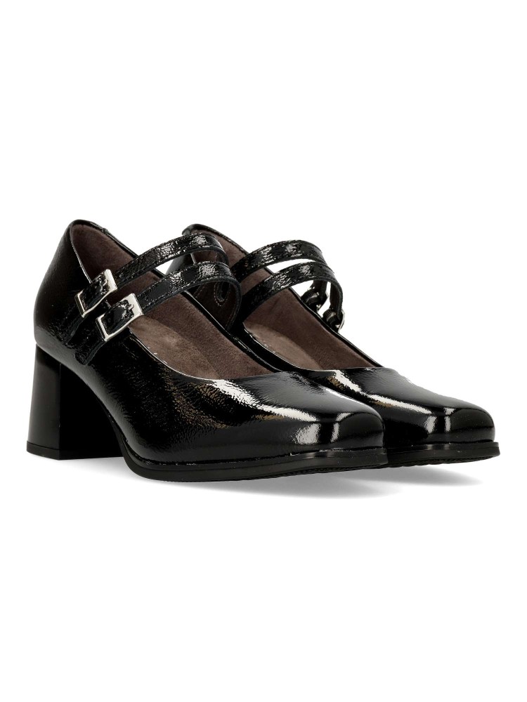 Zapato salón para mujer, de estilo Mary Jane. Diseñado en charol efecto arrugado de color negro. Plantilla acolchada y extraíble. Tiras al empeine, con cierre de hebillas. Tacón ancho de 6 cm. ¡Se convertirán en tus nuevos zapatos favoritos!.
