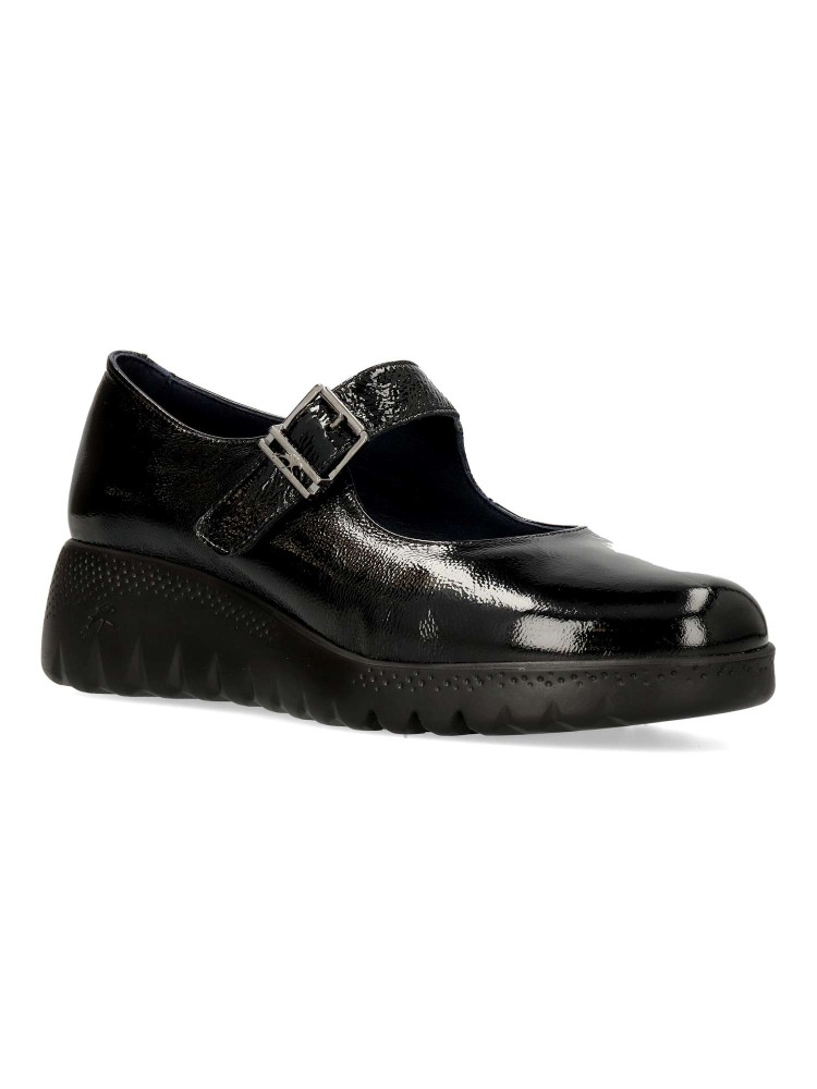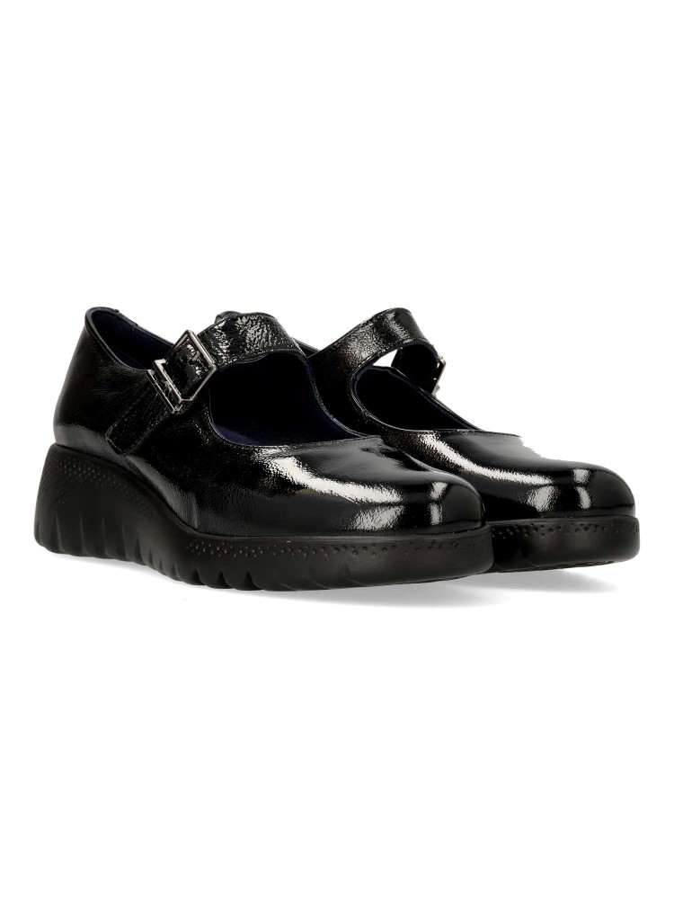 Zapato mercedita de mujer, fabricados en piel charol, con suela de goma super ligera con cuña de 4 cm. Plantilla acolchada y extraíble. Tira al empeine con cierre de hebilla. Añade un toque de frescura y sencillez a tu armario y comienza a combinar.