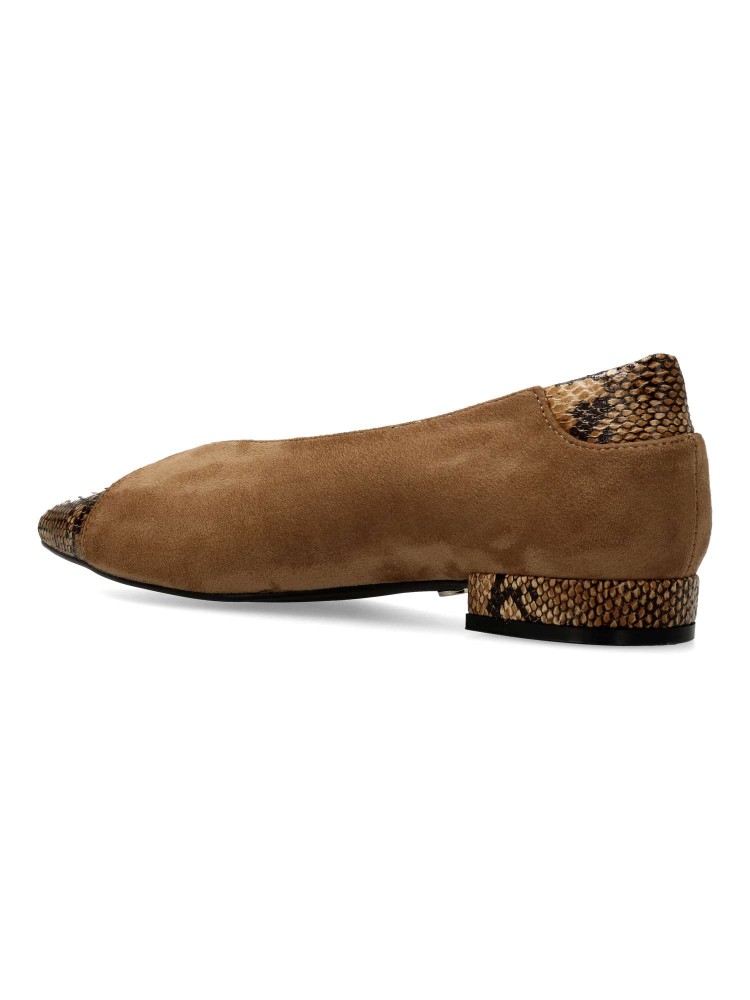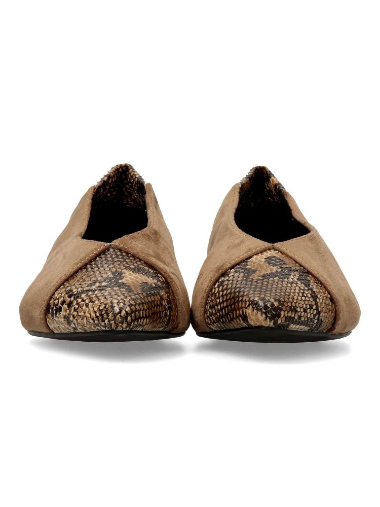 Manoletina plana de mujer. Sabrina con punta fina fabricada en sintético antelina con detalle estampado serpiente. Suela de goma. Planta acolchada. Una bailarina atemporal y muy versátil, que no puede faltar en tu fondo de armario.