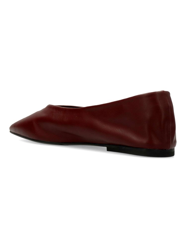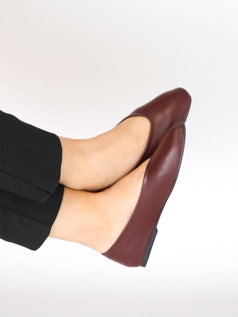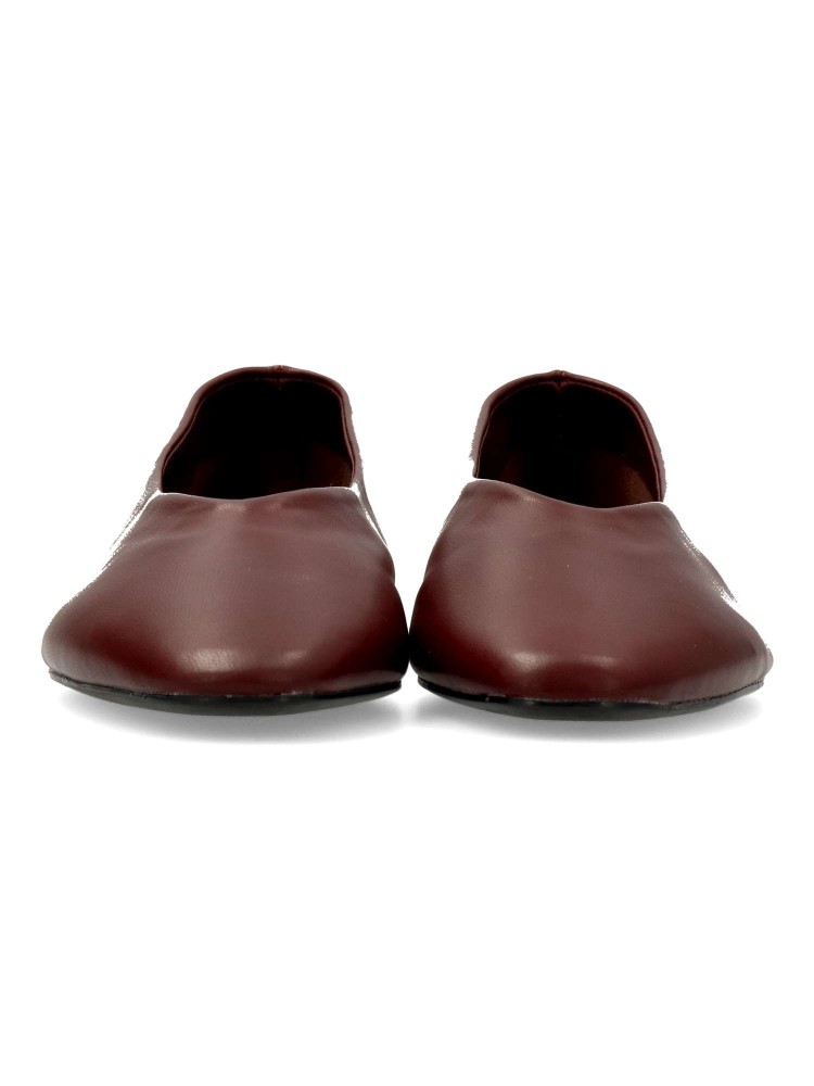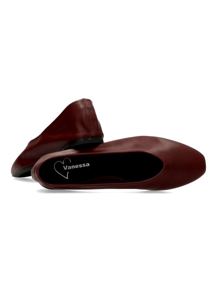 Zapato bailarina de mujer, plana y con punta fina. Sabrina cómoda, fabricada en piel sintética, con suela de goma flexible. Planta acolchada. Disponible en color burdeos. Una manoletina muy ponible y versátil, para conjuntar con todos tus outfits.