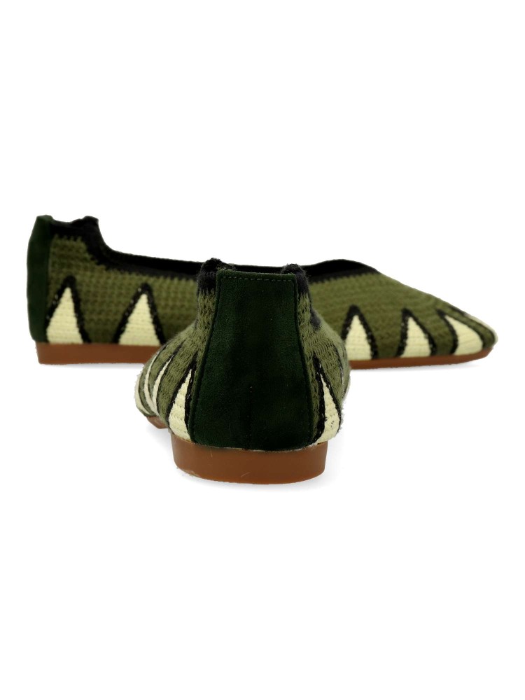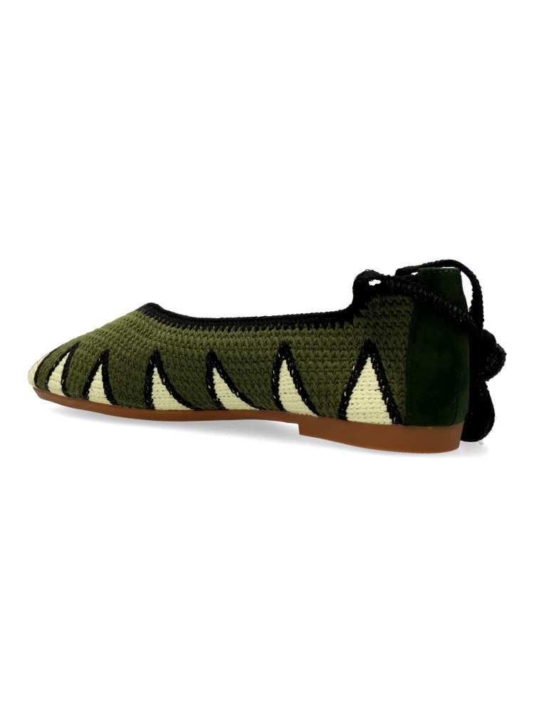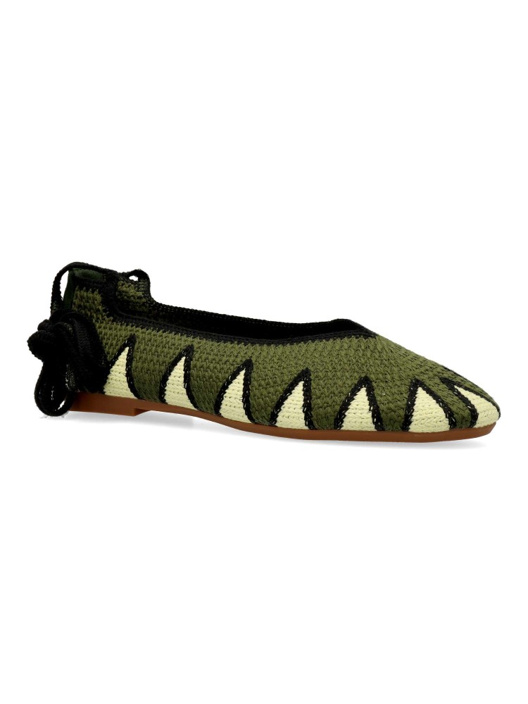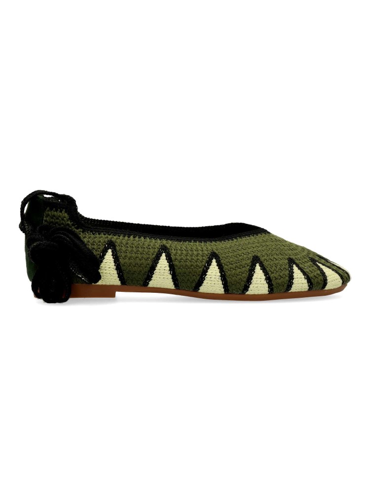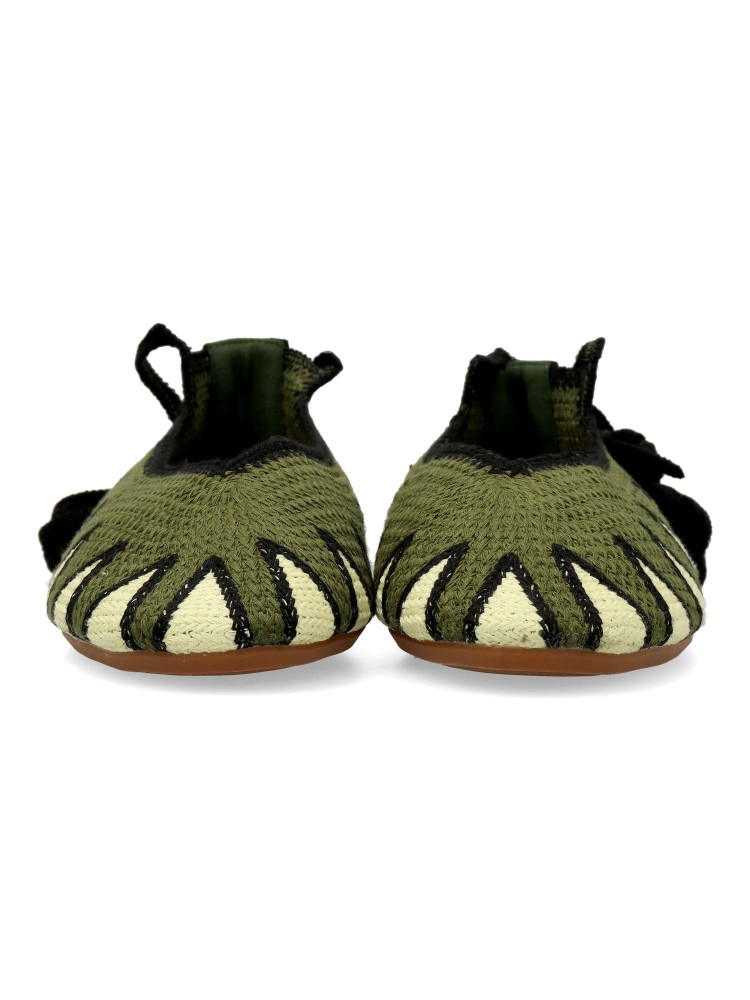 Zapato bailarina de crochet para mujer. Mercedita plana, fabricada en textil, con suela de goma flexible. Planta acolchada. Color verde. Diseño moderno y romántico, perfectas para el uso diario o para darle un toque especial a tu look de primavera.