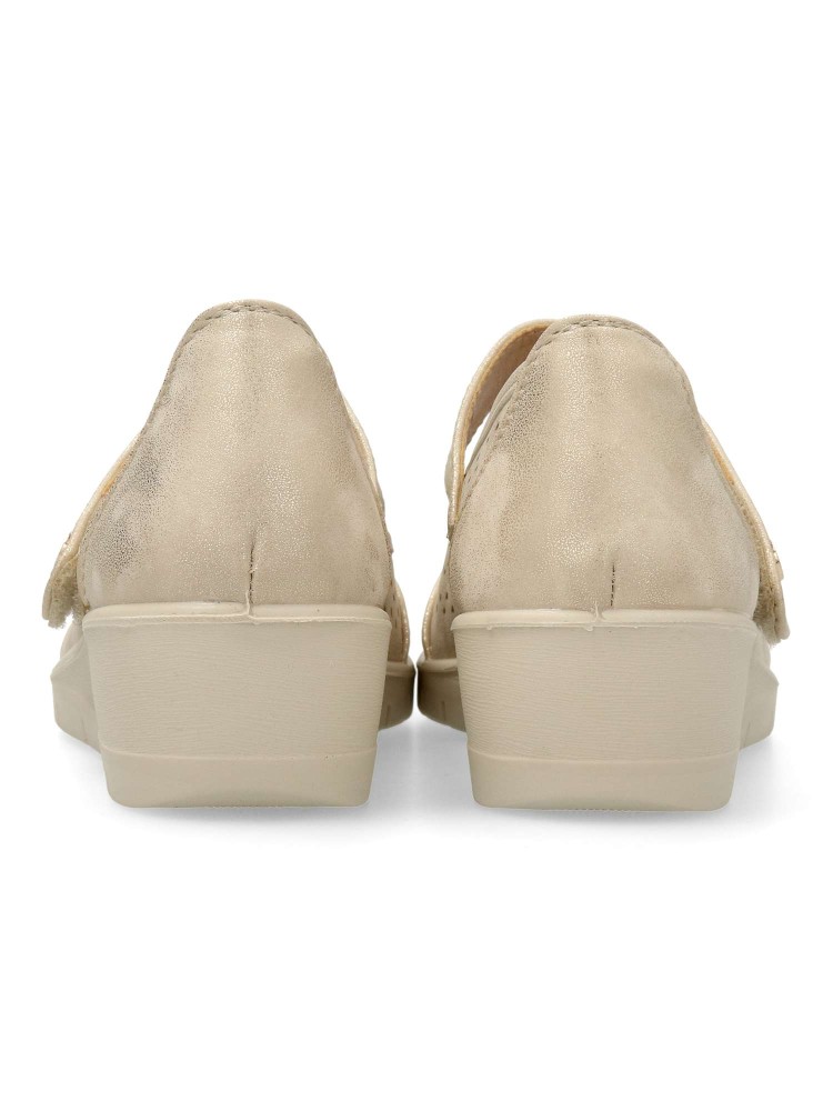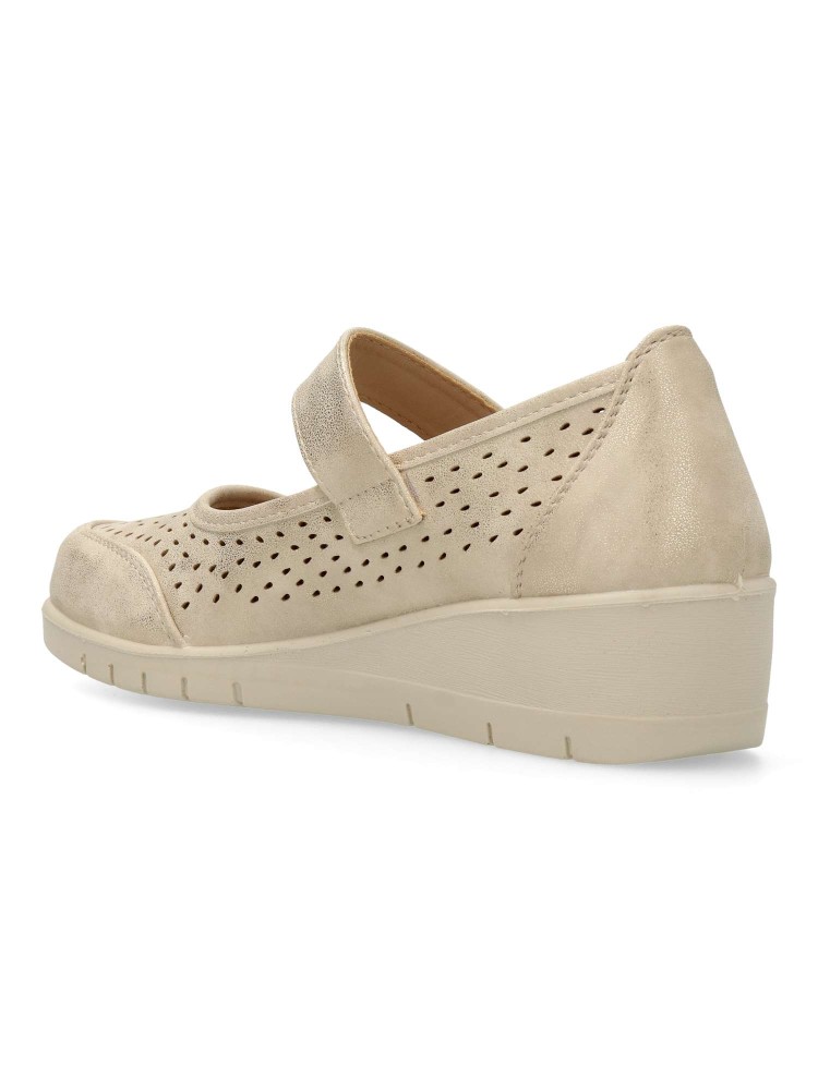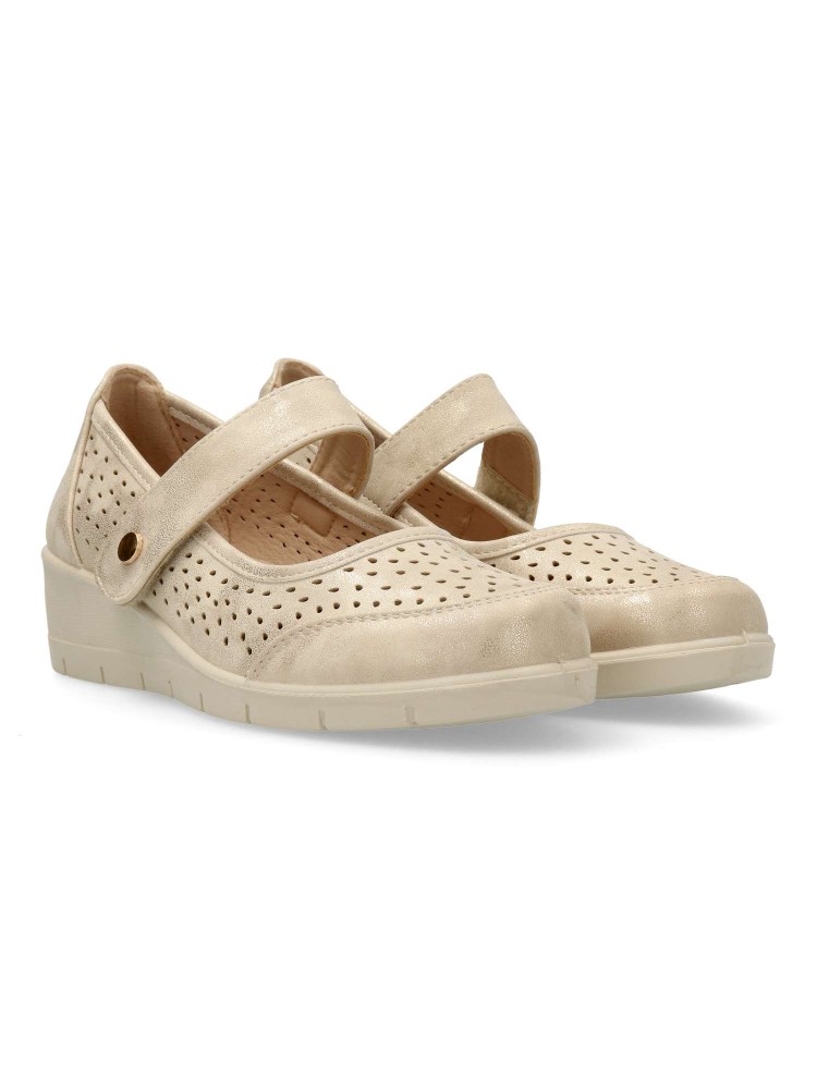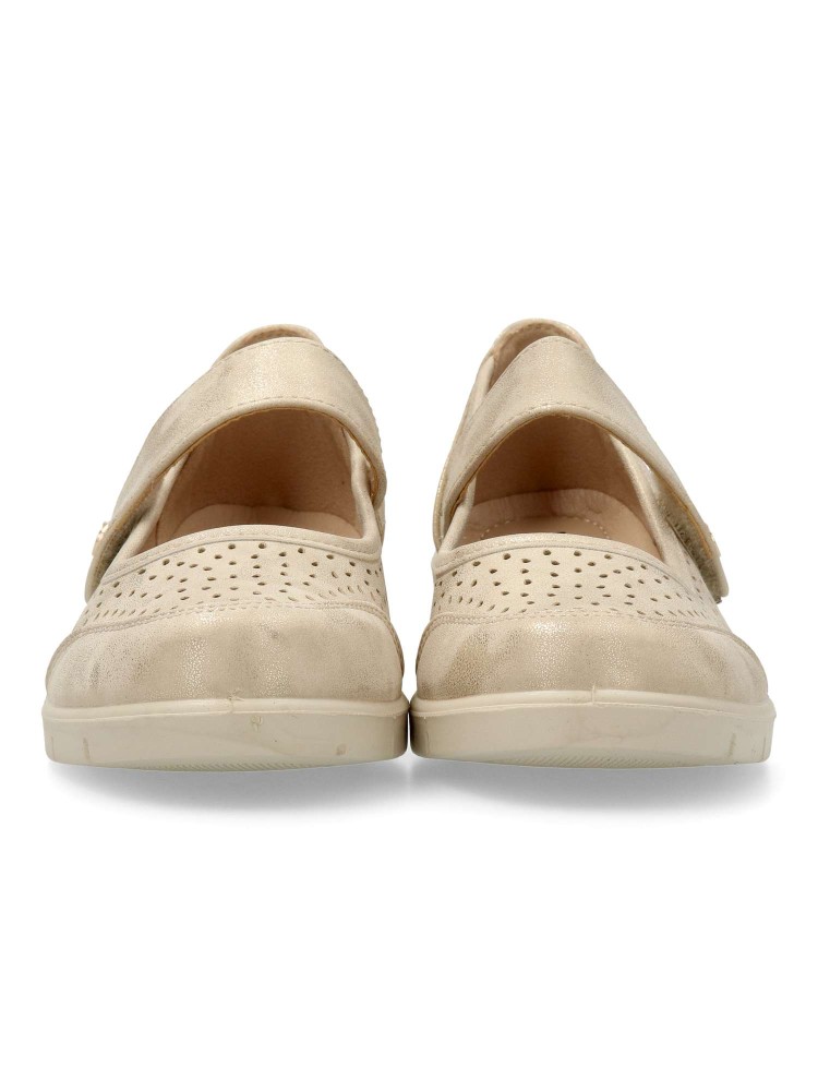 Zapato cómodo de mujer, con tira al empeine y cierre adherente. Zapato casual, fabricado en piel sintética troquelada, con suela de goma ligera. Plantilla acolchada. Color oro. Un modelo confortable, transpirable y flexible para tu día a día.