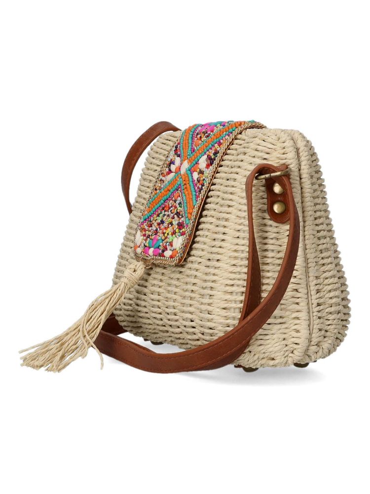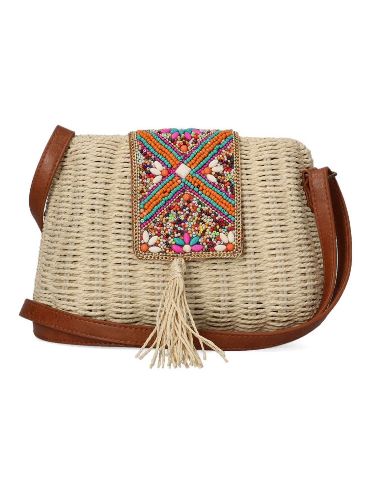 Bolso bandolera de mujer con solapa y cierre de clip. Modelo de rafia, con diseño étnico. Color beige. Bolsillo en interior. Asa bandolera regulable. Medidas: 24 x 17 x 11 cm. ( largo, alto, ancho ).