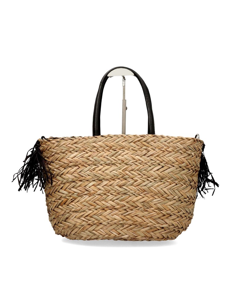 Bolso capazo rafia de mujer, con dos asas. Detalle de flecos en color negro. Medidas aproximadas: 39cm (largo) x 16cm (ancho) x 26cm (alto)