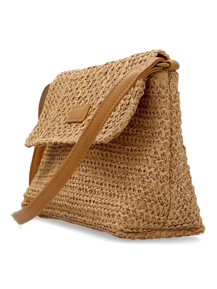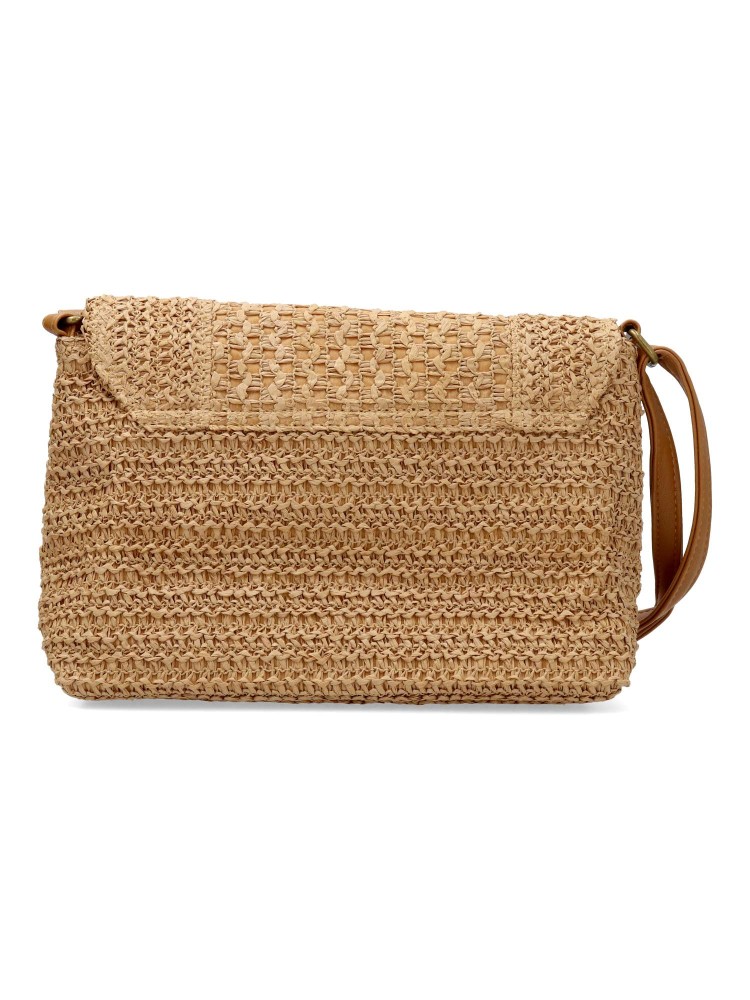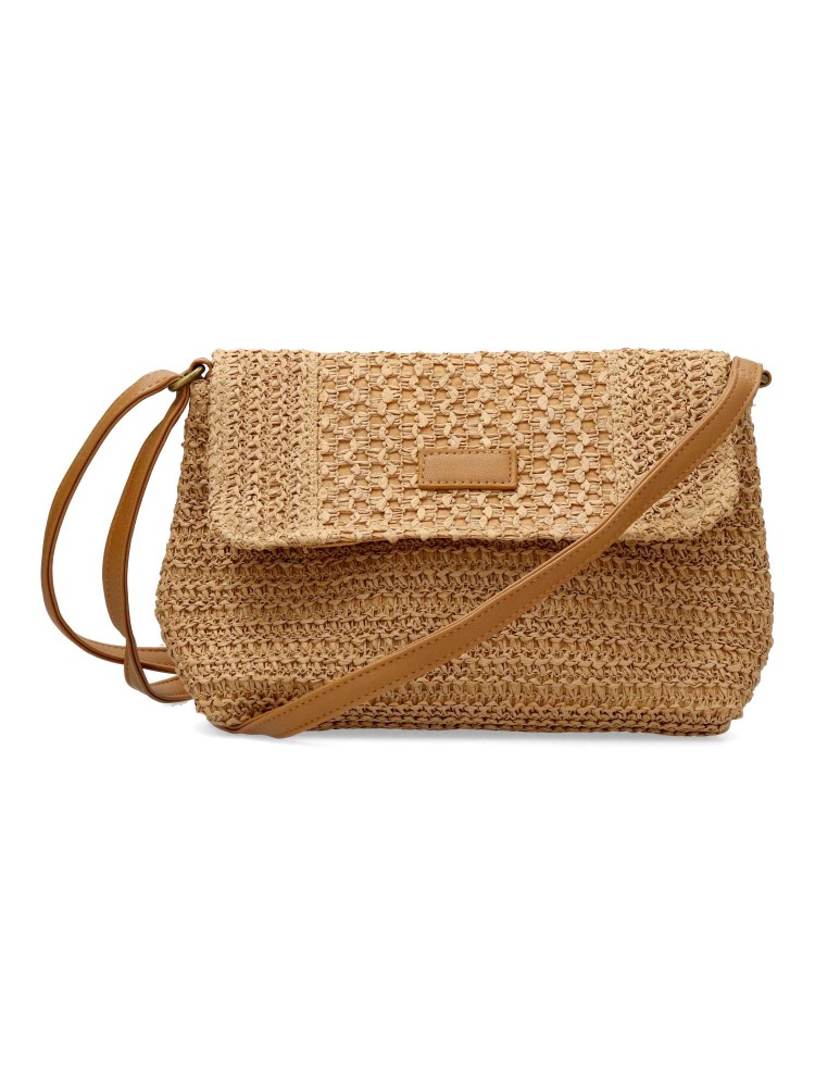 Bolso bandolera rafia color tostado. Modelo con solapa y cierre de clip. Medidas aproximadas: 29cm (largo) x 3cm (ancho) x 17cm (alto)
