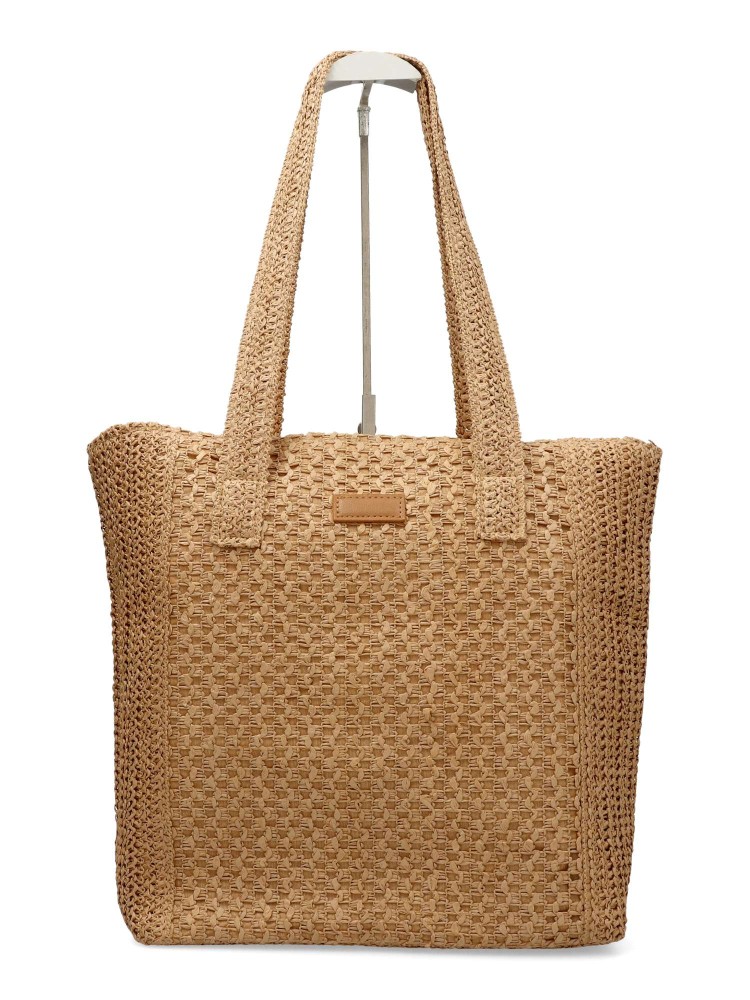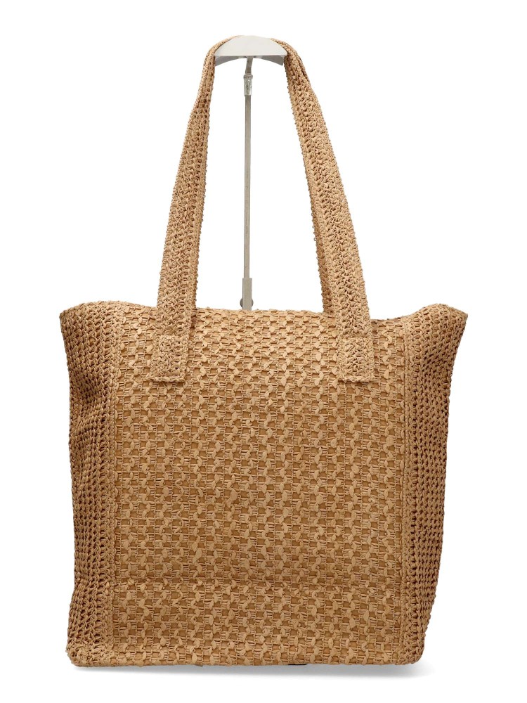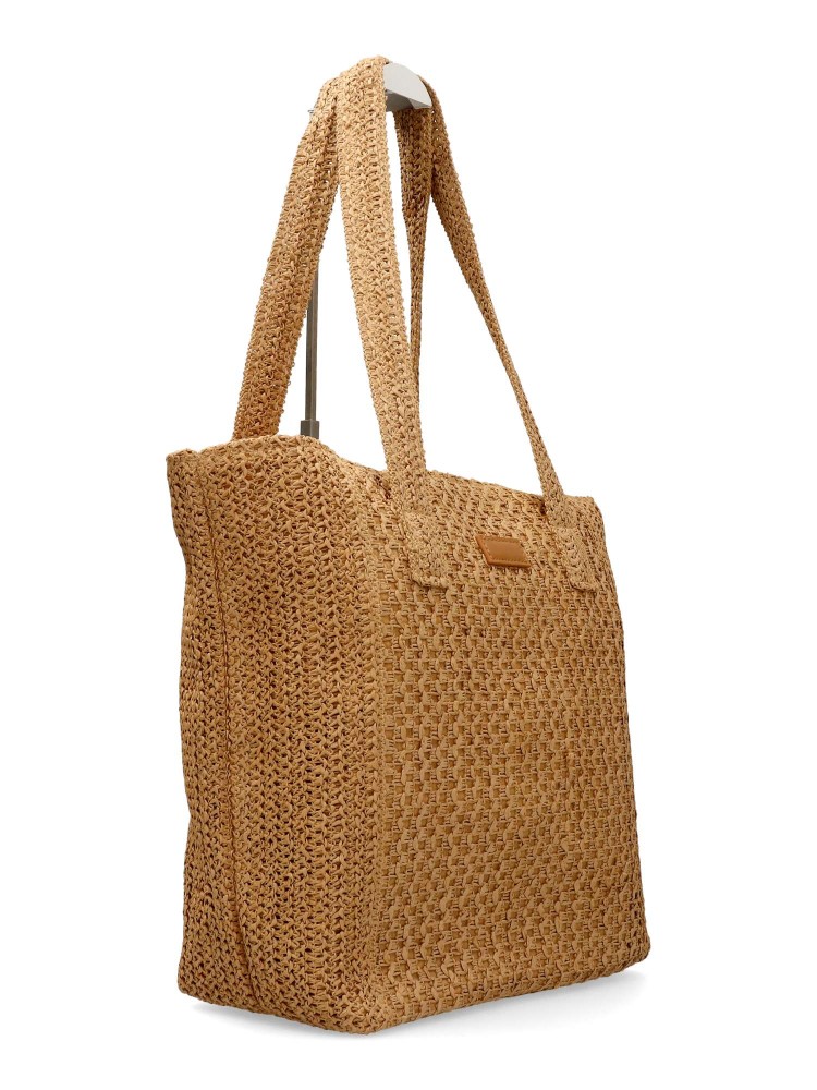 Bolso de hombro rafia color tostado. Cierre de cremallera. Medidas aproximadas: 44cm (largo) x 15cm (ancho) x 33,5cm (alto).