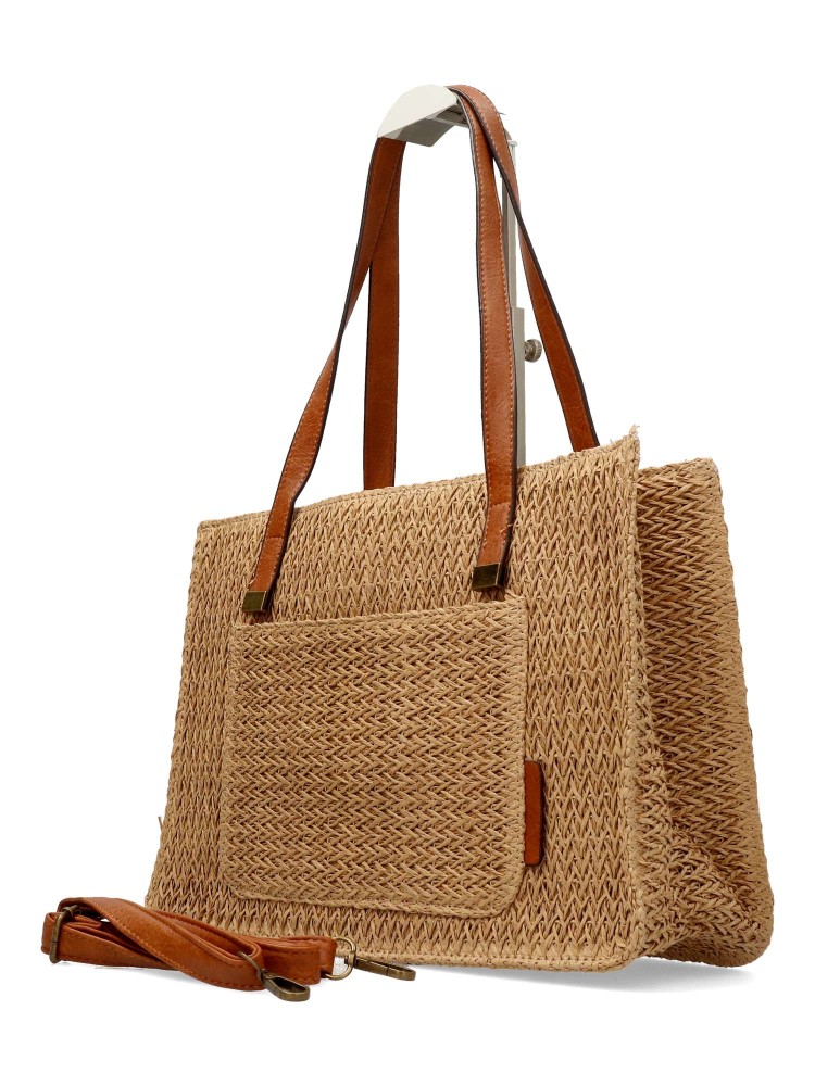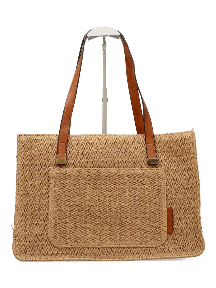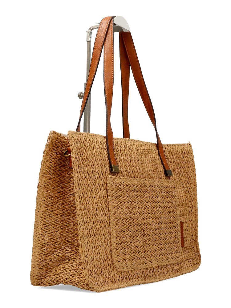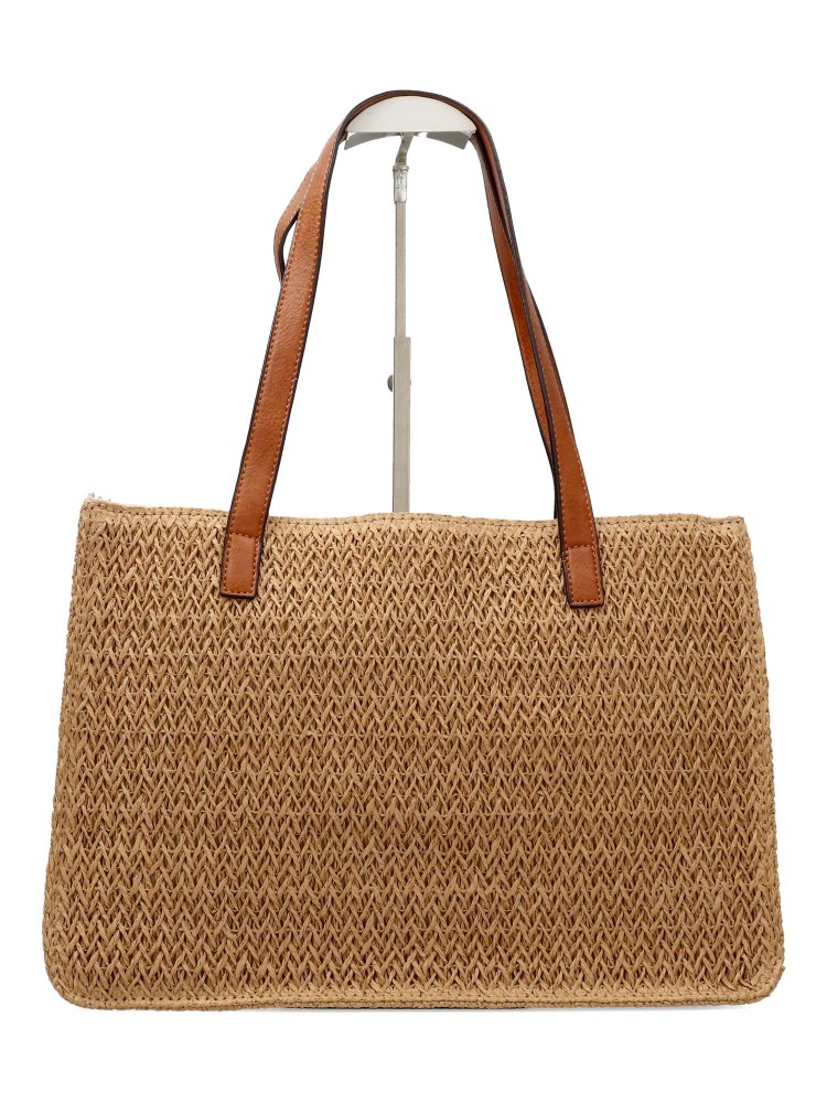 Bolso de hombro rafia color tostado. Cierre de cremallera. Asa bandoera. Medidas aproximadas: 38cm (largo) x 14cm (ancho) x 25cm (alto).