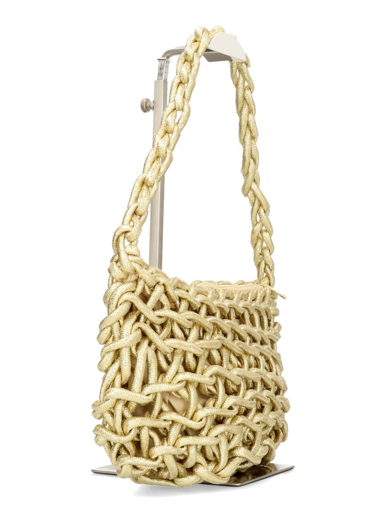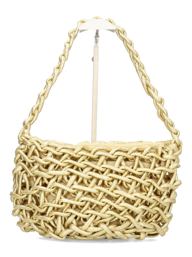 Bolso de hombro para mujer. Fabricado en textil cuerda trenzada metalizada. Color oro. Cierre de cremallera. Medidas aproximadas: 30cm (largo) x 4cm (ancho) x 18cm (alto).