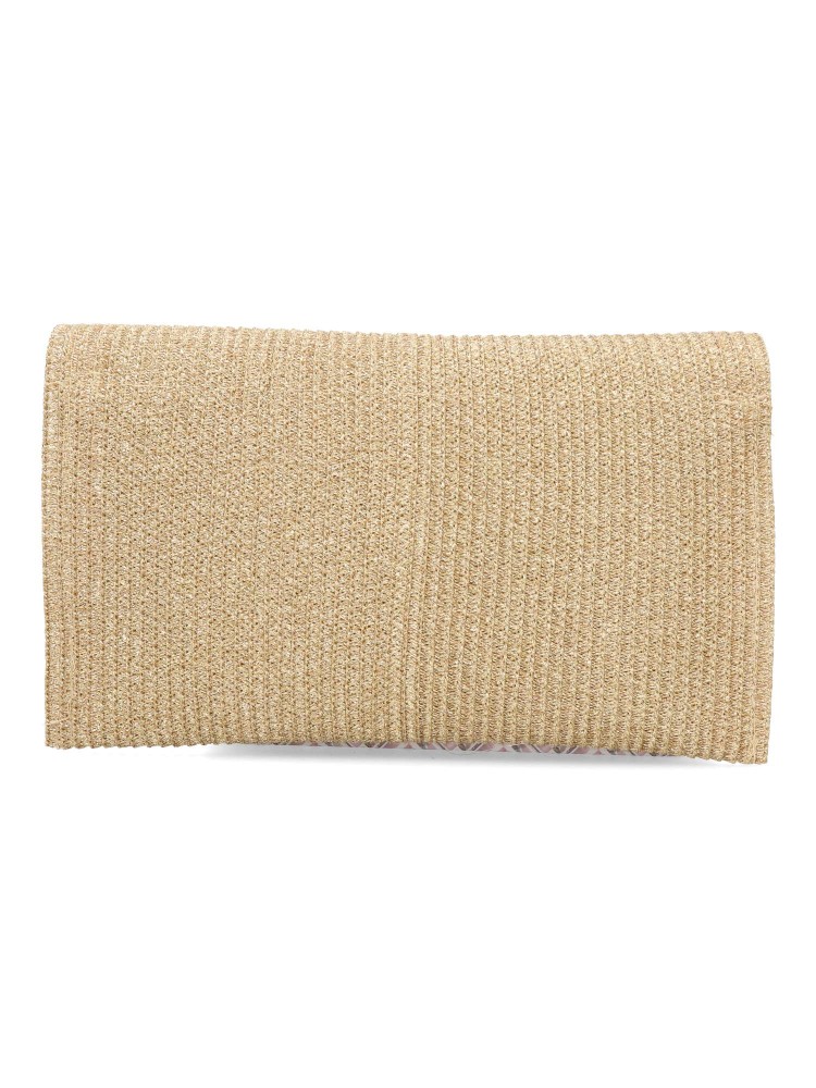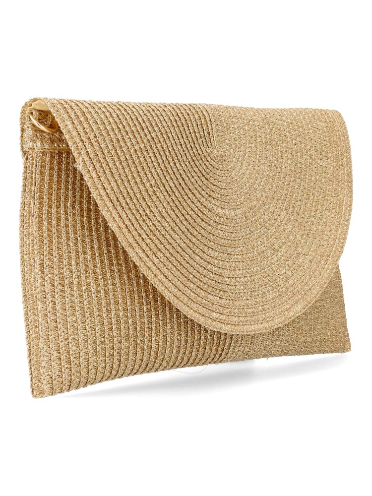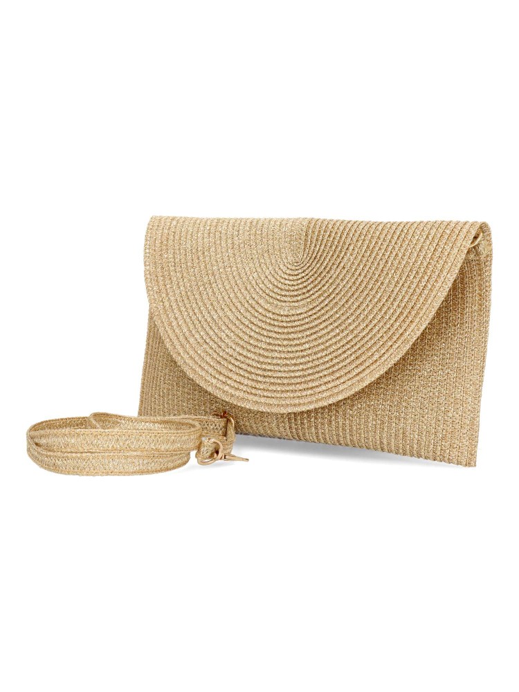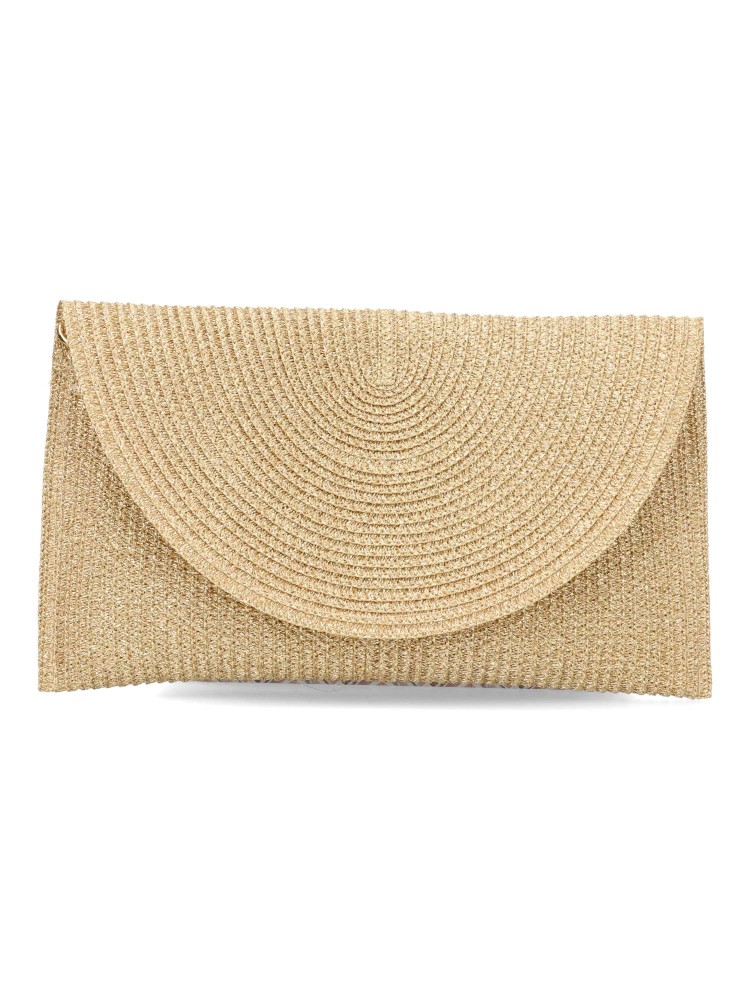 Bolso cartera de fiesta para mujer. Fabricado en textil metalizado. Color oro. Modelo con solapa y cierre de clip. Dispone de asa bandolera. Medidas aproximadas: 30cm (largo) x 16cm (alto).