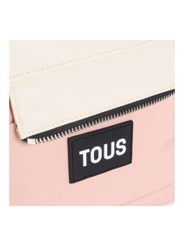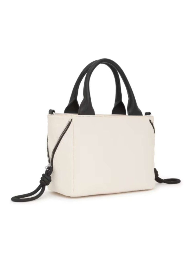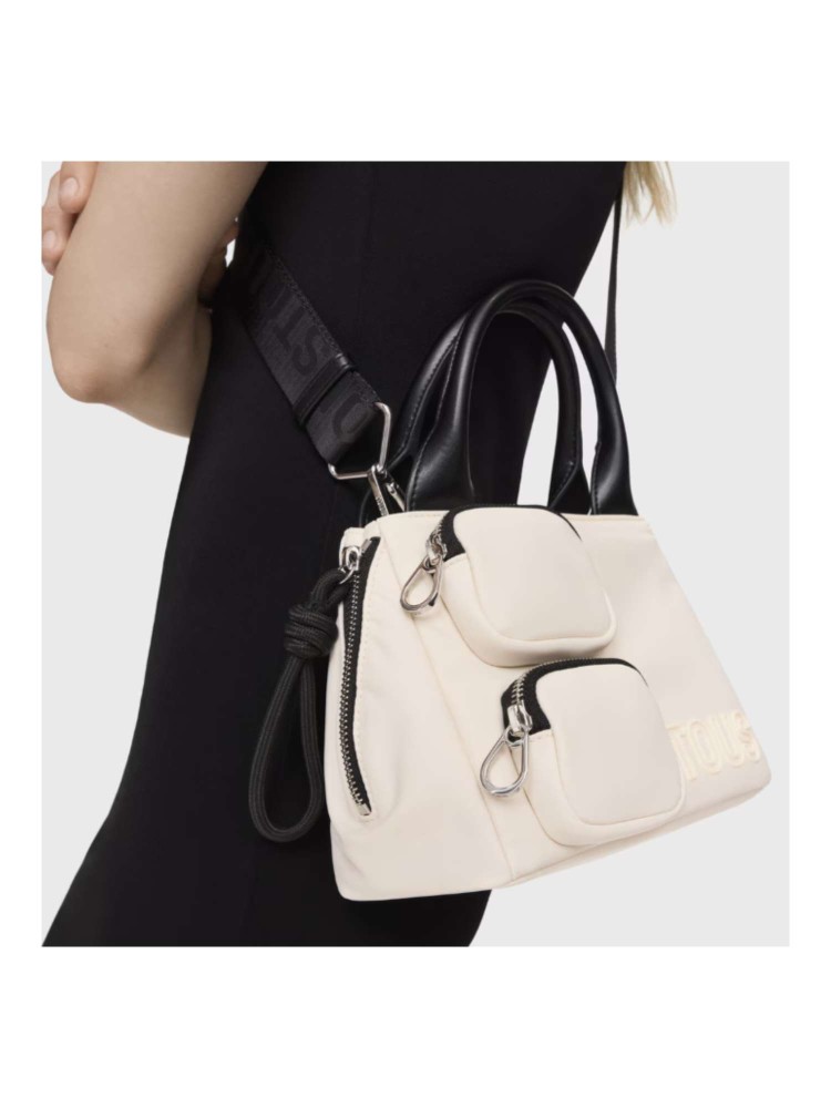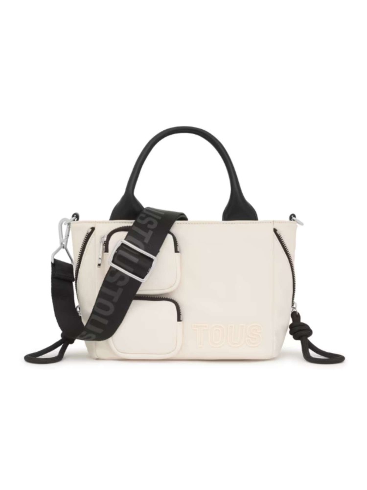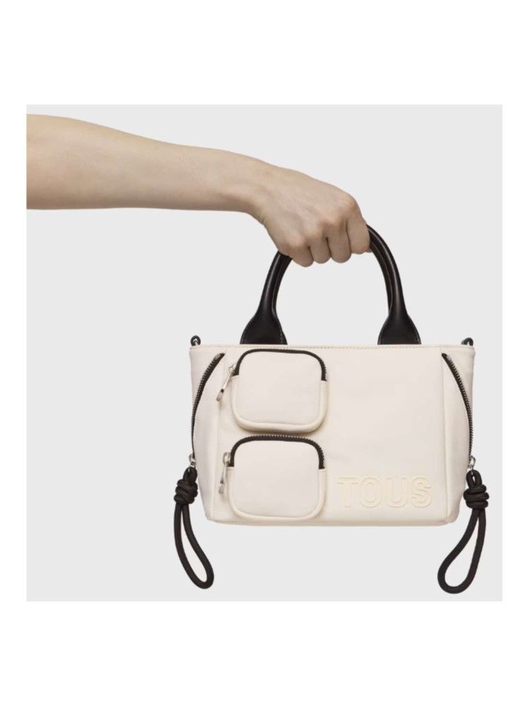Shopper pequeño de poliéster reciclado con detalles de poliuretano en color beige. Tres bolsillos exteriores. Asas fijas de hombro y asa bandolera ajustable. Medidas (alto x ancho x fondo): 16 x 27 x 12,5 cm.