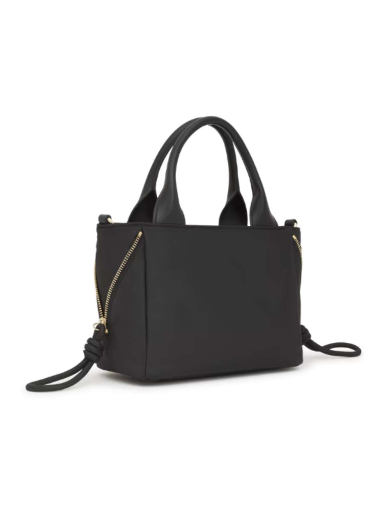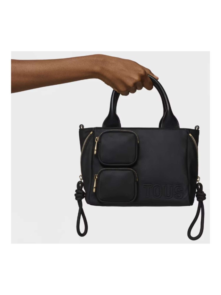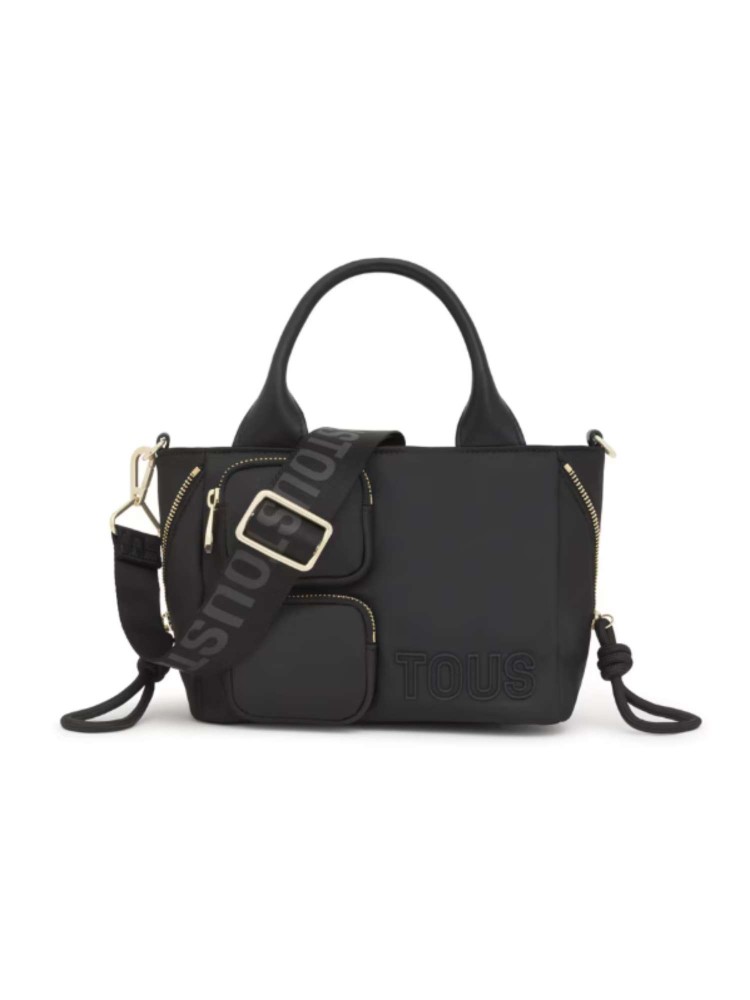 Shopper pequeño de poliéster reciclado con detalles de poliuretano en color negro. Tres bolsillos exteriores. Asas fijas de hombro y asa bandolera ajustable. Medidas (alto x ancho x fondo): 16 x 27 x 12,5 cm.