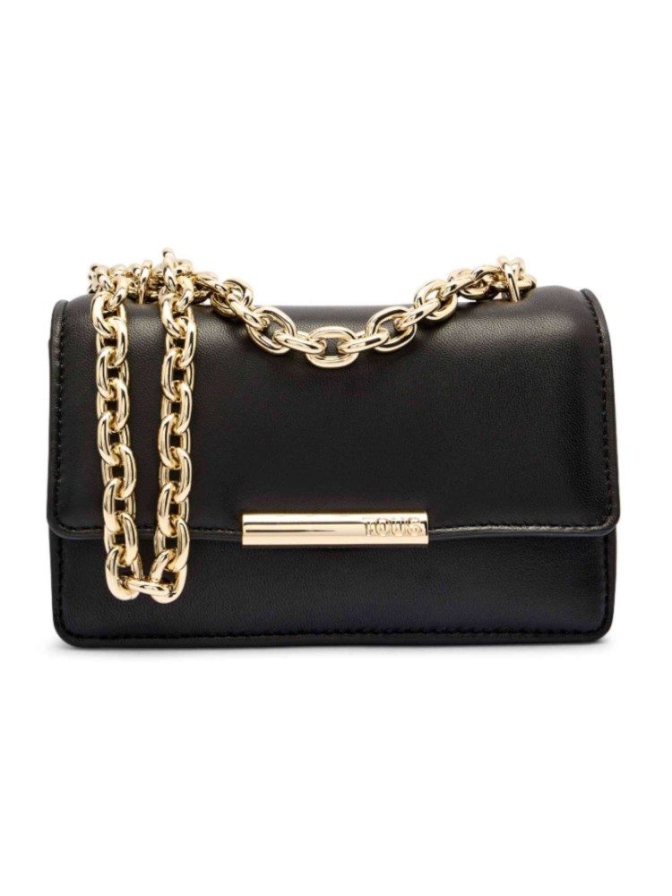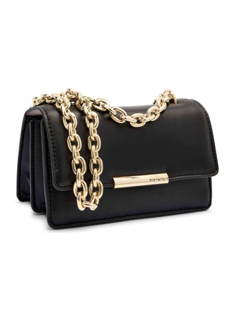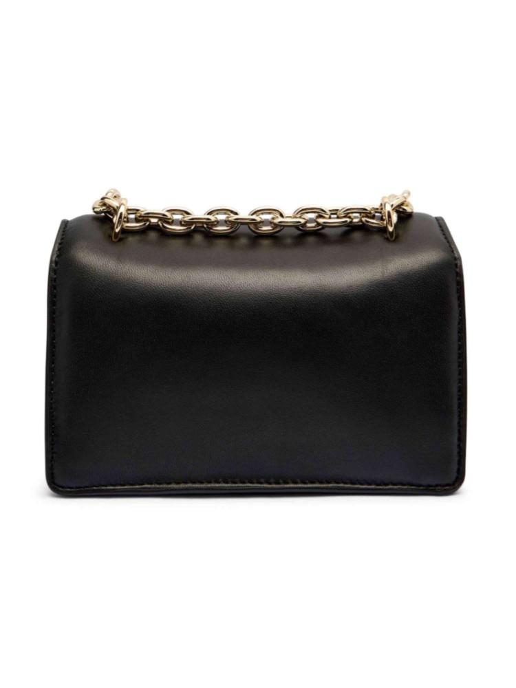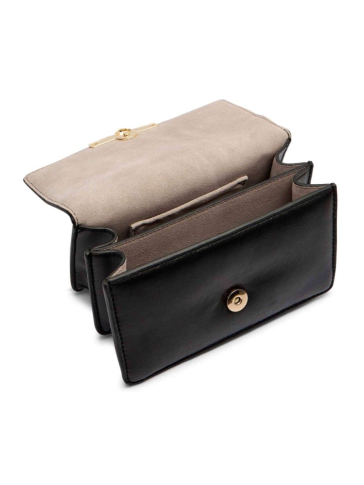 Bolso bandolera pequeño de piel ovina con certificación LWG en color negro. Cierre de solapa. Bolsillo interior abierto. Dos compartimentos en el interior. Asa bandolera ajustable a asa de hombro. Medidas (alto x ancho x fondo): 12 x 20 x 10 cm.