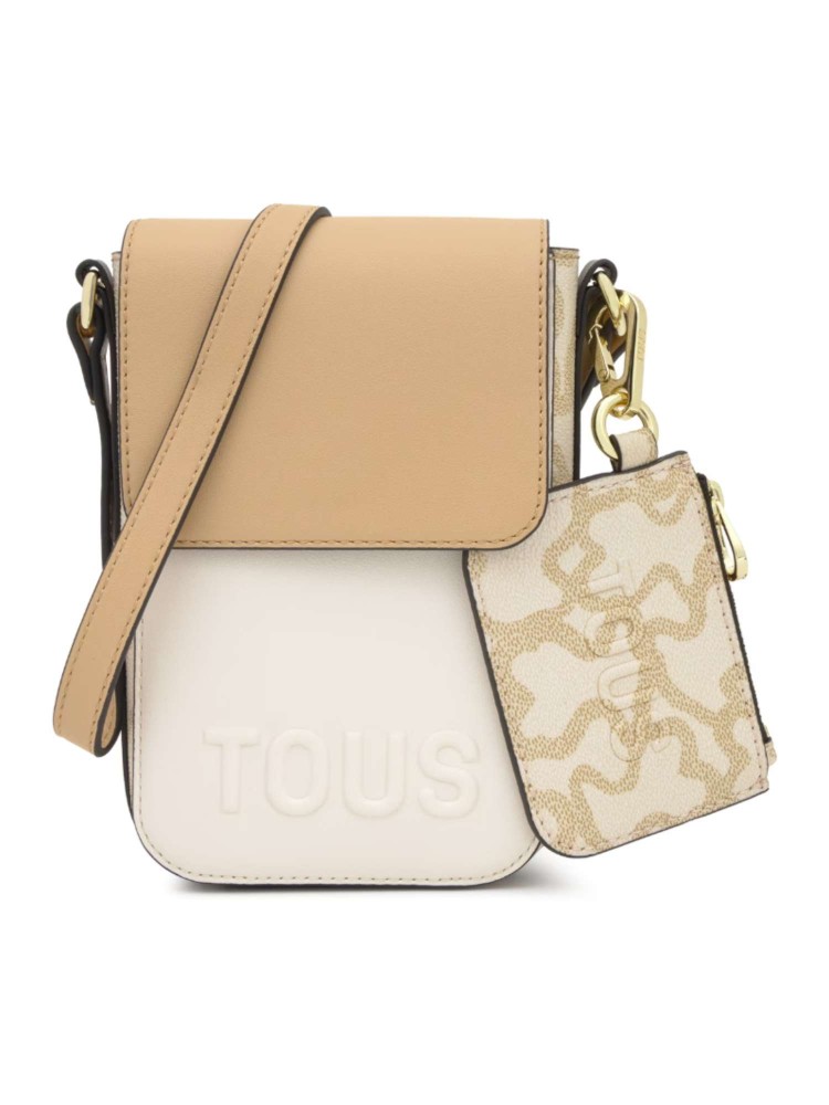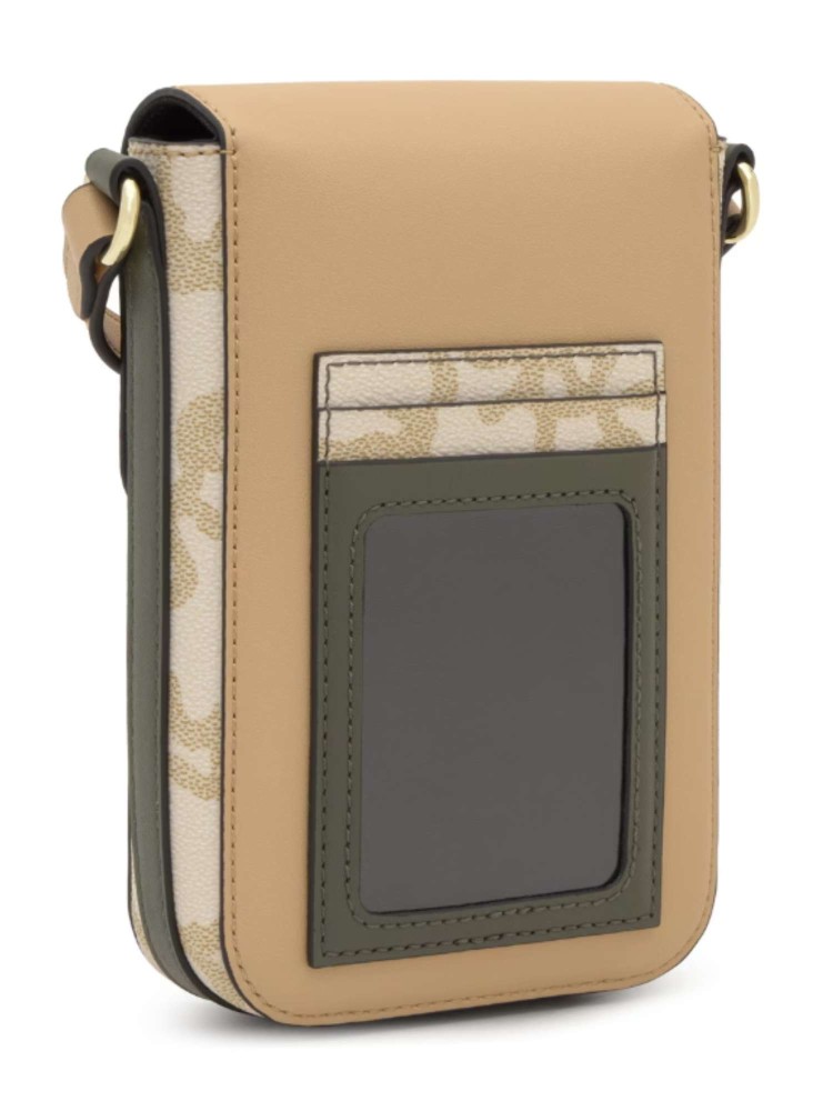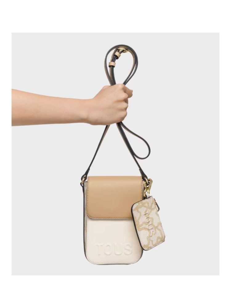 Funda de móvil colgante color arena Kaos Icon. Cierre de botón magnético. Tiene dos ranuras para tarjetas, una de ellas transparente. Asa bandolera ajustable. Medidas (alto x ancho x fondo): 19 x 13,5 x 4 cm.