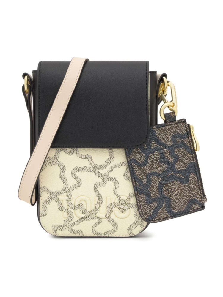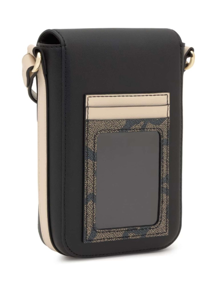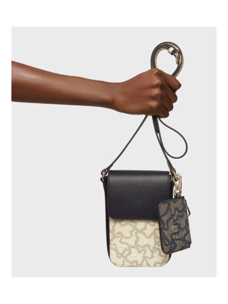 Funda de móvil colgante negra Kaos Icon. Cierre de botón magnético. Tiene dos ranuras para tarjetas, una de ellas transparente. Asa bandolera ajustable. Medidas (alto x ancho x fondo): 19 x 13,5 x 4 cm.