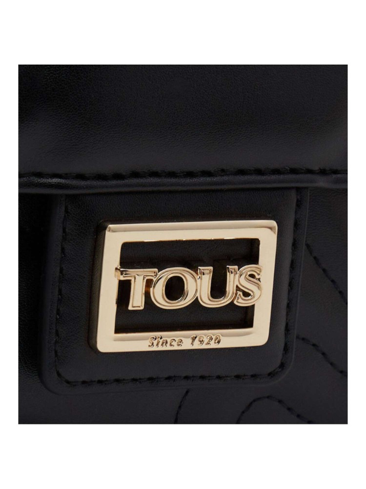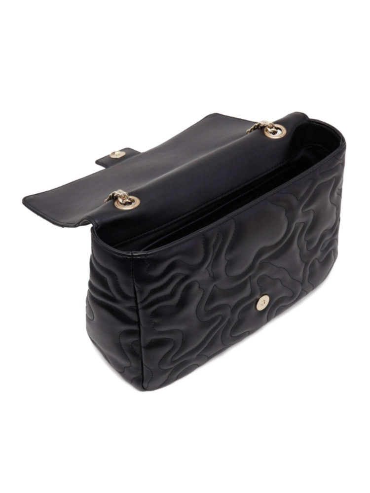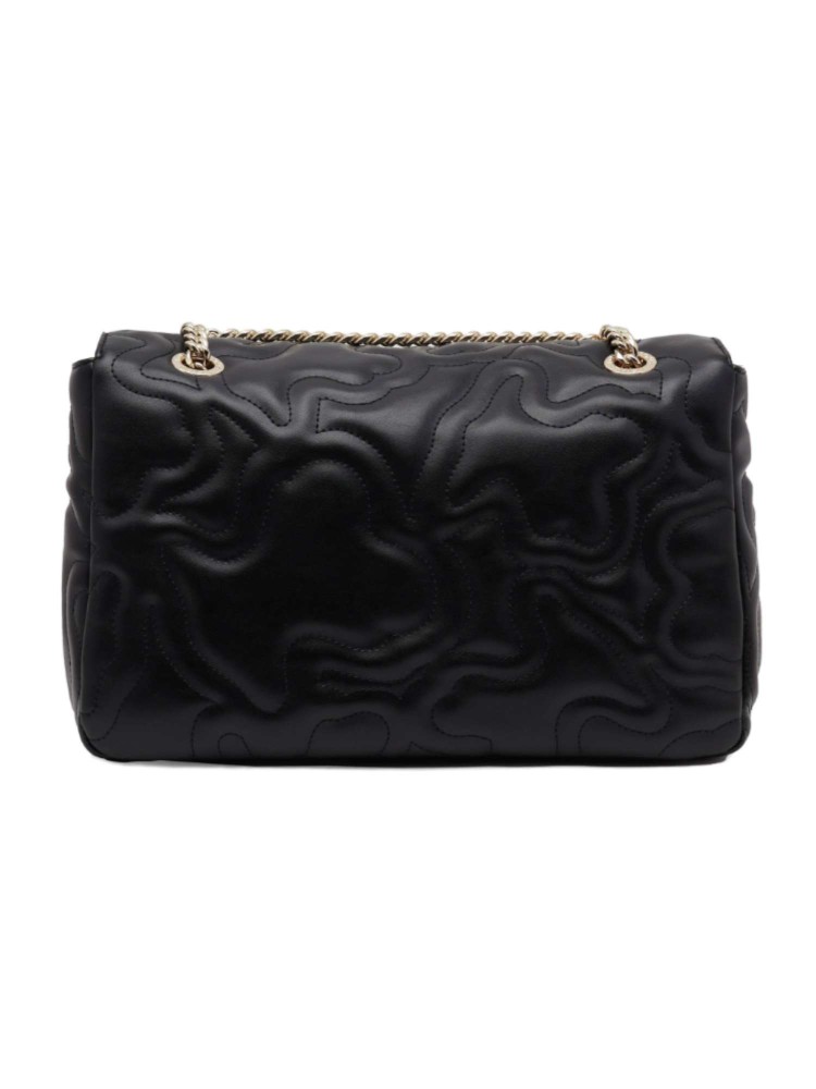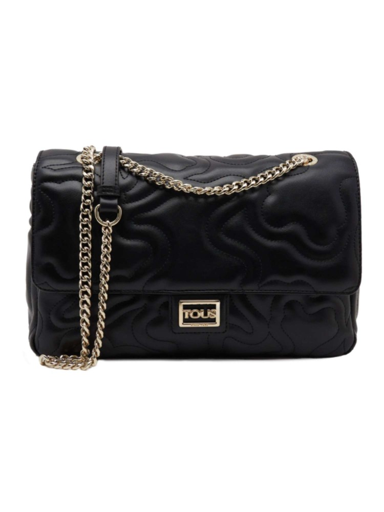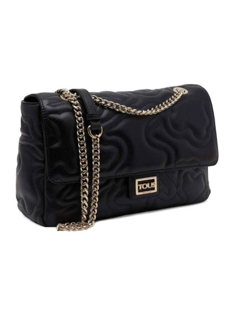 Bolso bandolera mediana con solapa, de poliuretano acolchado en forma de osos con acabado efecto piel en color negro. Correa larga de bandolera tipo cadena ajustable. Cierre con botón magnético. Bolsillo interior con cremallera. Medidas: 12 x 32 x 21 cm.